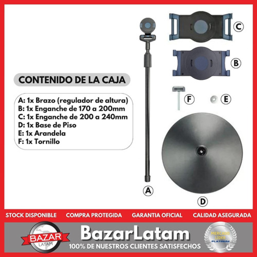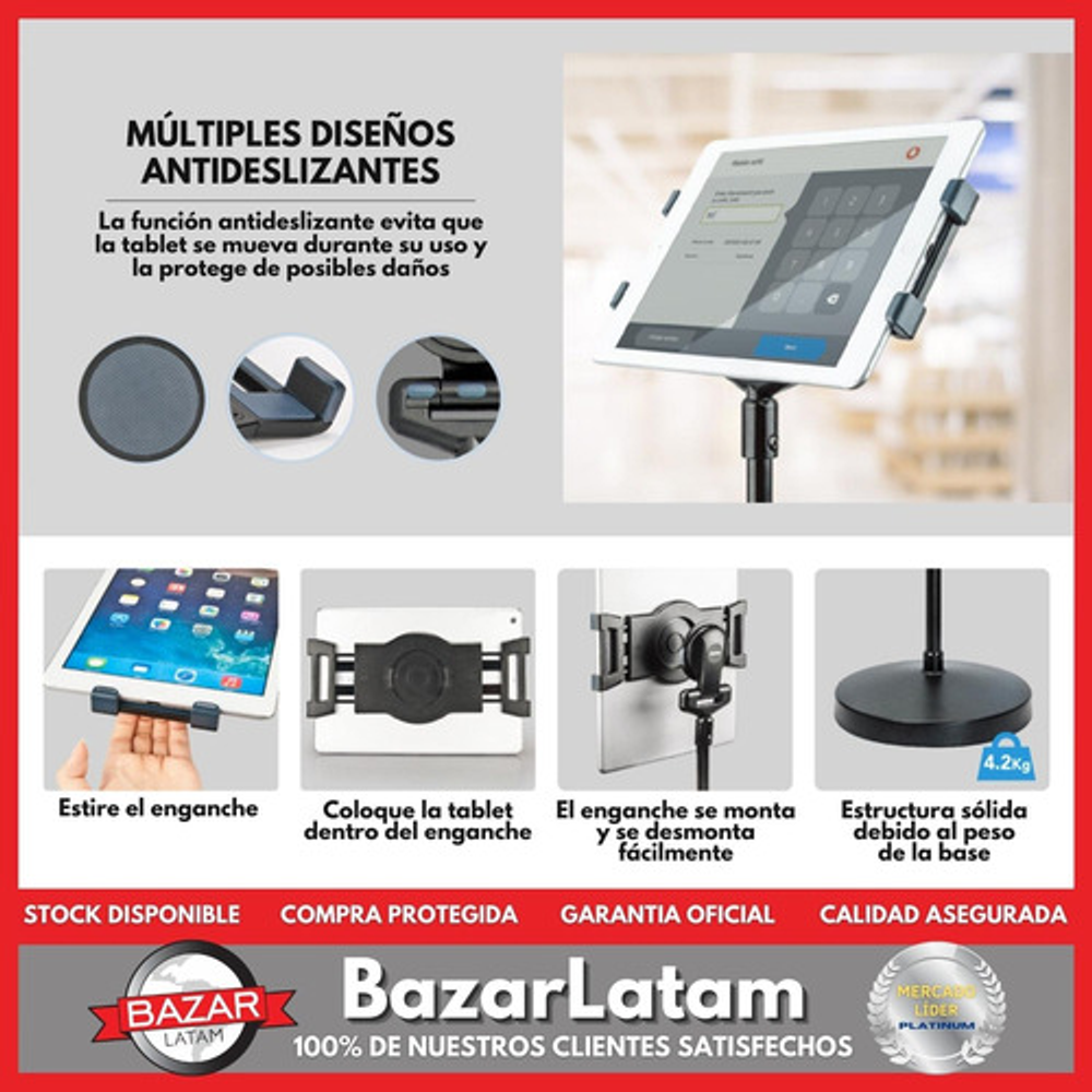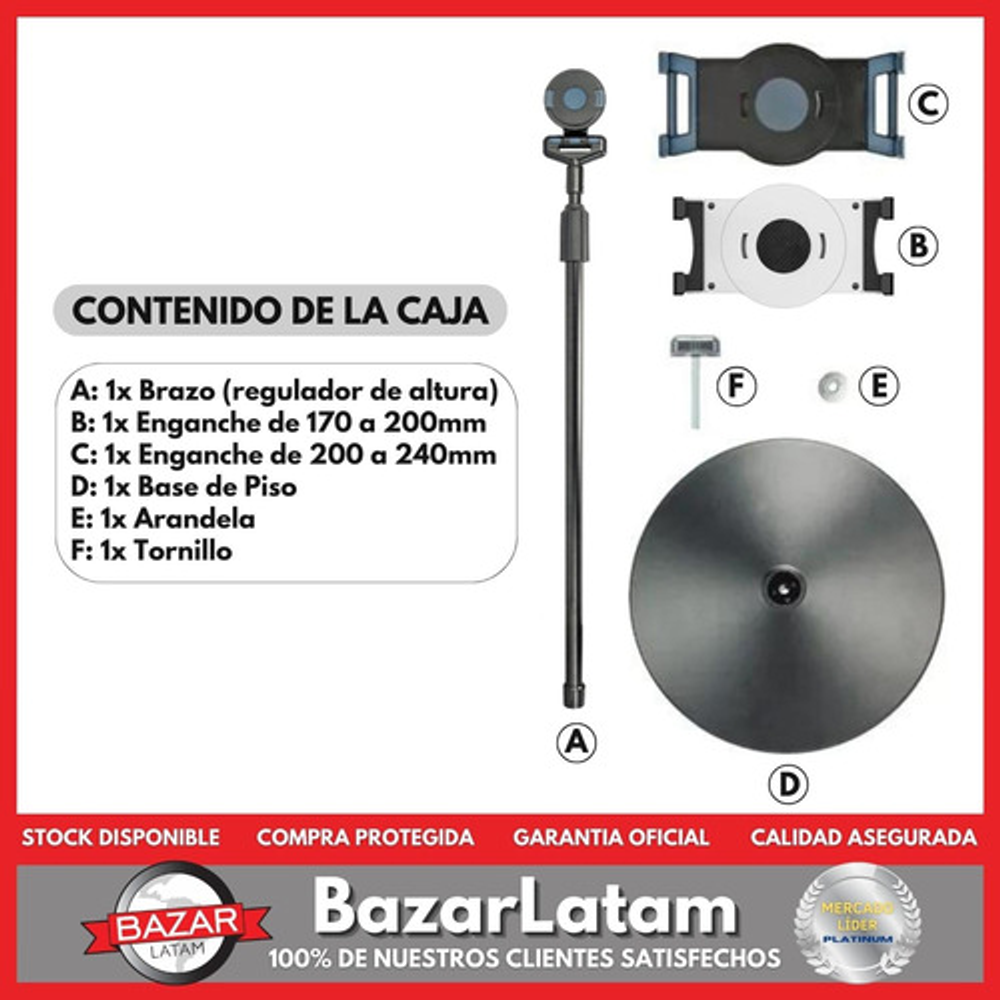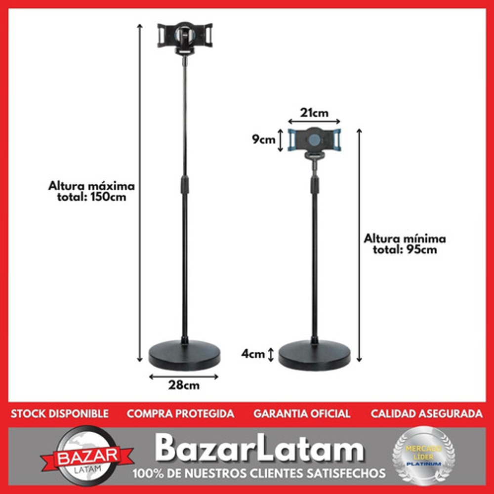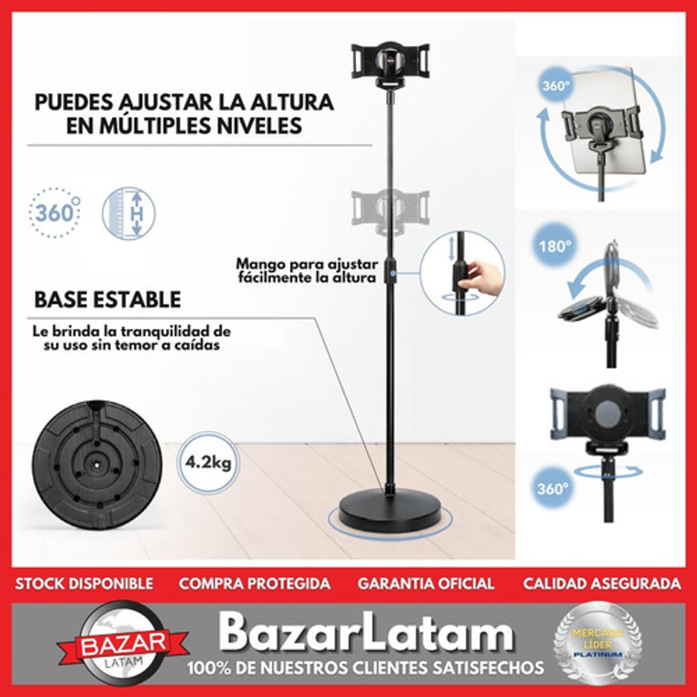 • Compatibilidad Versátil: Diseñado para iPads y tablets que en uno de sus lados mida entre 17 cm y 24 cm. • Enganche con Superficie Antideslizante: Evita que la tablet se mueva durante su uso y la protege de posibles daños • Altura Personalizada: Ajusta la altura de 95 cm a 150 cm para una visualización cómoda en cualquier situación. • Ajuste de Ángulo: Gira 360º e inclina 180º para encontrar el ángulo de visión perfecto. • Montaje Sencillo: Monta y desmonta fácilmente sin necesidad de herramientas. • Para Diversos Entornos: Ideal para oficinas y uso doméstico, se adapta a cualquier lugar donde necesites trabajar o disfrutar de tu tablet.