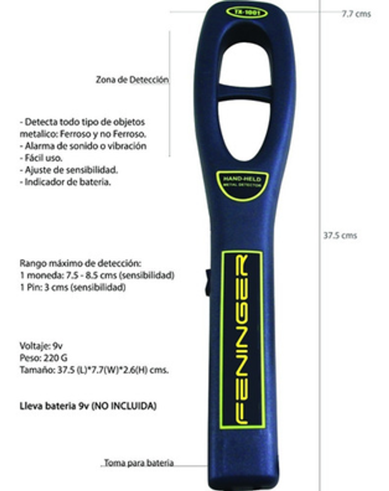 El TX-1001 Super Hand Held Detector es una herramienta de fácil uso, capaz de detectar objetos metalicos ocultos, incluido armas de fuego, cuchillos pequeños, joyería, o componentes electrónicos que lleven pasajeros. Es un detector duradero y refinado, equipado con un ligero peso de 220 grs. para la conveniencia del usuario.