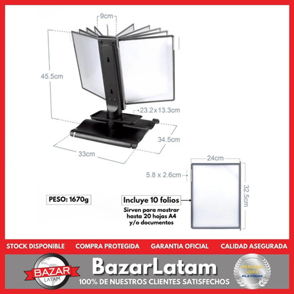 CONTENIDO DEL PRODUCTO: 1x Base Portapapeles Antideslizante 1x Base Giratoria 1x Mini Bandeja Portapapeles 1x Cuerpo Porta-Folios 2x Tornillos Philips 3x15mm 10x Folios 10x Índices/Pestañas de referencia