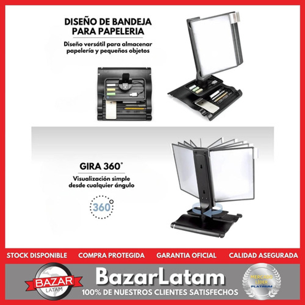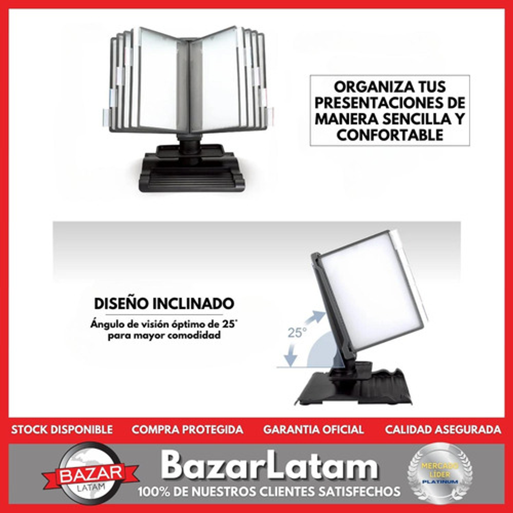 • Fácil Acceso: Los paneles giratorios proporcionan un acceso sencillo a tus documentos, lo que facilita la gestión de la información. • Estabilidad y Comodidad: La base antideslizante mantiene una lectura cómoda, con un centro de gravedad estable. • Ángulo Ajustable: Gira 360° para brindar un ángulo de lectura óptimo y cómodo. Además, tiene un ángulo de inclinación de 25°. • Incluye Folios Anti-Refractivos: Viene con 10 folios anti-refractivos que permiten mostrar hasta 20 hojas A4 o documentos. • Pestañas de Referencia: Incluye 10 pestañas/index para clasificar y acceder a tus documentos de manera rápida y clara. • Cambio de Páginas Sencillo: Facilita el reemplazo y la actualización de hojas de manera rápida y sencilla. • Diseño de bandeja para papelería: Diseño versátil para almacenar papelería y objetos pequeños. • Hojear sin Esfuerzo: Disfruta de hojear las páginas sin esfuerzo para una lectura más cómoda. • Fácil de Limpiar: Se limpia con facilidad y evita la retención de bacterias. • Sistema de Sujeción por Espigas: Su material plástico flexible permite una instalación fácil y estable. • Fácil Instalación y Ajuste: Permite actualizar la información de manera oportuna. • Hecho en Taiwán: Garantiza calidad y durabilidad.