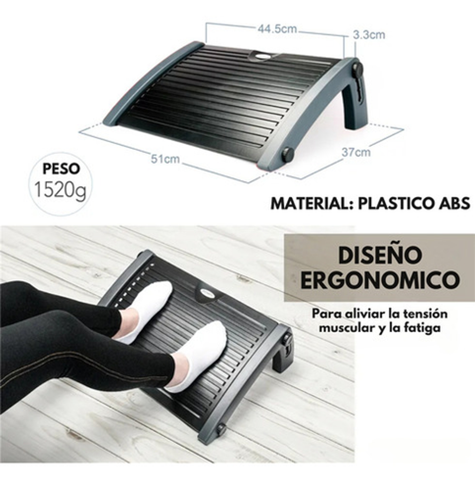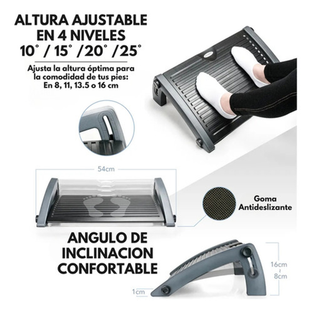 Medidas: 45cm x 34,5cm Ángulo ajustable: 10 ° / 15 ° / 20 ° / 25 ° mediante perillas. Material antideslizante en la base para estabilidad del reposapiés.