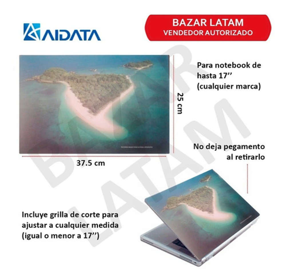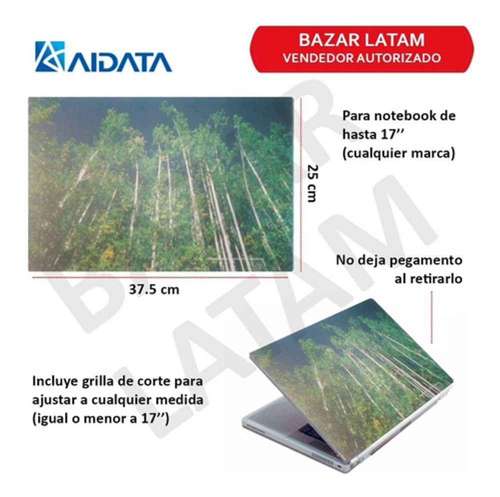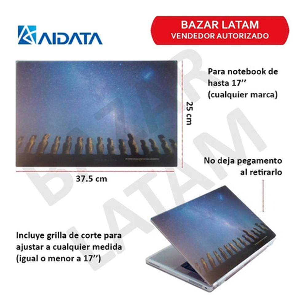 El skin mide 37.5 cm ancho x 25 cm de profundo, apto para notebooks que tengan maximo hasta esas medidas.