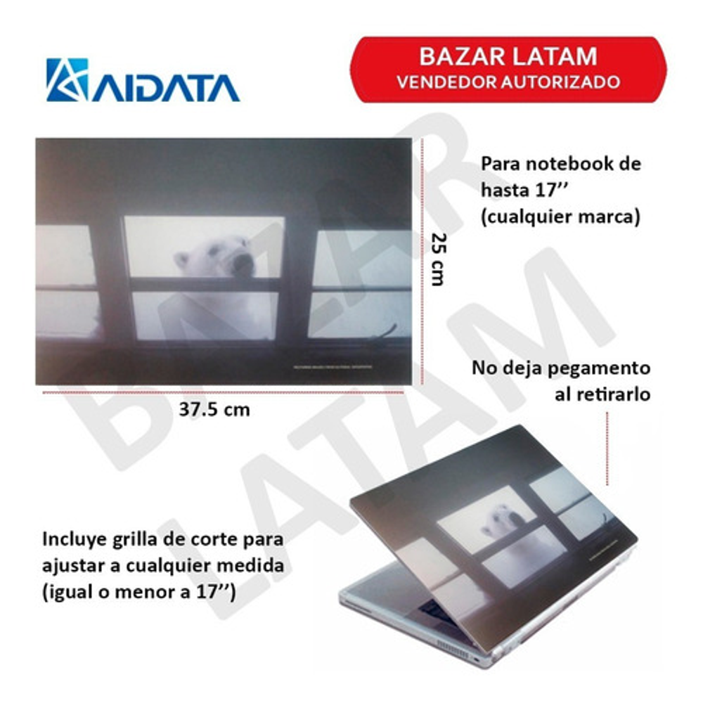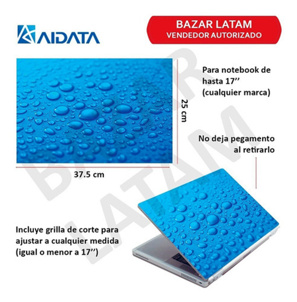 ¡Elegí el diseño que más te guste! -Gotas de Agua -Reflejo Agua -Bosque -Oso Polar -Circuitos -Espacio -Nubes Negras -Glaciar -Marca: AIDATA -Hasta 17 pulgadas. -Nuevo y cerrado -Material de mayor calidad que los vinilicos. -Grilla para adaptarlo a medida.. -Calidad de imágenes únicas. -Semi-Rigido protege la superficie de golpes y rayaduras. -Adhesivo sin pegamento que no deja rastros en la superficie. -Puede quitarlo y volverlo a colocar a su antojo ya que no pierde la adhesion. -Incluye instrucciones sencillas para colocarlo.