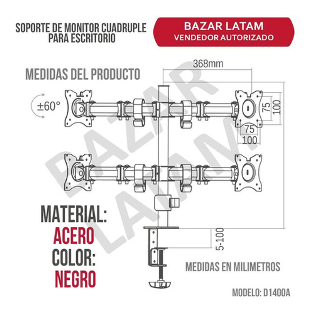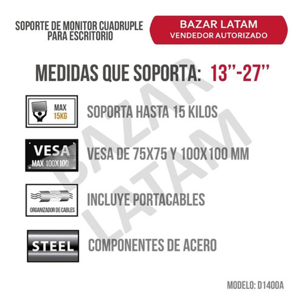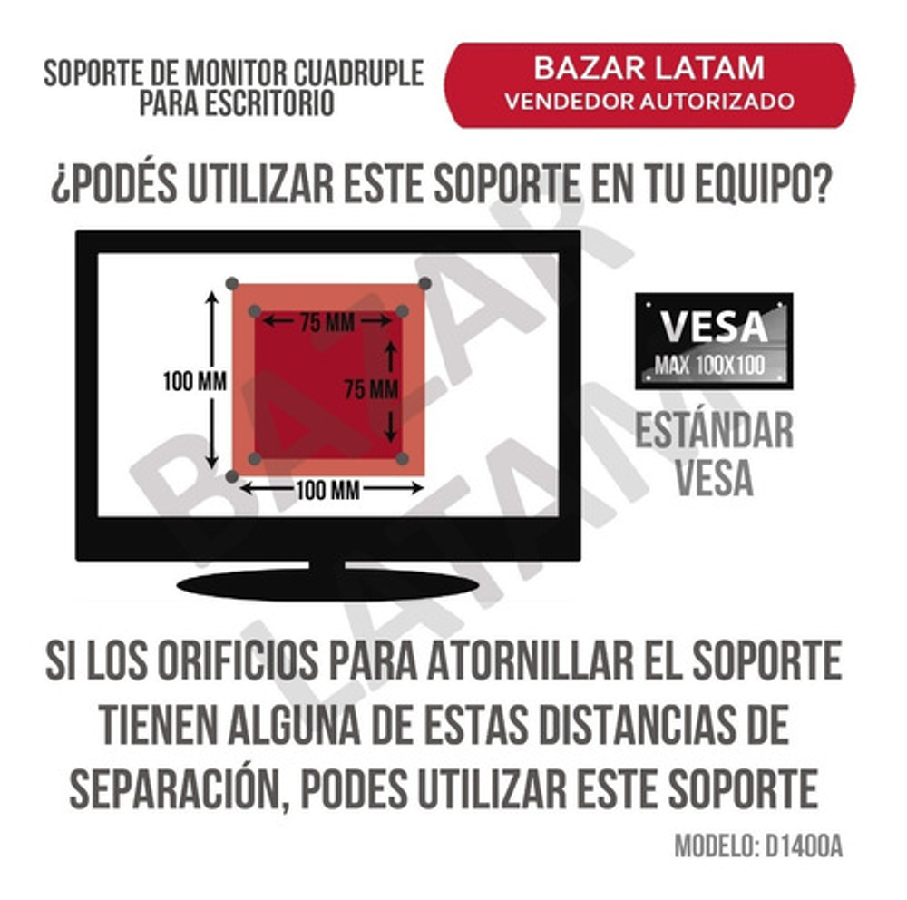 Ideal para tener 4 pantallas en la misma mesa !! ideal diseño y mas ( Corrobore que la distancia entre los agujeros del monitor o tv sean de 7,5 Cm x 7,5 cm o de 10 x 10 cm ) y el peso no exceda del permitido. Soporte fuerte y resistente. Hecho con acero de alta calidad.