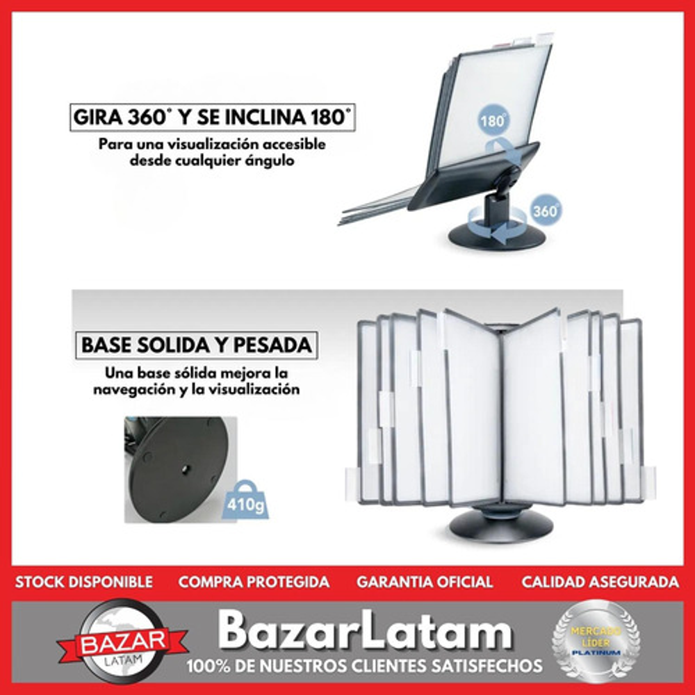 Soporte organizador giratorio para hasta 20 hojas tamaño A4. Los documentos pueden visualizarse de forma vertical u horizontal para mayor comodidad. Características: Ángulo de rotación: 360° Ángulo de inclinación: 90° Medidas: 515mm × 515mm × 390mm Peso: 2kg