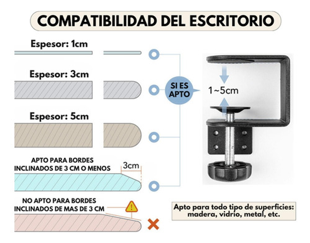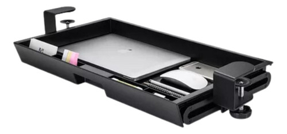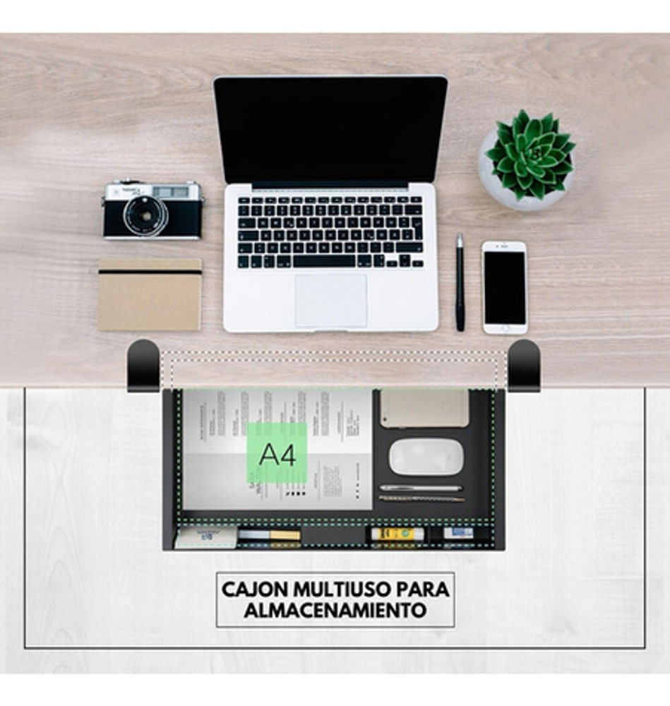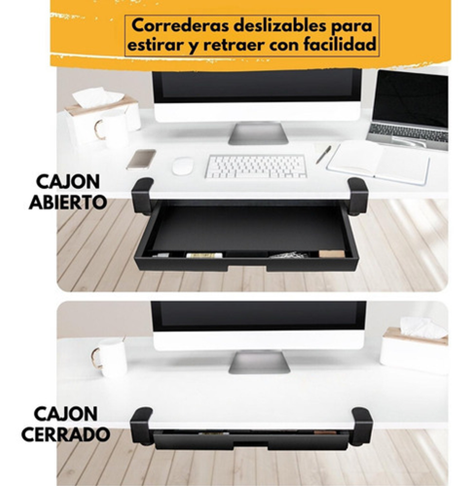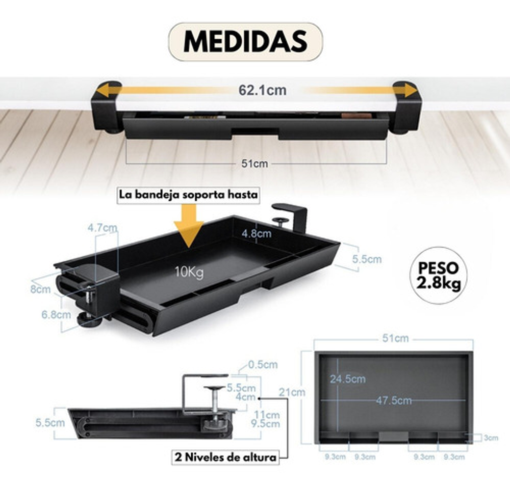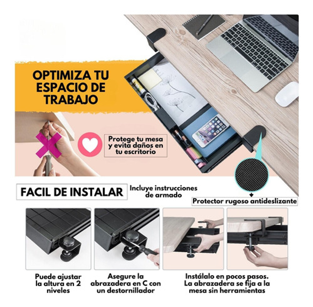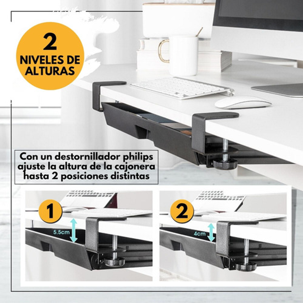 • Fácil Instalación: Se adapta fácilmente a diversos tipos de escritorios, ofreciendo versatilidad en su instalación. • Almacenamiento Inteligente: La cajonera de almacenamiento ayuda a mantener su escritorio más ordenado y organizado. • Riel Deslizante: La cajonera se guarda de forma inteligente bajo la mesa, liberando espacio en tu escritorio. • Abrazadera Resistente: La abrazadera de metal en forma de C se monta con facilidad en el borde de tu mesa, garantizando una sujeción segura. • Compatibilidad Versátil: Adecuada para escritorios con un grosor de hasta 50 mm. • Nota Importante: No recomendado para bordes de mesa biselados que tengan mas de 3 cm (APTO PARA ESCRITORIOS QUE EL BORDE BISELADO TENGA MENOS DE 3 CM). Asegúrate de medir el grosor del tablero de tu mesa antes de comprar. • Espaciosa: La cajonera tiene 51x21 cm. • Ajuste de Altura: La cajonera se puede ajustar en 2 niveles diferentes según sus preferencias (4 cm y 5.5 cm), brindándole una experiencia de trabajo personalizada. • Soporte de Peso: Soporta hasta 10 kg de carga, lo que le permite colocar dispositivos adicionales con confianza. • Hecho en Taiwán: Garantiza calidad y durabilidad.