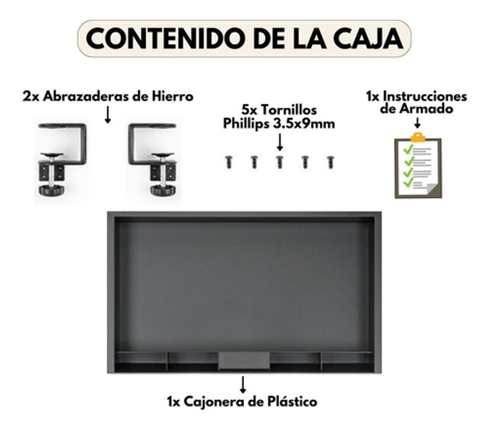 CONTENIDO DE LA CAJA: 1x Cajón de Plástico 2x Abrazadera de Hierro 5x Tornillos Phillips 3.5x9 mm 1x Instrucciones de Armado