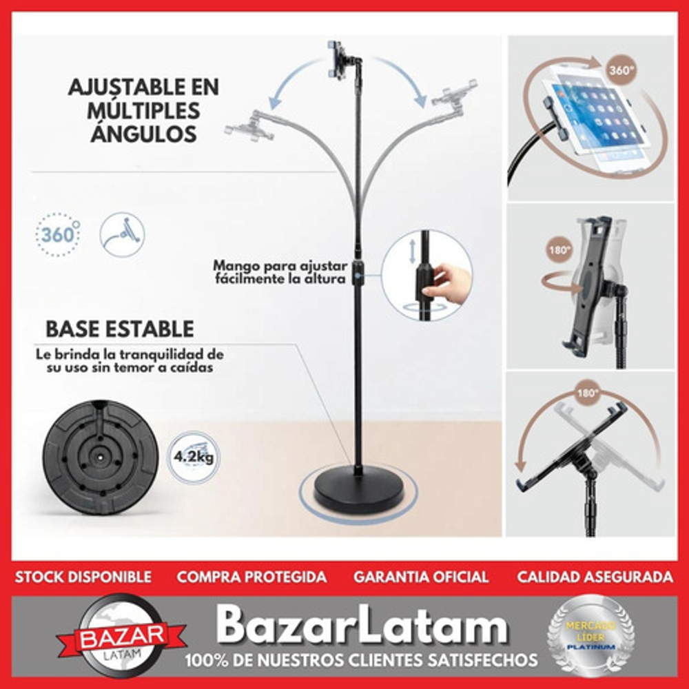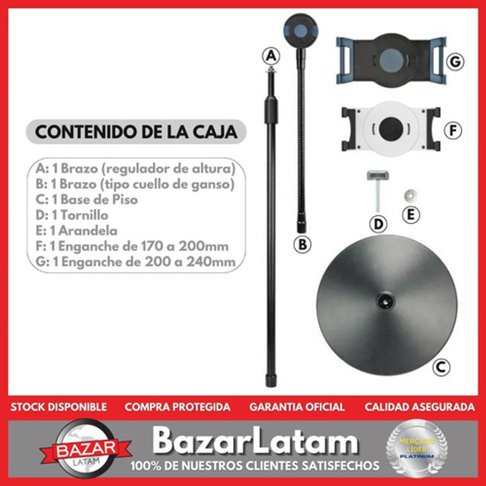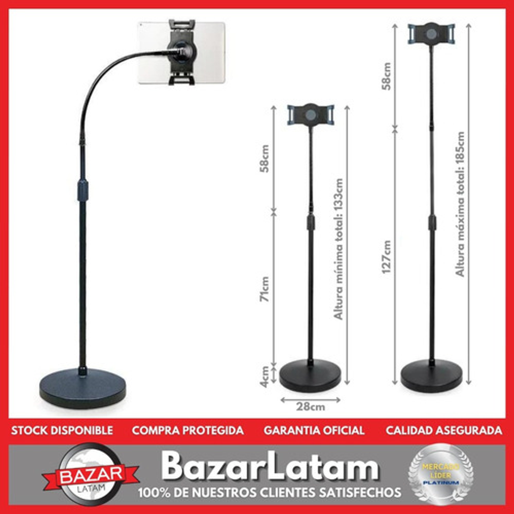 • Versatilidad en Tamaño: Compatible con las tablets que en uno de sus lados mida entre 170 mm y 240 mm. • Ajuste Personalizado: Con un brazo flexible tipo cuello de ganso de 58 cm, logra el ángulo de visión perfecto. Además, el poste ajustable permite una altura de 71 cm a 127 cm. • Libertad de Movimiento: Gira 360º y se inclina 180° hacia arriba, abajo, izquierda y derecha, adaptándose a tus necesidades. • Para Diversos Entornos: Ideal para oficinas y uso doméstico, se adapta a cualquier lugar donde necesites trabajar o disfrutar de tu tablet. • Rango de Altura: Desde una altura mínima de 133 cm hasta una máxima de 185 cm.