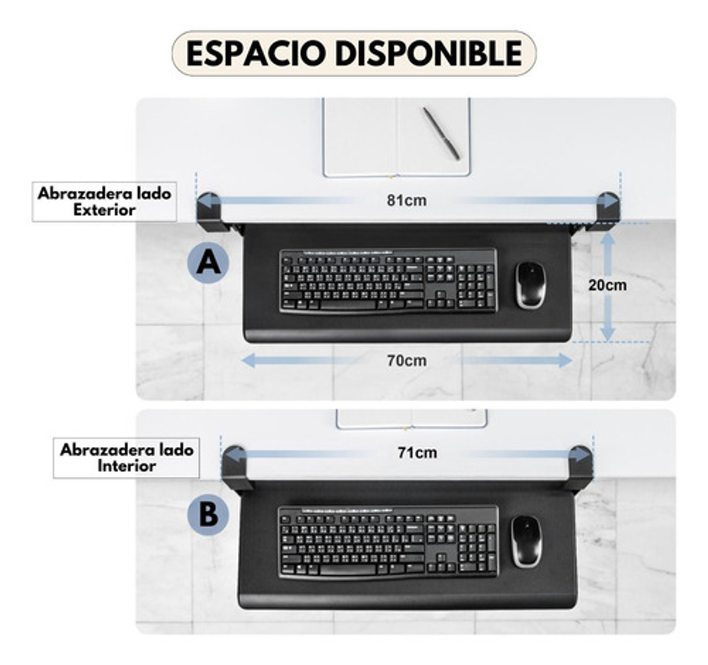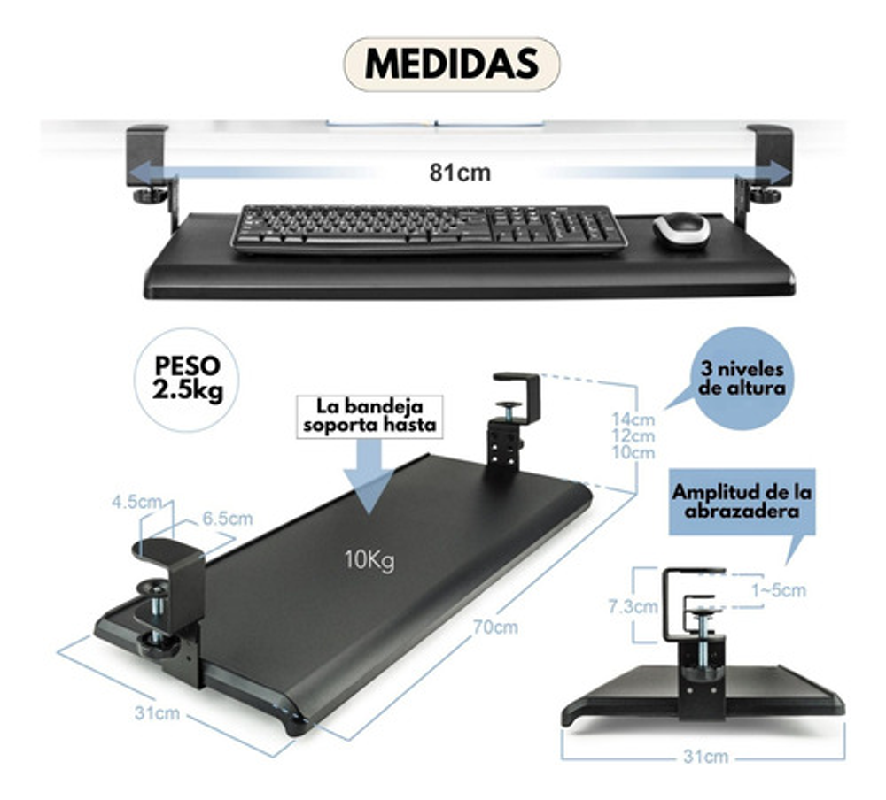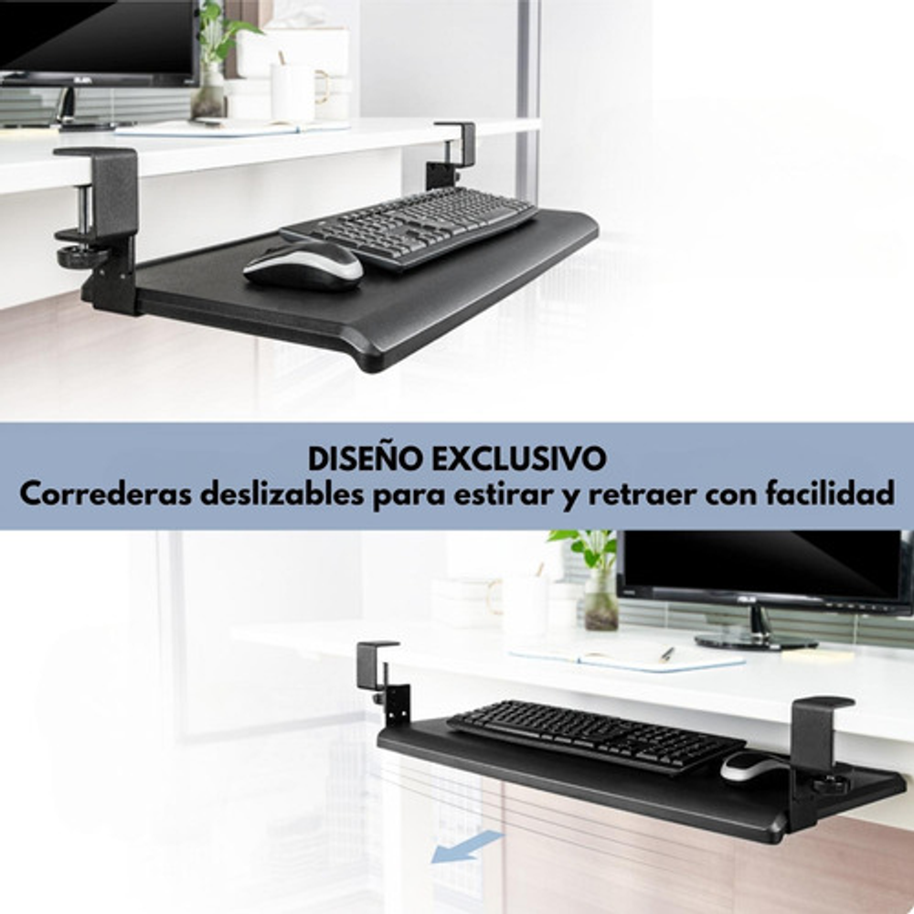 • Fácil Instalación: Se adapta fácilmente a diversos tipos de escritorios, ofreciendo versatilidad en su instalación. • Diseño Ergonómico: Reduce la carga en hombros y cuello, brindando un entorno de trabajo más cómodo. • Riel Deslizante: El teclado se guarda de forma inteligente bajo la mesa, liberando espacio en tu escritorio. • Abrazadera Resistente: La abrazadera de metal en forma de C se monta con facilidad en el borde de tu mesa, garantizando una sujeción segura. • Compatibilidad Versátil: Adecuada para escritorios con un grosor de hasta 50 mm. • Nota Importante: No recomendado para bordes de mesa biselados. Asegúrate de medir el grosor del tablero de tu mesa antes de comprar. • Espaciosa: La bandeja tiene 70 cm de largo. • Métodos de Instalación: Dispone de dos opciones de instalación: con la abrazadera por dentro (requiere 71 cm de espacio) o con la abrazadera por fuera (requiere 81 cm de espacio). • Ajuste de Altura: El teclado se puede ajustar en 3 niveles diferentes según sus preferencias (10 cm, 12 cm y 14 cm), brindándole una experiencia de trabajo personalizada. • Soporte de Peso: Soporta hasta 10 kg de carga, lo que le permite colocar dispositivos adicionales con confianza. • Hecho en Taiwán: Garantiza calidad y durabilidad.