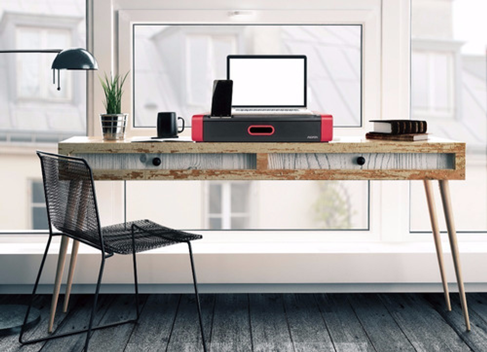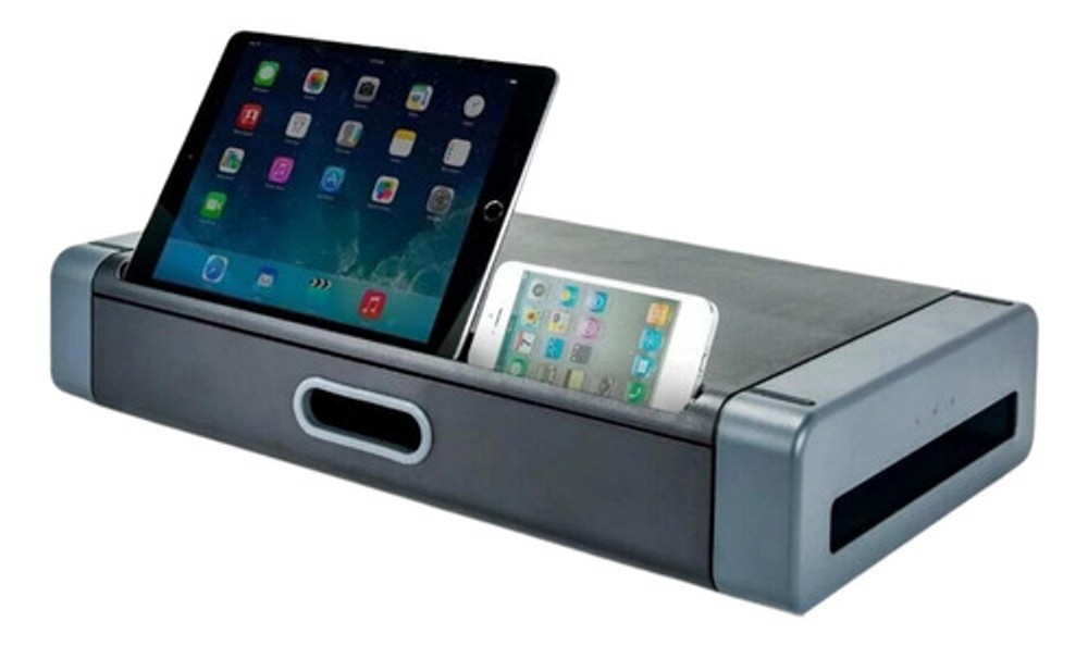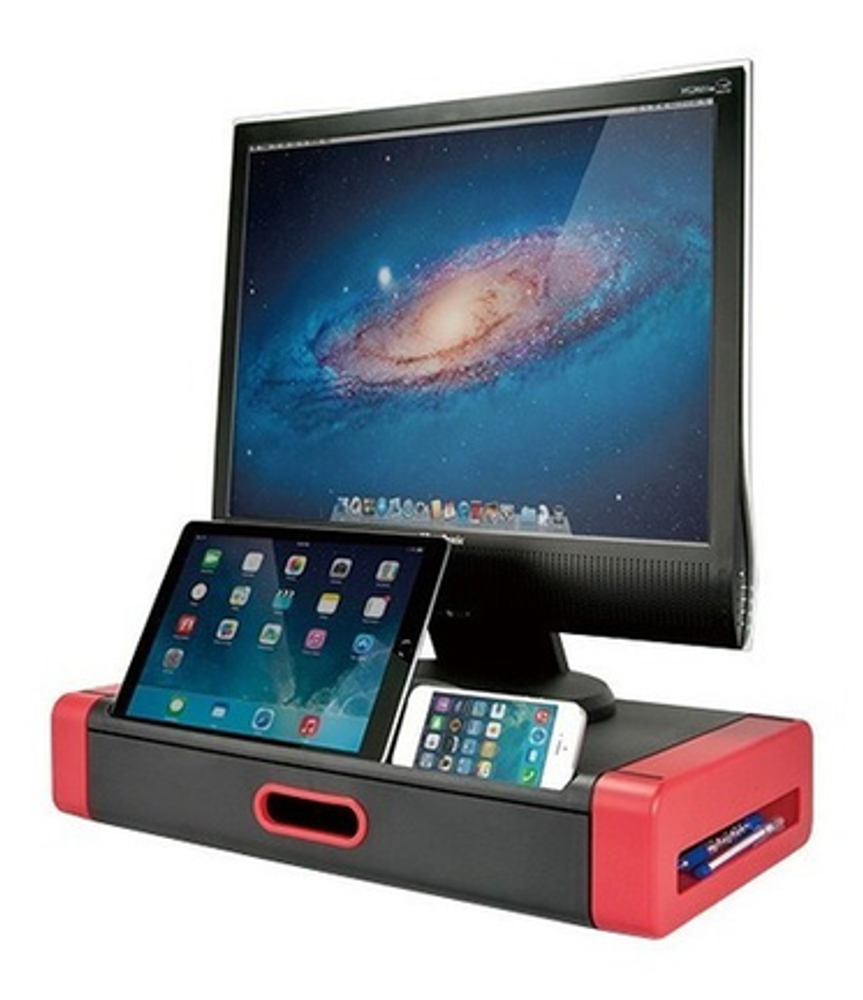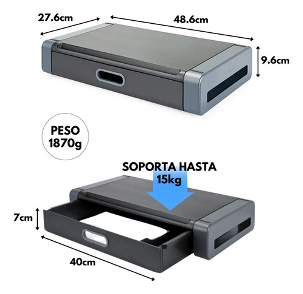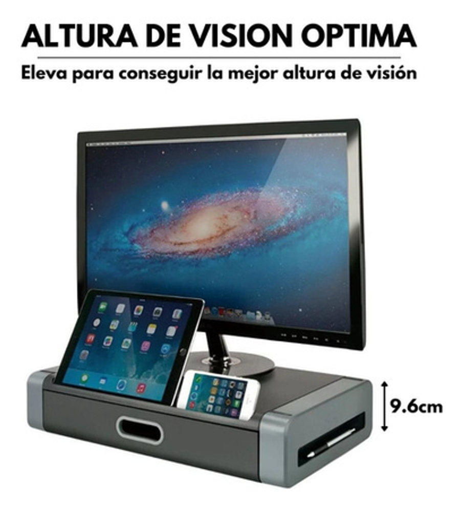 Eleva el monitor al nivel de los ojos para una visualización cómoda. Tiene capacidad para monitores de hasta 24 ", impresoras u otras máquinas de oficina. La ranura frontal contiene la mayoría de las tablet y smartphone. Diseño apilable. Tamaño: 486 x 276 x 96 mm
