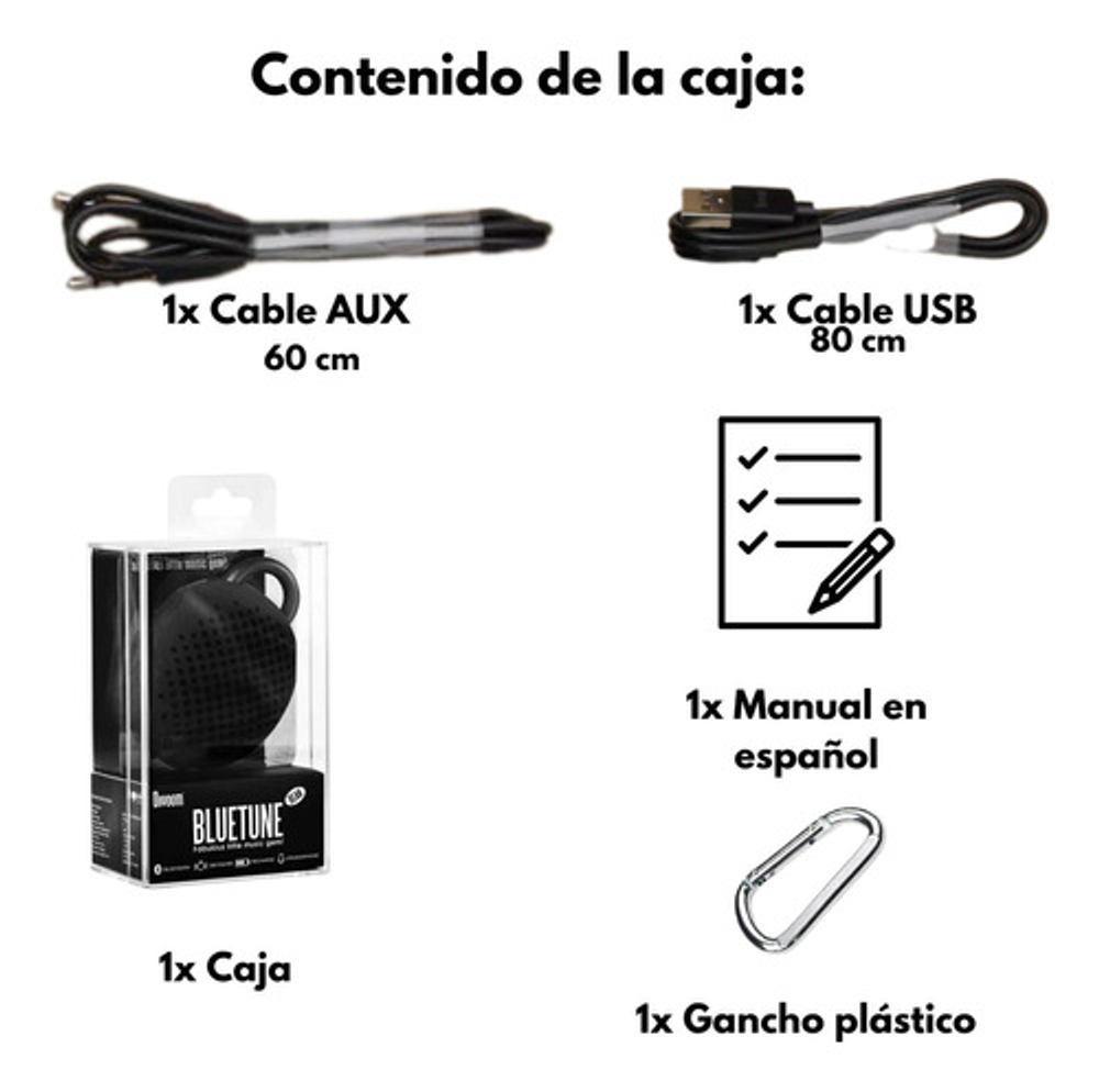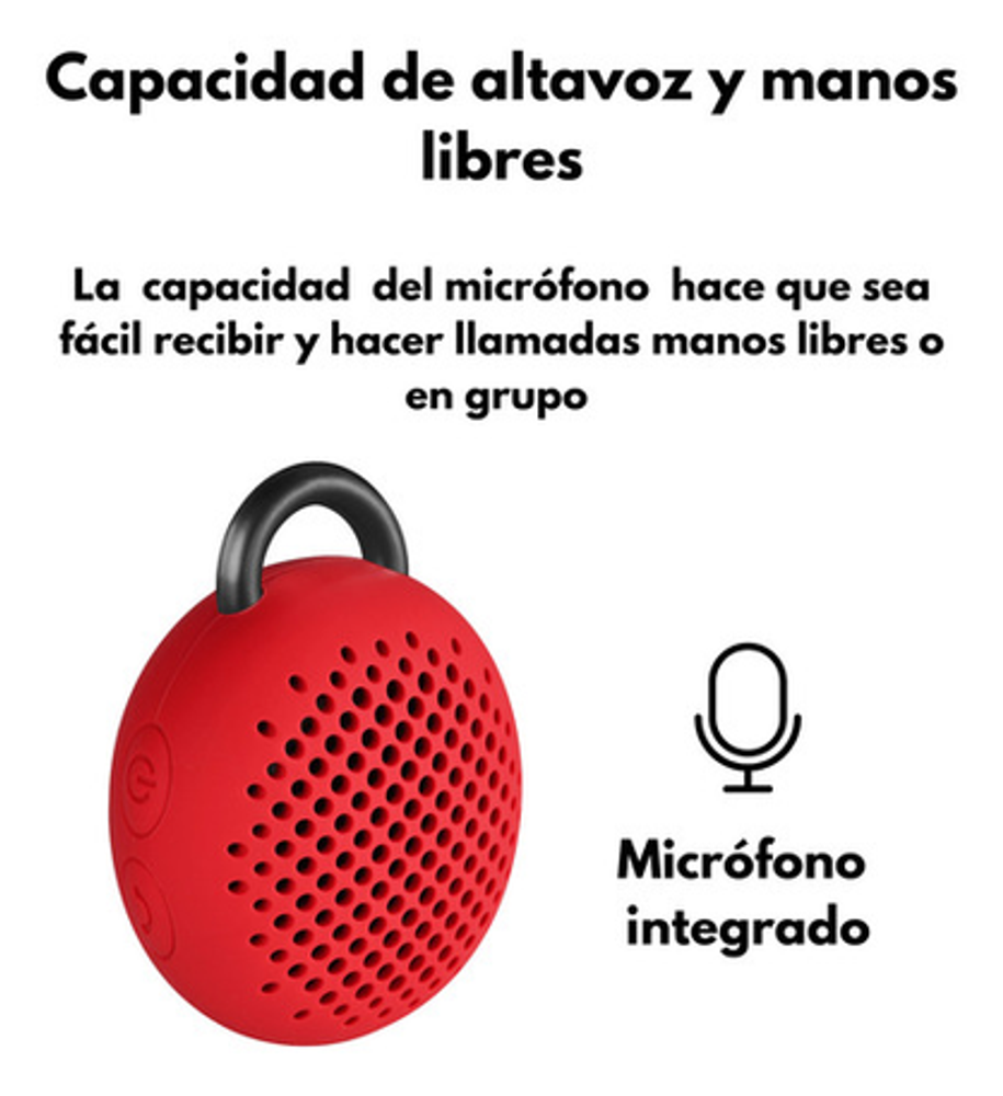 Potencia de salida: 3W. potencia pico total: 6W. Dimensiones: 68Lx45Wx92Hmm. Peso: 107 g. Tamaño del conductor: 50 mm micro controlador. Relación señal a ruido: 75 dB. Respuesta de frecuencia: 60-20000HZ. Tensión de carga: 5V. Bluetooth compatible: V3.0. Soporte de perfiles de Bluetooth: A2DP estéreo.