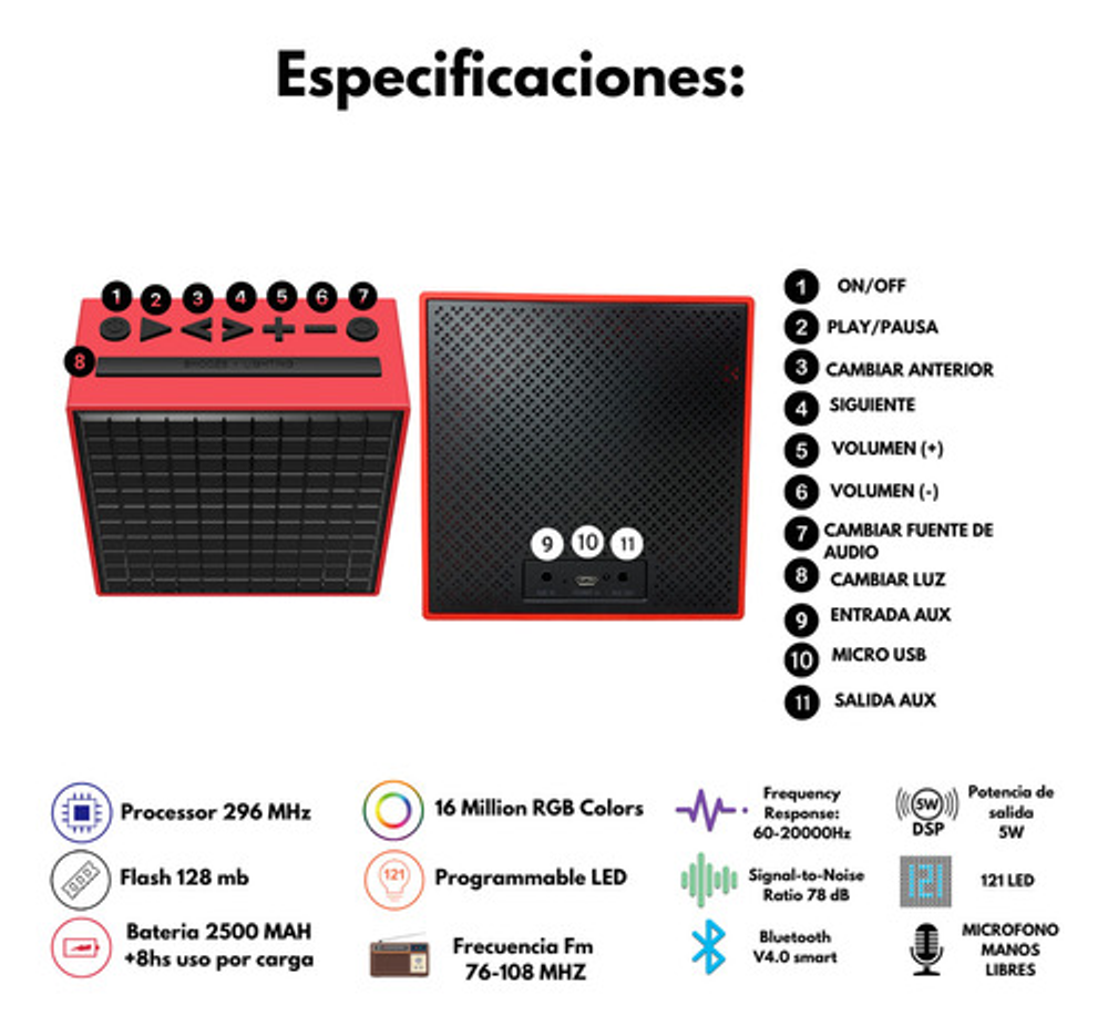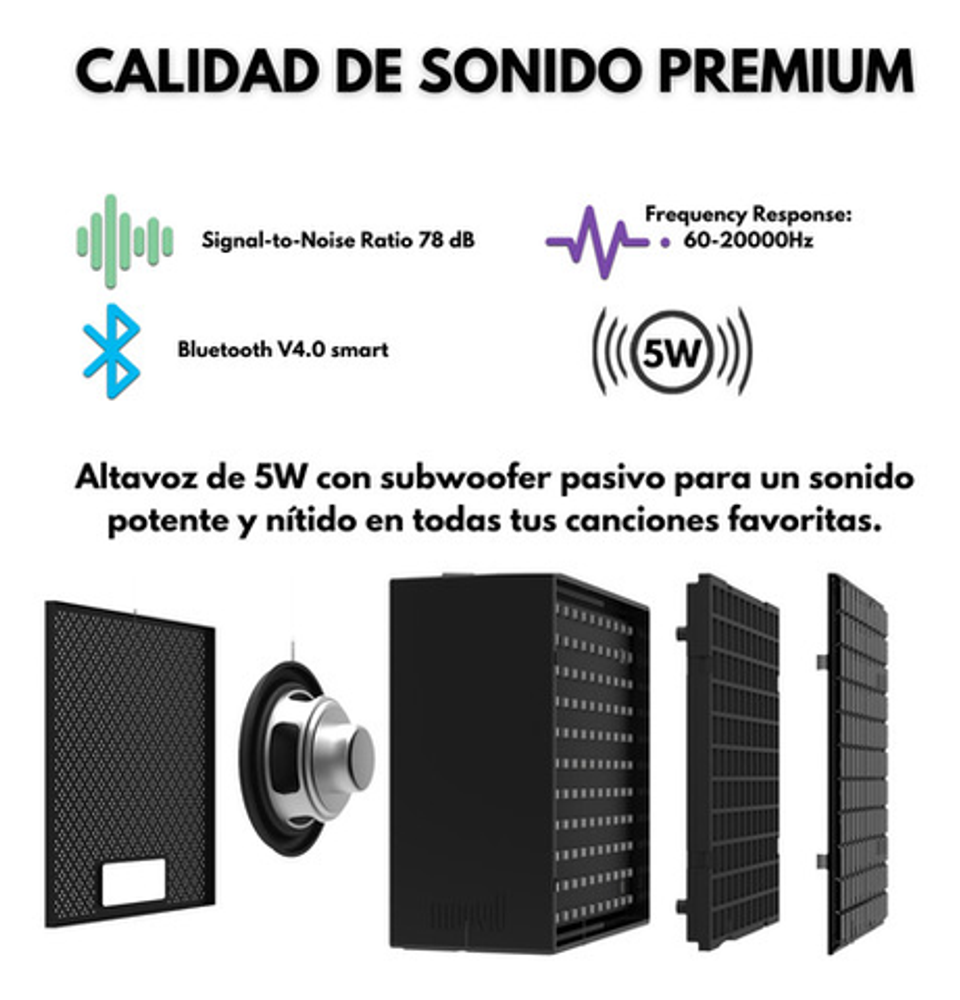 Pero eso no es todo, este parlante cuenta con luces LED que se sincronizan con la música, creando un ambiente único y divertido. Además, podrás personalizar las luces y crear tus propios diseños a través de la pantalla incorporada.