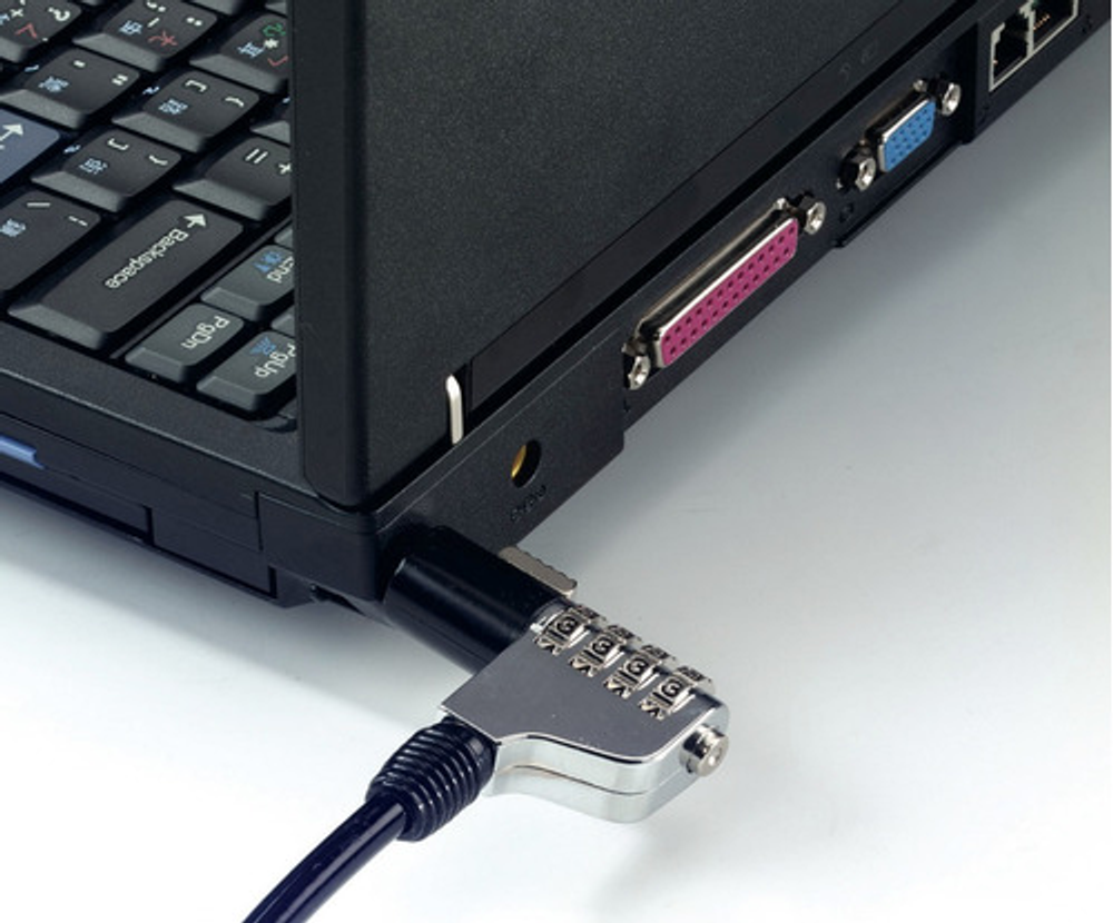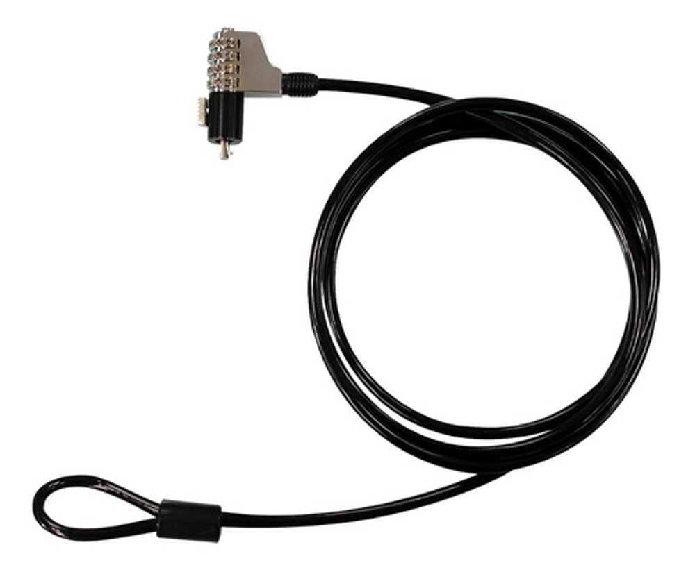 Candado de combinación de 4 digitos. Cable de acero forrado de 1.8 mt Candado apto para Notebook y equipos que disponen de un slot de seguridad. Medida slot de seguridad: 7mm x 3mm