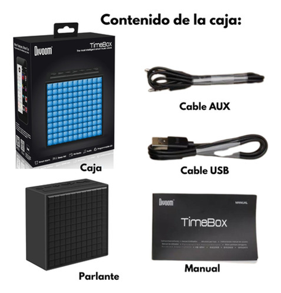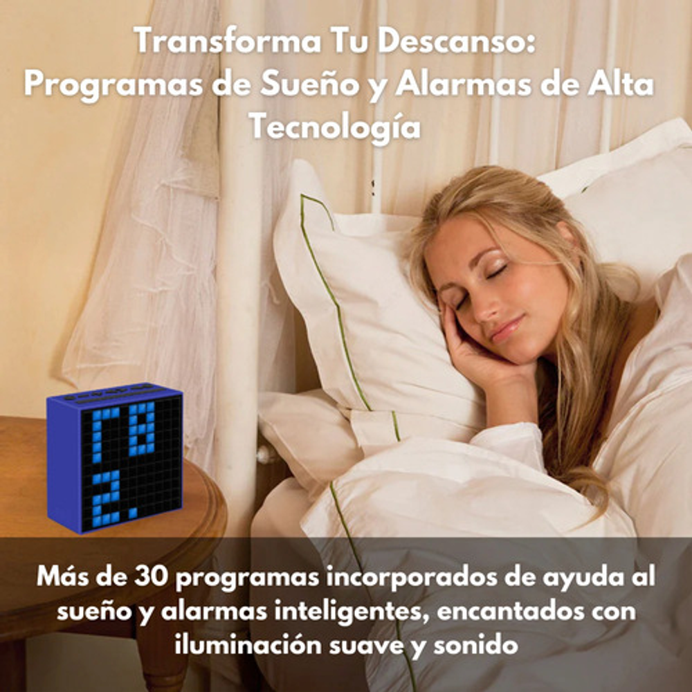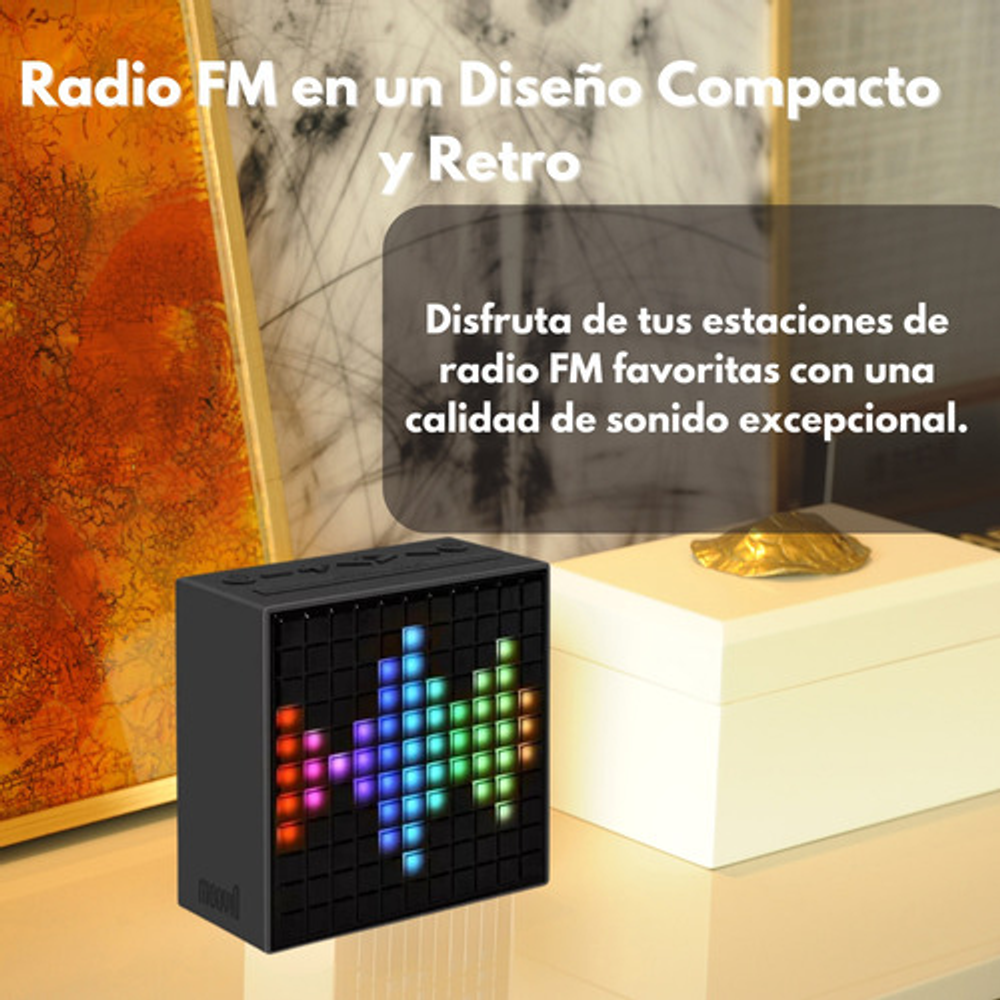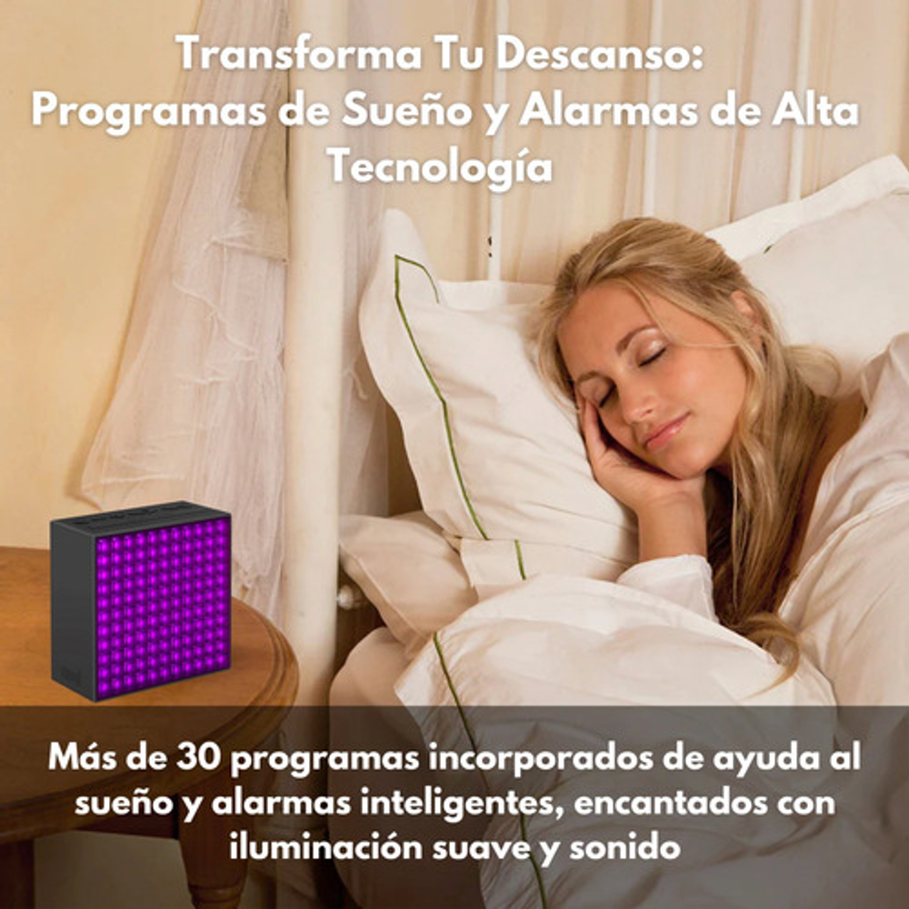 -Más de 30 programas integrados para ayudar en la conciliación del sueño así como alarmas inteligentes, mediante la combinación de sonido e iluminación suave. -Radio FM integrada. -Altavoz de 3" y 5 watios de potencia para proporcionar un excelente sonido con tecnología DSP. -121 LED programables para hacer valer toda tu creatividad con el lienzo que te proporciona Timebox. -Aplicación móvil avanzada, termómetro incorporado, sistema de notificación de redes sociales y mucho más. TimeBox es el reloj inteligente más avanzado de Divoom.