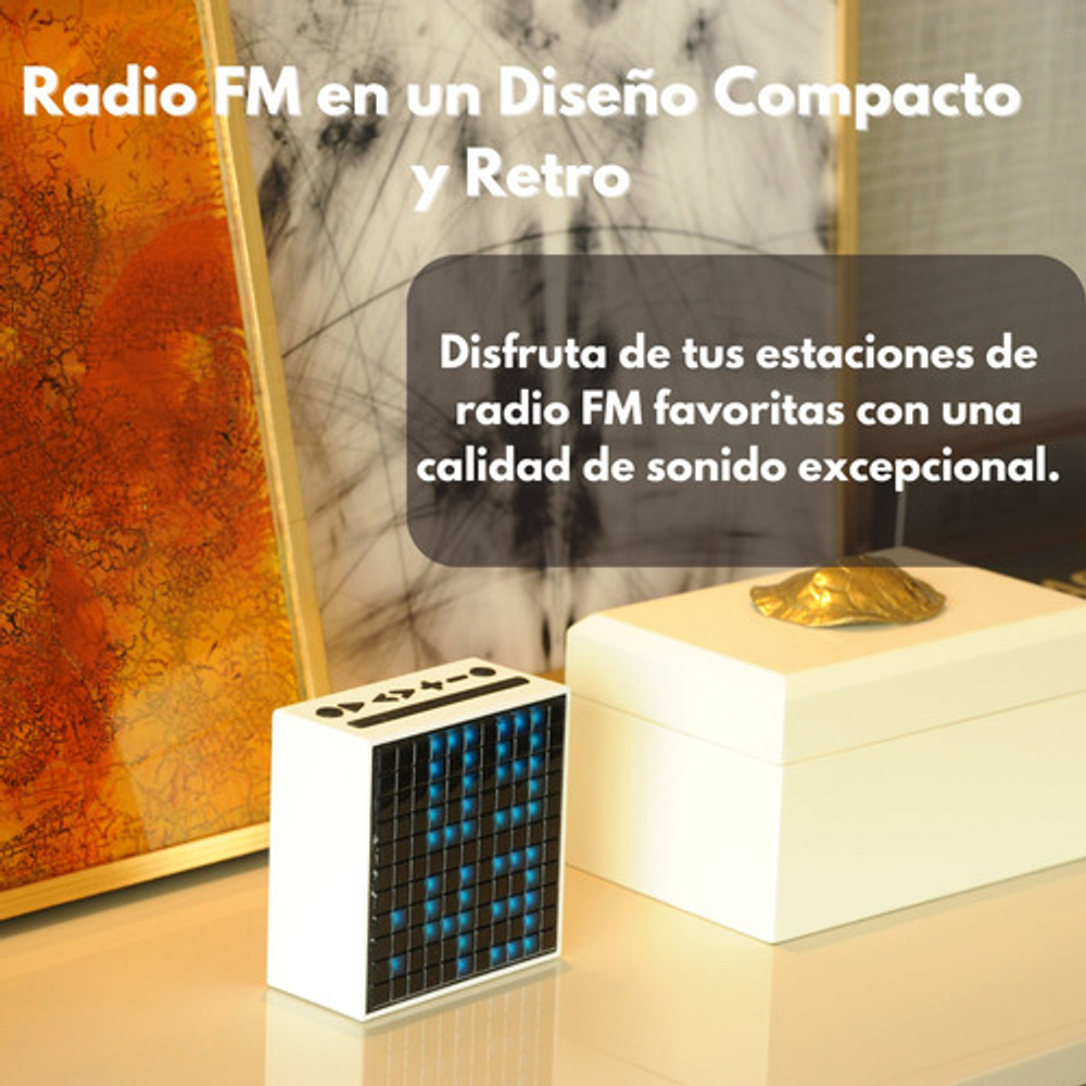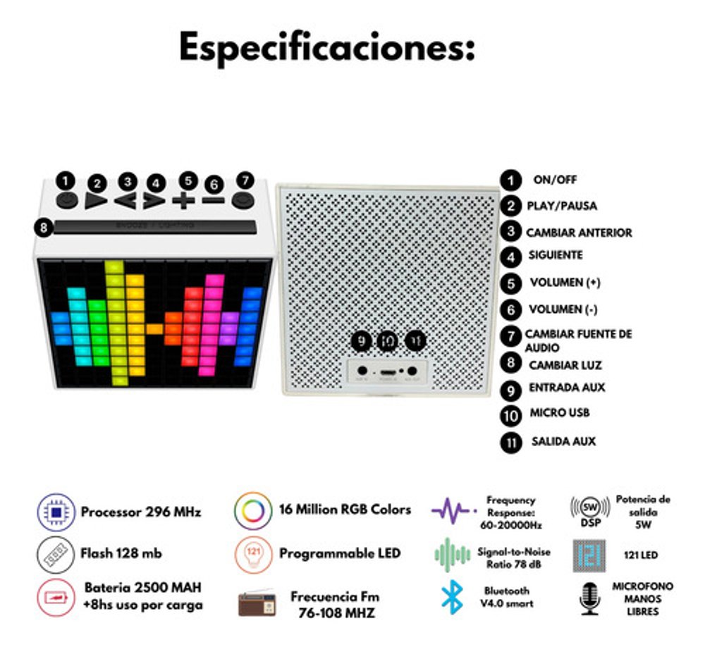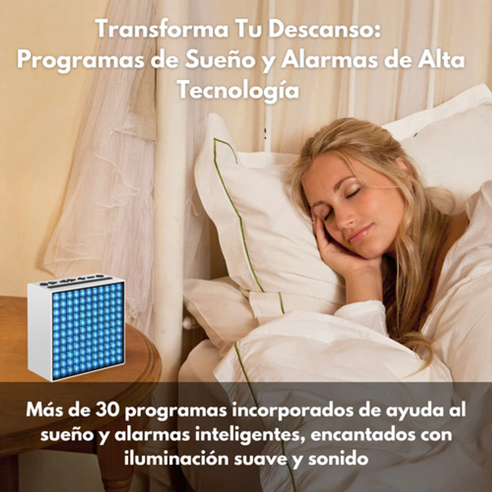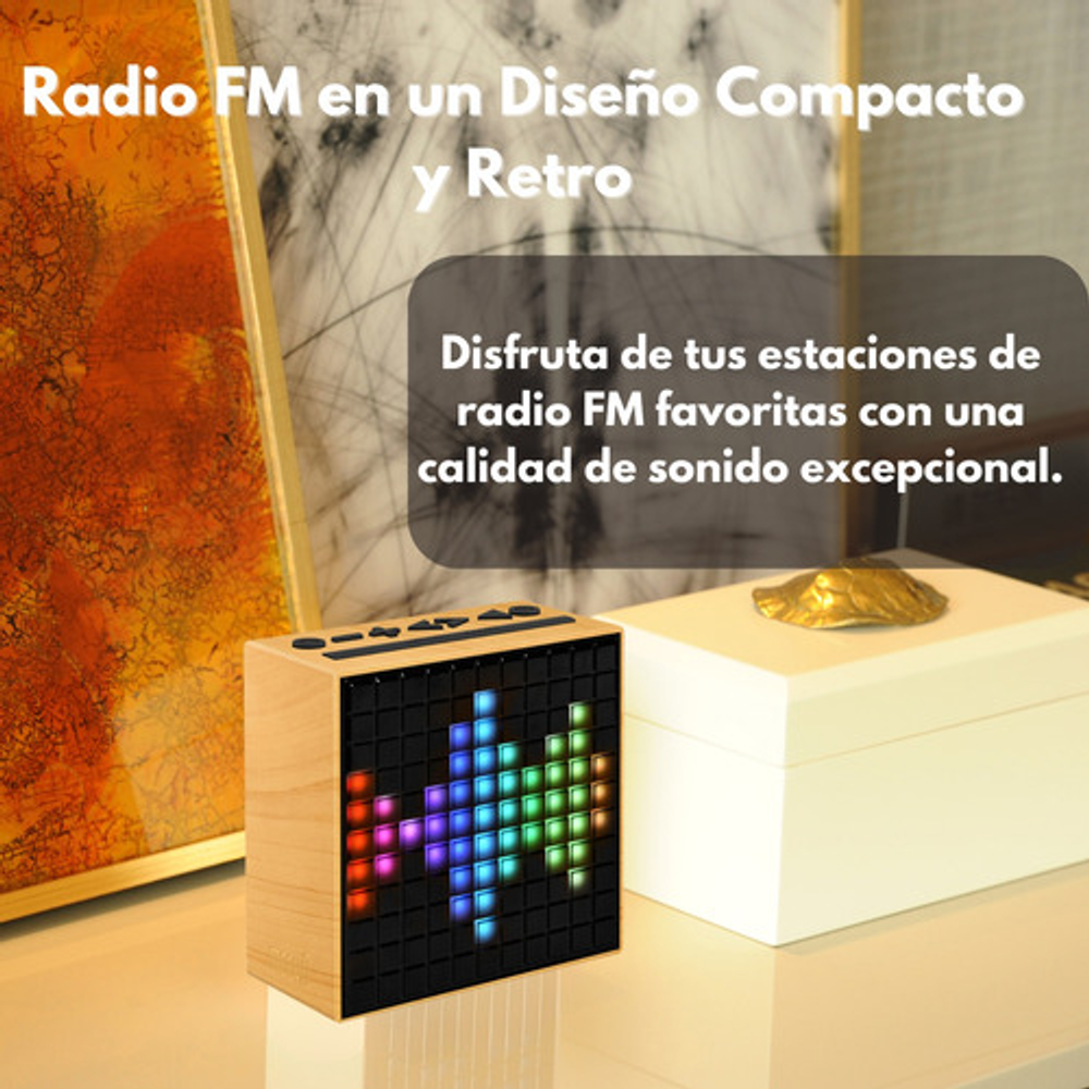 -Más de 30 programas integrados para ayudar en la conciliación del sueño así como alarmas inteligentes, mediante la combinación de sonido e iluminación suave. -Radio FM integrada. -Altavoz de 3" y 5 watios de potencia para proporcionar un excelente sonido con tecnología DSP. -121 LED programables para hacer valer toda tu creatividad con el lienzo que te proporciona Timebox. -Aplicación móvil avanzada, termómetro incorporado, sistema de notificación de redes sociales y mucho más. TimeBox es el reloj inteligente más avanzado de Divoom.