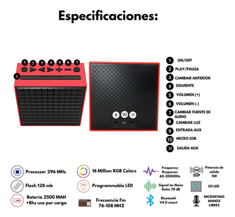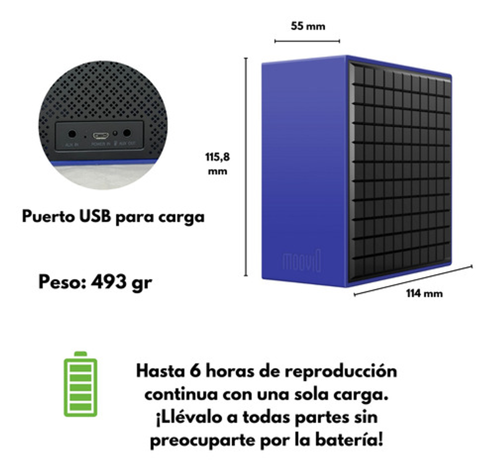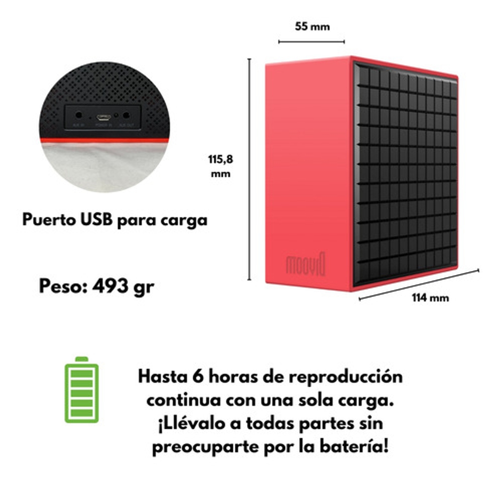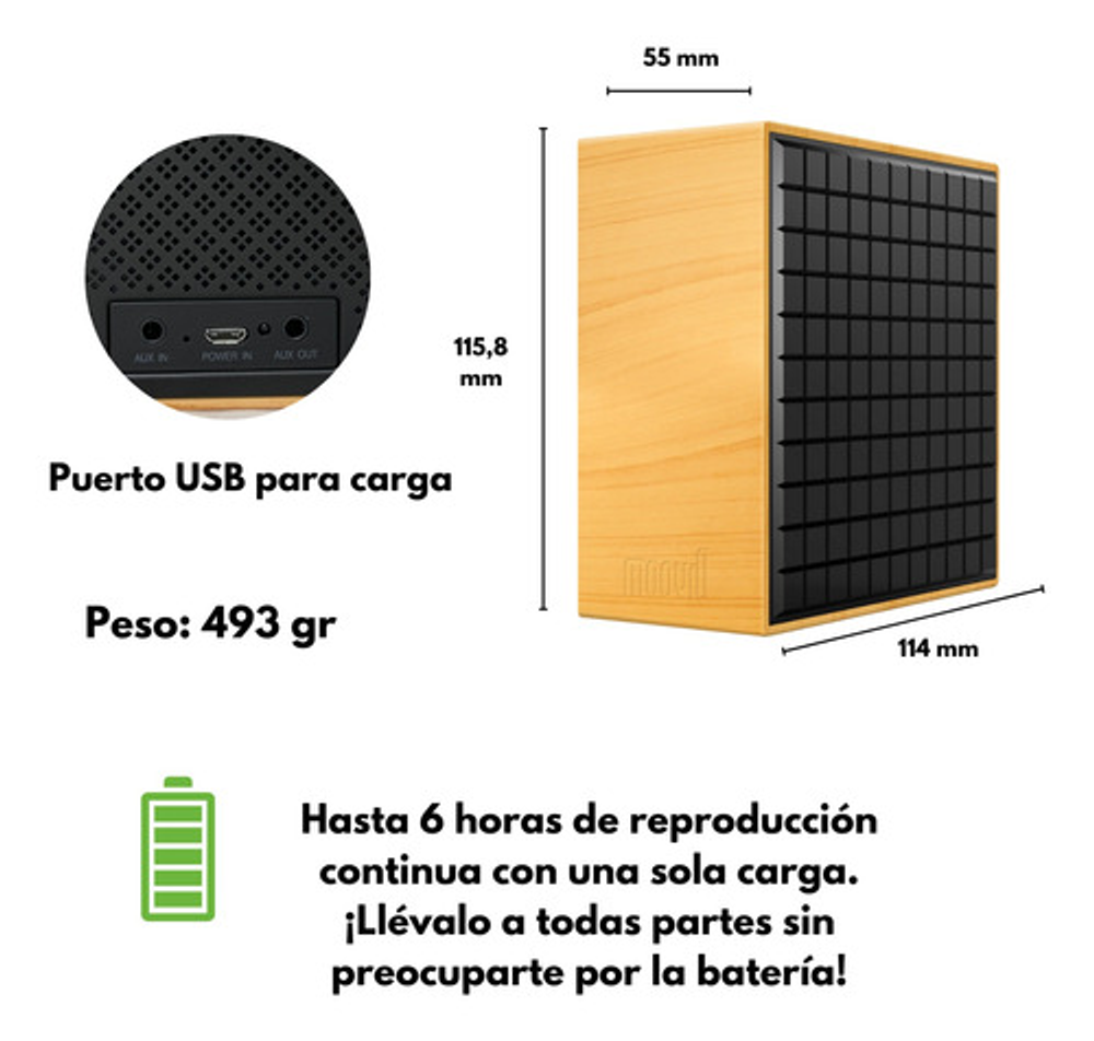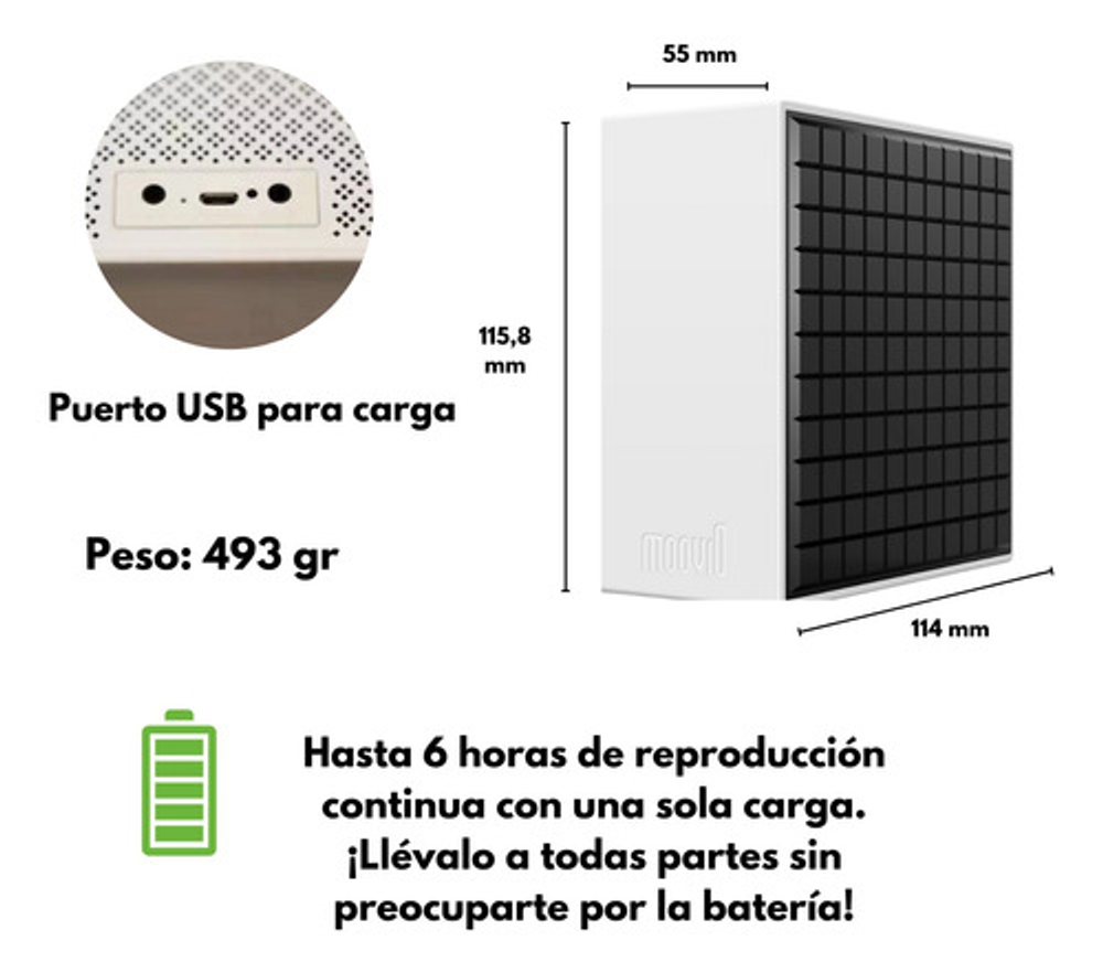 Dimensiones: 114L x 115.8A x 55AL mm Peso: 383g Potencia de salida: 5W Relación señal-ruido: >= 75 dB Tiempo de reproducción: Hasta 6 horas Tiempo de carga: 3-4 horas Método de carga: Cable USB 5V-1A Alcance inalámbrico: Hasta 10 metros Bluetooth: Bluetooth 4.0 Smart
