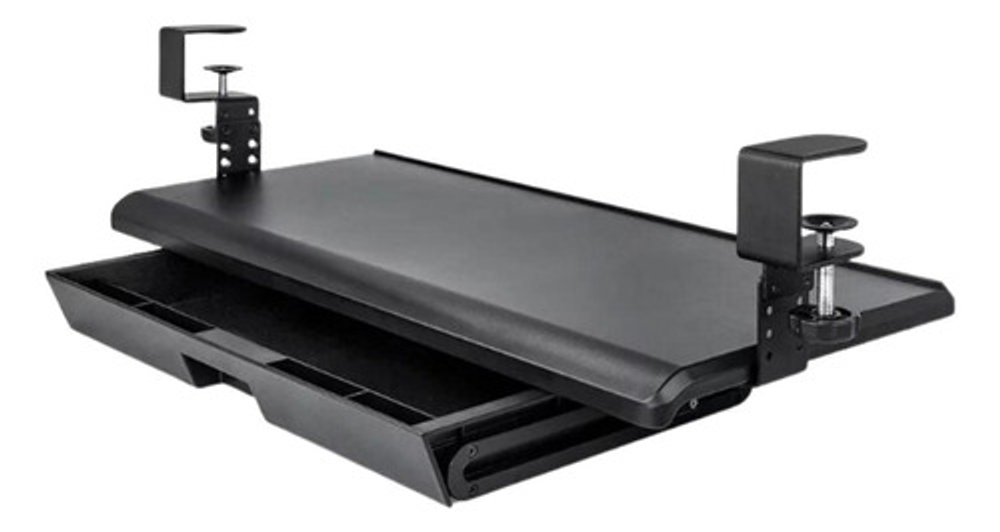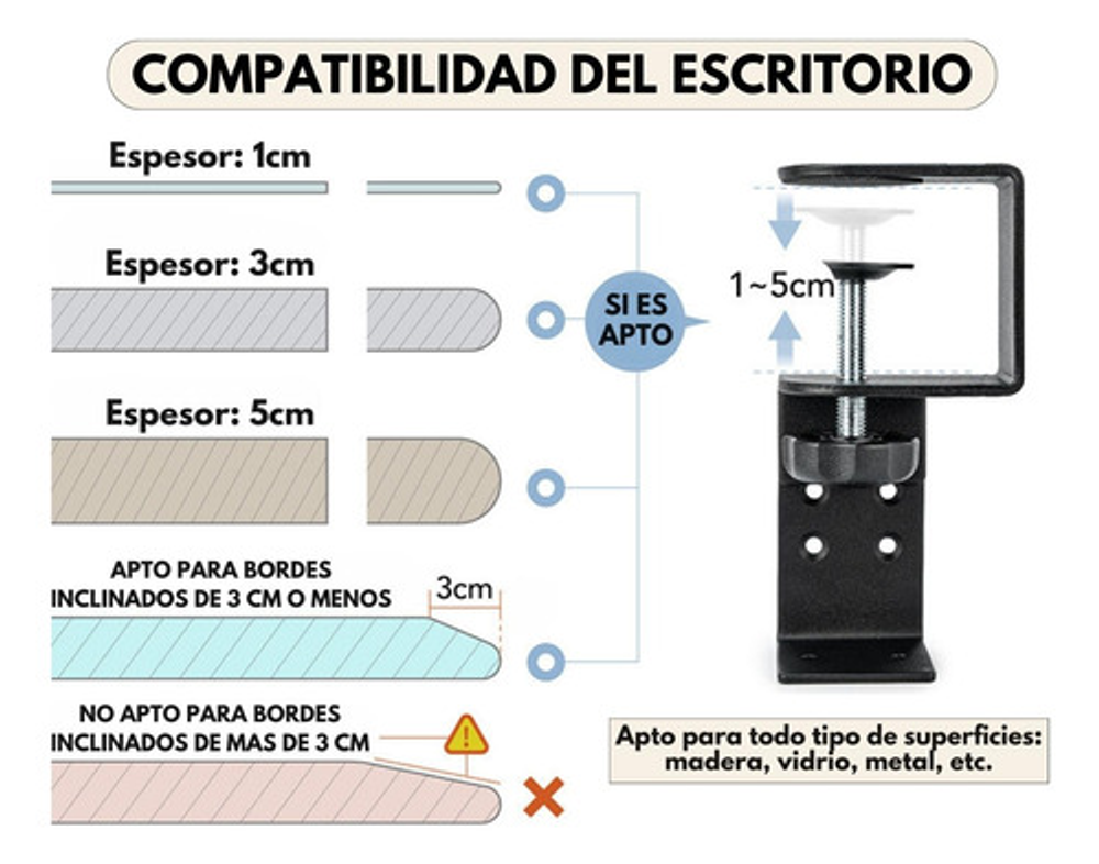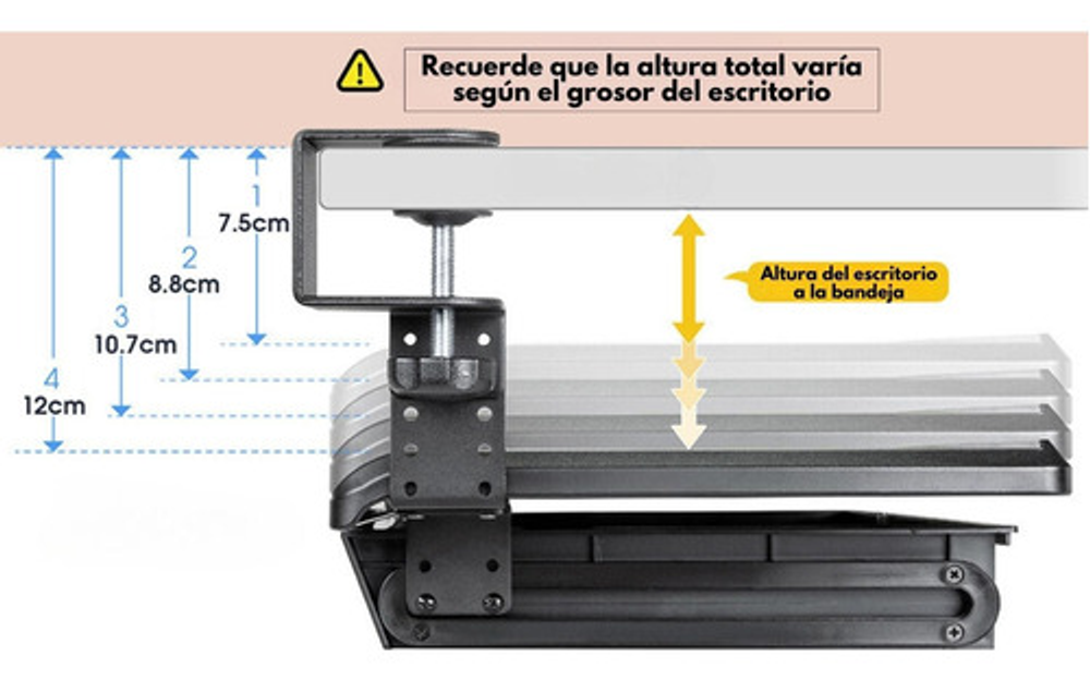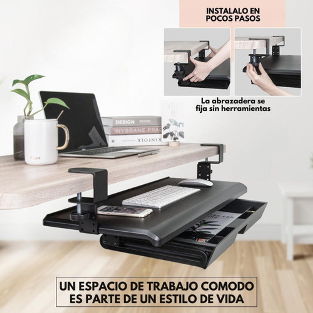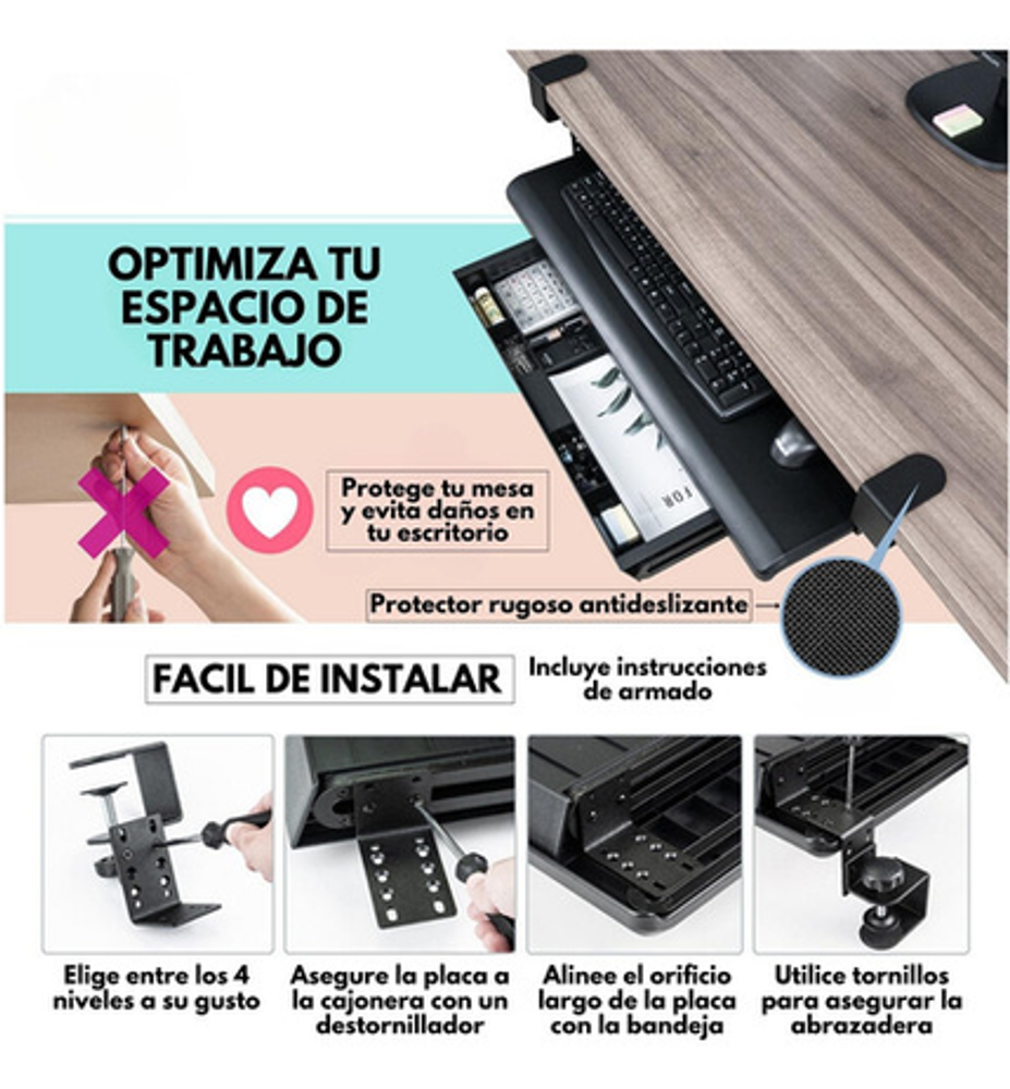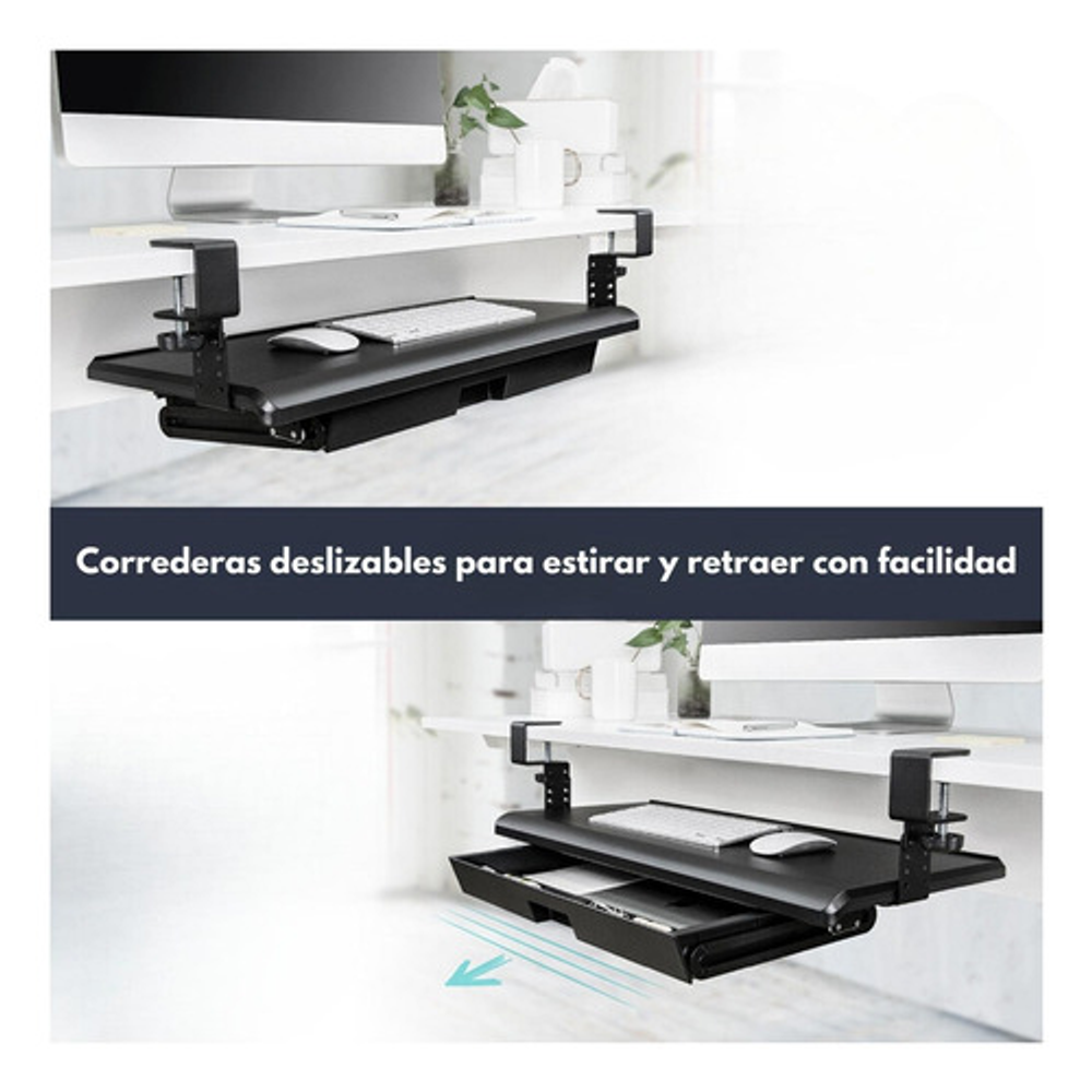 • Fácil Instalación: Se adapta fácilmente a diversos tipos de escritorios, ofreciendo versatilidad en su instalación. • Diseño Ergonómico: Reduce la carga en hombros y cuello, brindando un entorno de trabajo más cómodo. • Riel Deslizante: El teclado se guarda de forma inteligente bajo la mesa, liberando espacio en tu escritorio. • Abrazadera Resistente: La abrazadera de metal en forma de C se monta con facilidad en el borde de tu mesa, garantizando una sujeción segura. • Almacenamiento Inteligente: La cajonera de almacenamiento incorporada ayuda a mantener su escritorio más ordenado y organizado. • Compatibilidad Versátil: Adecuada para escritorios con un grosor de hasta 50 mm. • Nota Importante: No recomendado para bordes de mesa biselados que tengan mas de 3 cm (APTO PARA ESCRITORIOS QUE EL BORDE BISELADO TENGA MENOS DE 3 CM). Asegúrate de medir el grosor del tablero de tu mesa antes de comprar. • Espaciosa: La bandeja tiene 70x31 cm y la cajonera tiene 51x30 cm. • Ajuste de Altura: El teclado se puede ajustar en 4 niveles diferentes según sus preferencias (7.5 cm, 8.8 cm, 10.7 y 12 cm), brindándole una experiencia de trabajo personalizada. • Soporte de Peso: Soporta hasta 10 kg de carga, lo que le permite colocar dispositivos adicionales con confianza. • Hecho en Taiwán: Garantiza calidad y durabilidad.