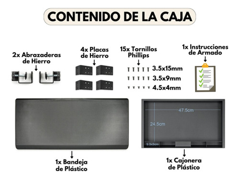 CONTENIDO DE LA CAJA: 1x Bandeja de Plástico 1x Cajón de Plástico 2x Abrazadera de Hierro 4x Placa de Hierro 5x Tornillos Phillips 3.5x15 mm 5x Tornillos Phillips 3.5x9 mm 5x Tornillos Phillips 4.5x4 mm 1x Instrucciones de Armado