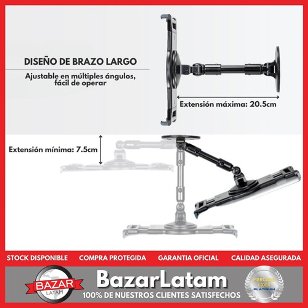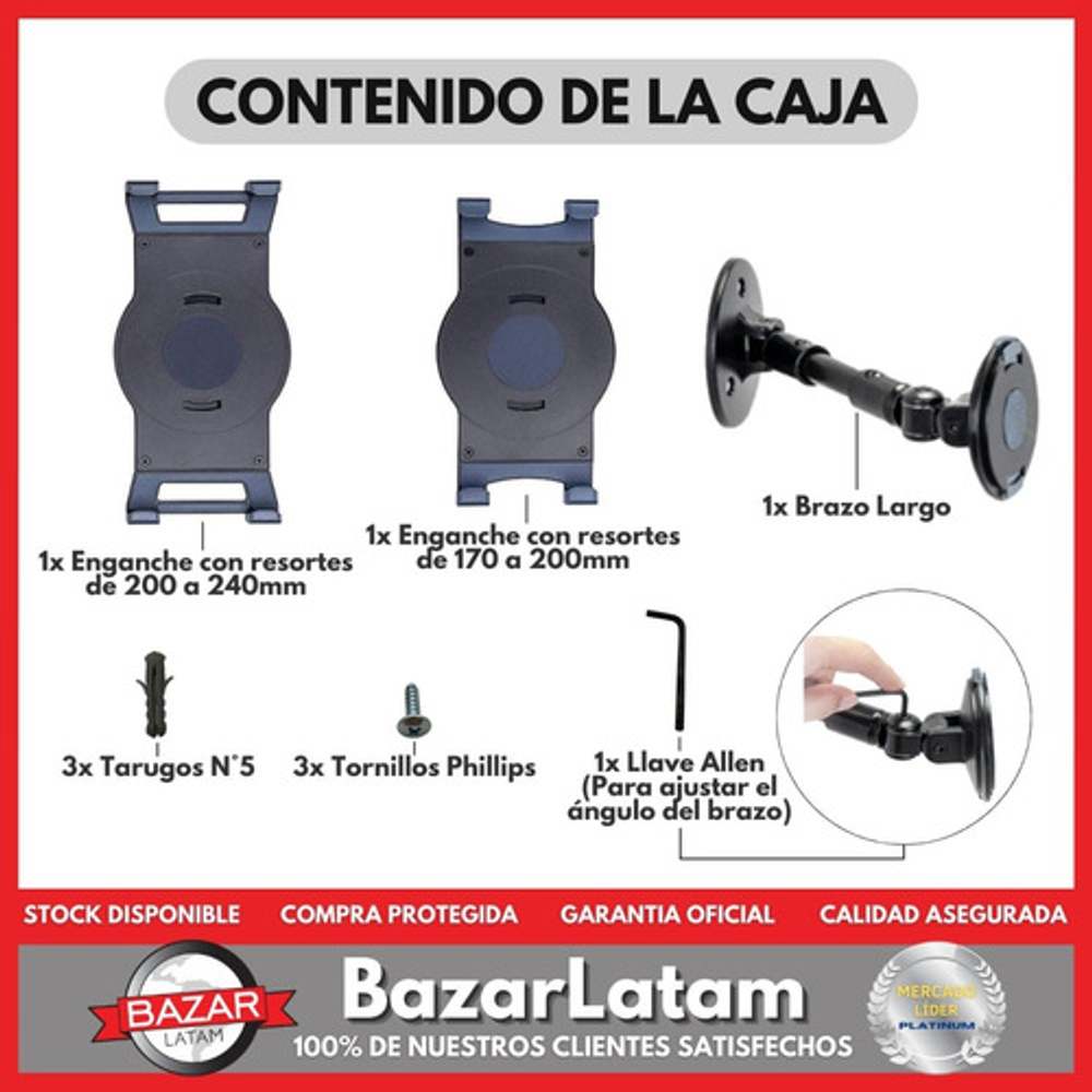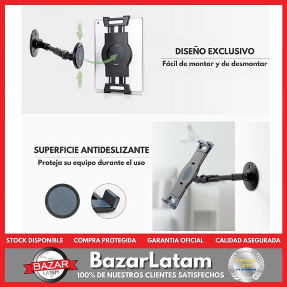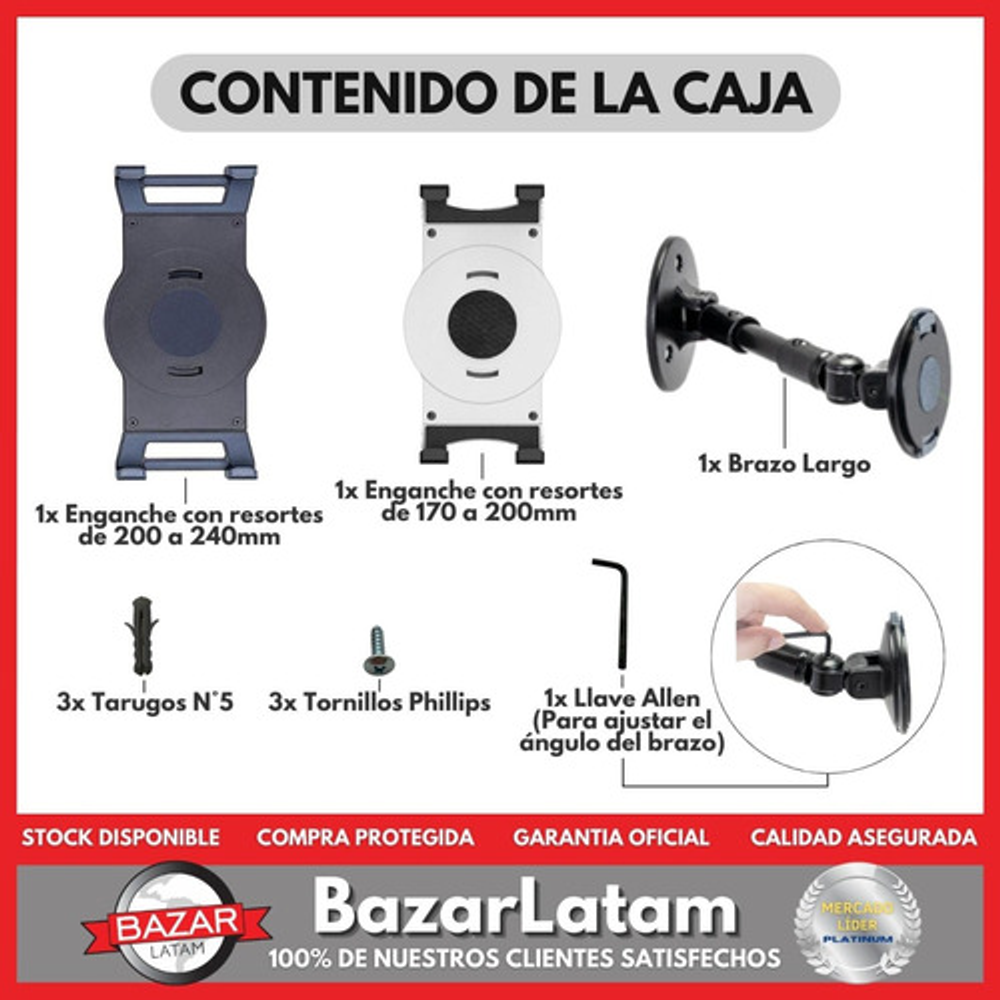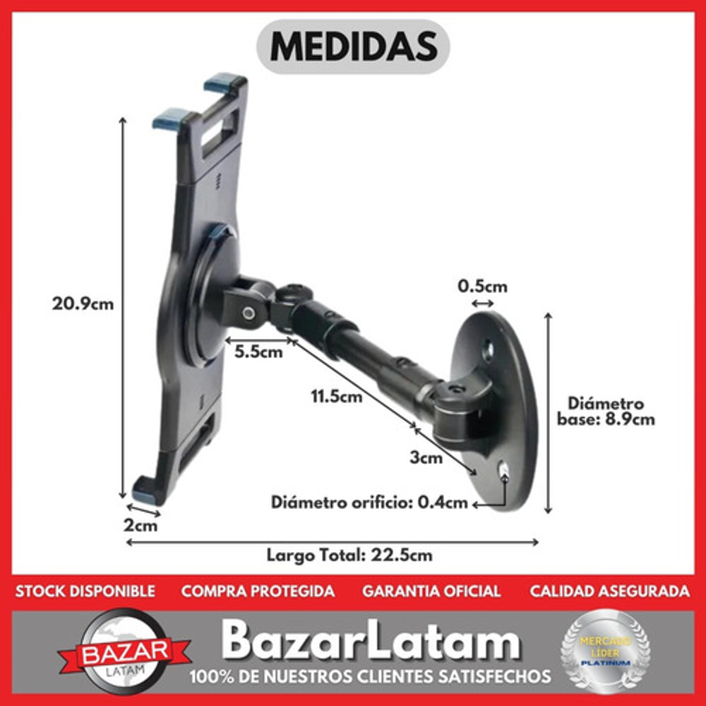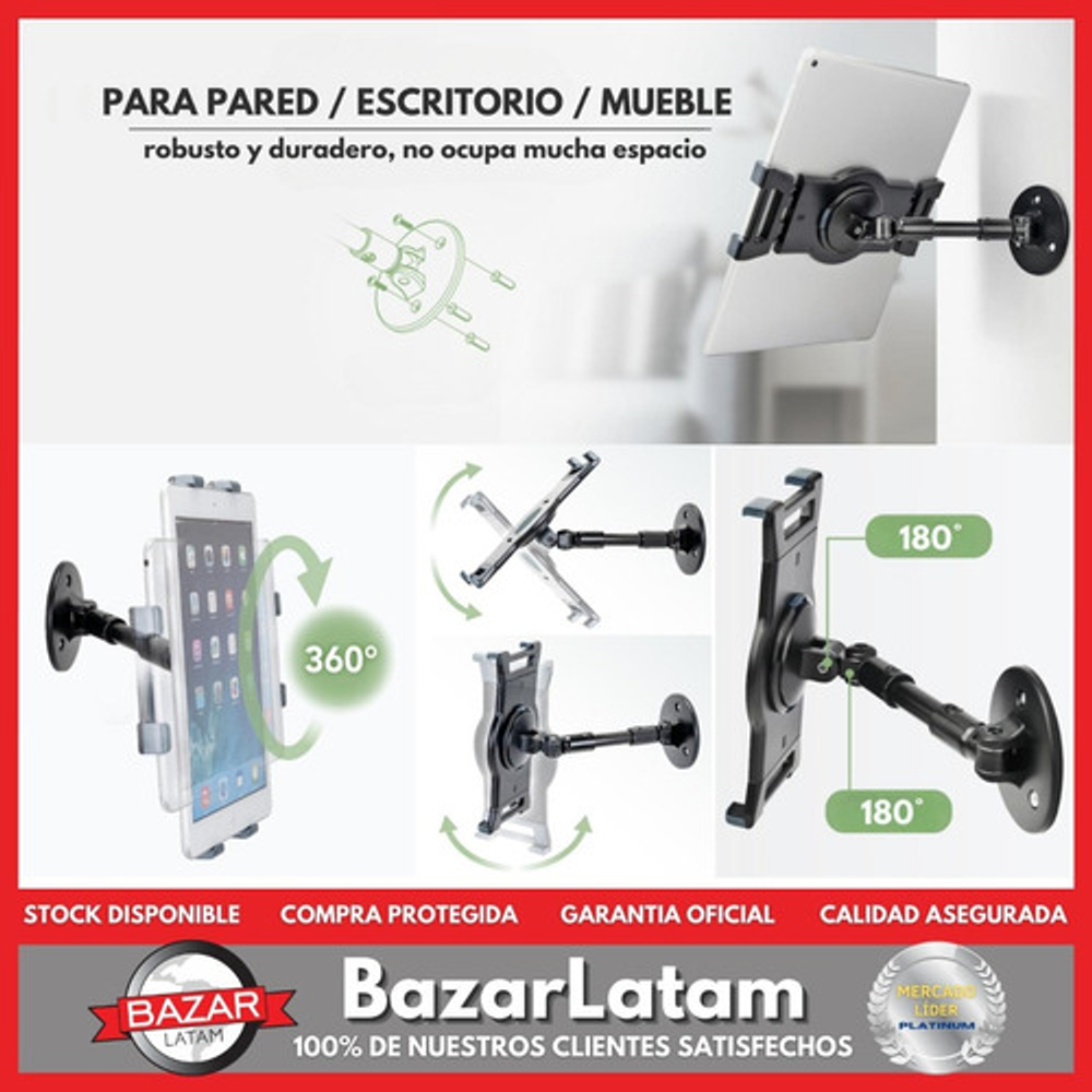 • Nuestro soporte se adapta a tablets cuyo lado tenga entre 170 mm y 240 mm, abarcando una amplia variedad de dispositivos. • Flexibilidad Total: Disfruta de una experiencia visual incomparable con una rotación completa de 360°, permitiéndote ajustar la pantalla según tus preferencias. • Ángulo Perfecto: Inclina la pantalla 180° hacia arriba y abajo, así como 180° hacia la izquierda y derecha, para encontrar el ángulo ideal tanto para el trabajo como para el entretenimiento. • Instalación Sencilla: Olvídate de las complicaciones. Nuestro soporte cuenta con un sistema de abrazadera único que facilita su colocación y remoción rápida y sencilla. • Variedad de Montajes: Fija el soporte a la pared para ahorrar espacio y lograr una vista óptima en cualquier habitación. O atorníllalo a muebles, mesas y mostradores para aún más versatilidad. • Kit de Instalación Completo: Incluye 3 tarugos de pared N°5 y tornillos, permitiéndote comenzar a usar el soporte sin demoras. • Diseño Elegante: Con una distancia mínima de 7.5 cm a la pared y una distancia máxima de 20.5 cm, mantiene un perfil estilizado que se adapta perfectamente a cualquier entorno sin ocupar espacio innecesario.