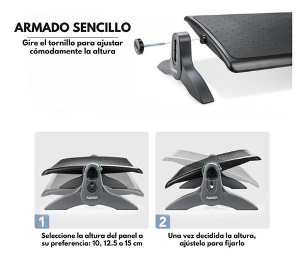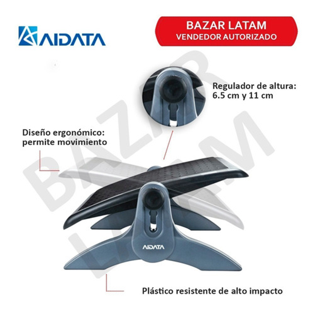 El Reposapiés de Aidata favorece una correcta posición del cuerpo, ayudando a reducir la tensión y la fatiga de las piernas, la espalda y el cuello. El reposapies favorece la circulación sanguínea y cuenta con topes antideslizantes para evitar que se deslice en el suelo.