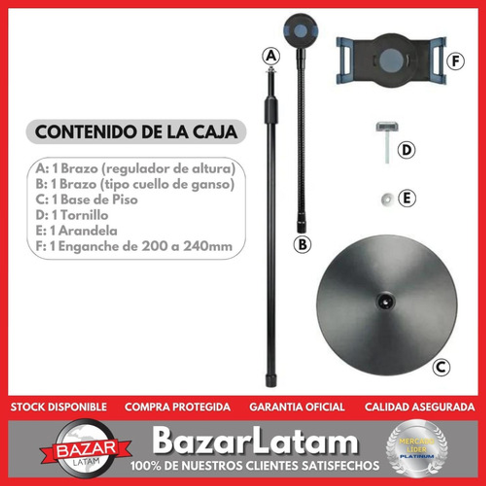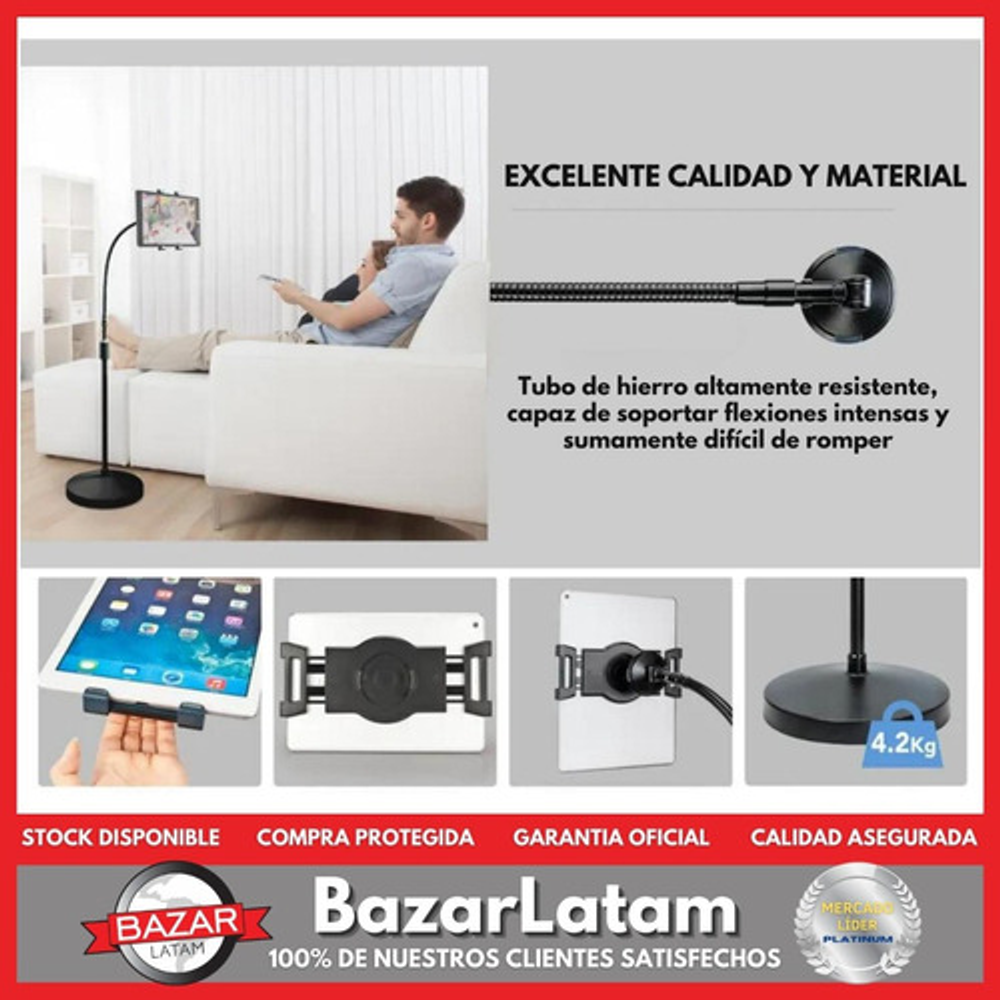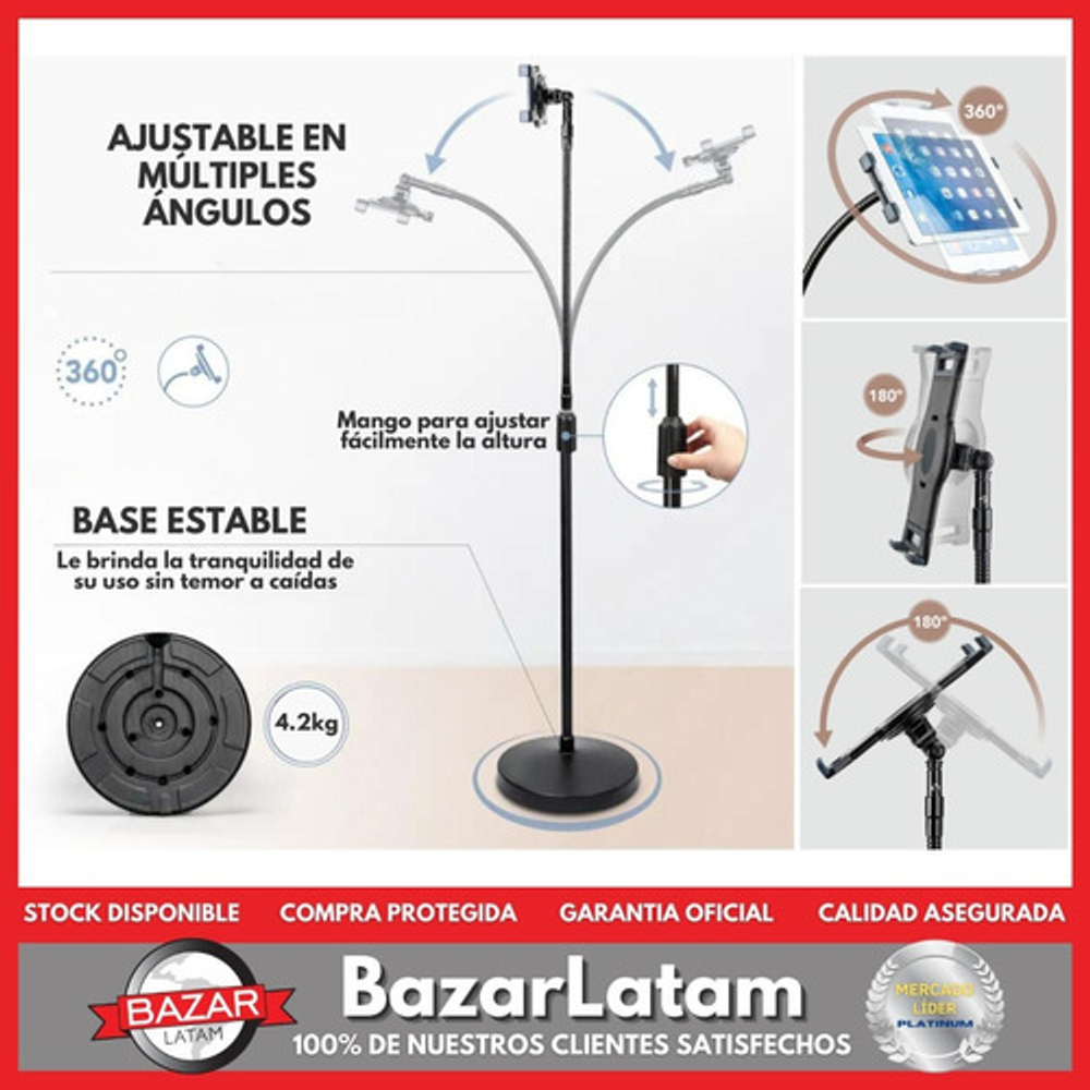 • Versatilidad en Tamaño: Compatible con las tablets que en uno de los lados mida entre 200 mm y 240 mm. • Ajuste Personalizado: Con un brazo flexible tipo cuello de ganso de 58 cm, logra el ángulo de visión perfecto. Además, el poste ajustable permite una altura de 71 cm a 127 cm. • Libertad de Movimiento: Gira 360º y se inclina 180° hacia arriba, abajo, izquierda y derecha, adaptándose a tus necesidades. • Para Diversos Entornos: Ideal para oficinas y uso doméstico, se adapta a cualquier lugar donde necesites trabajar o disfrutar de tu tablet. • Rango de Altura: Desde una altura mínima de 133 cm hasta una máxima de 185 cm.