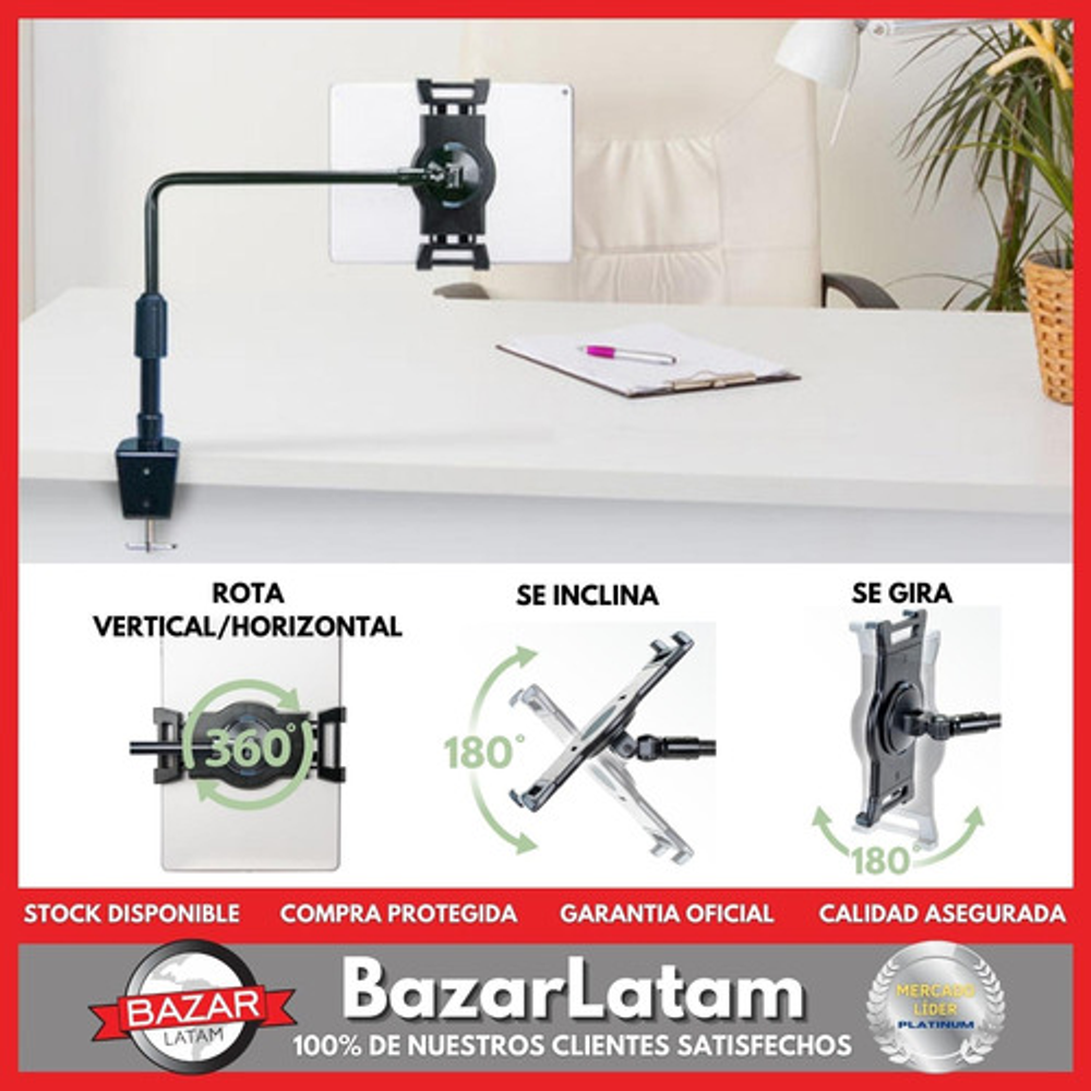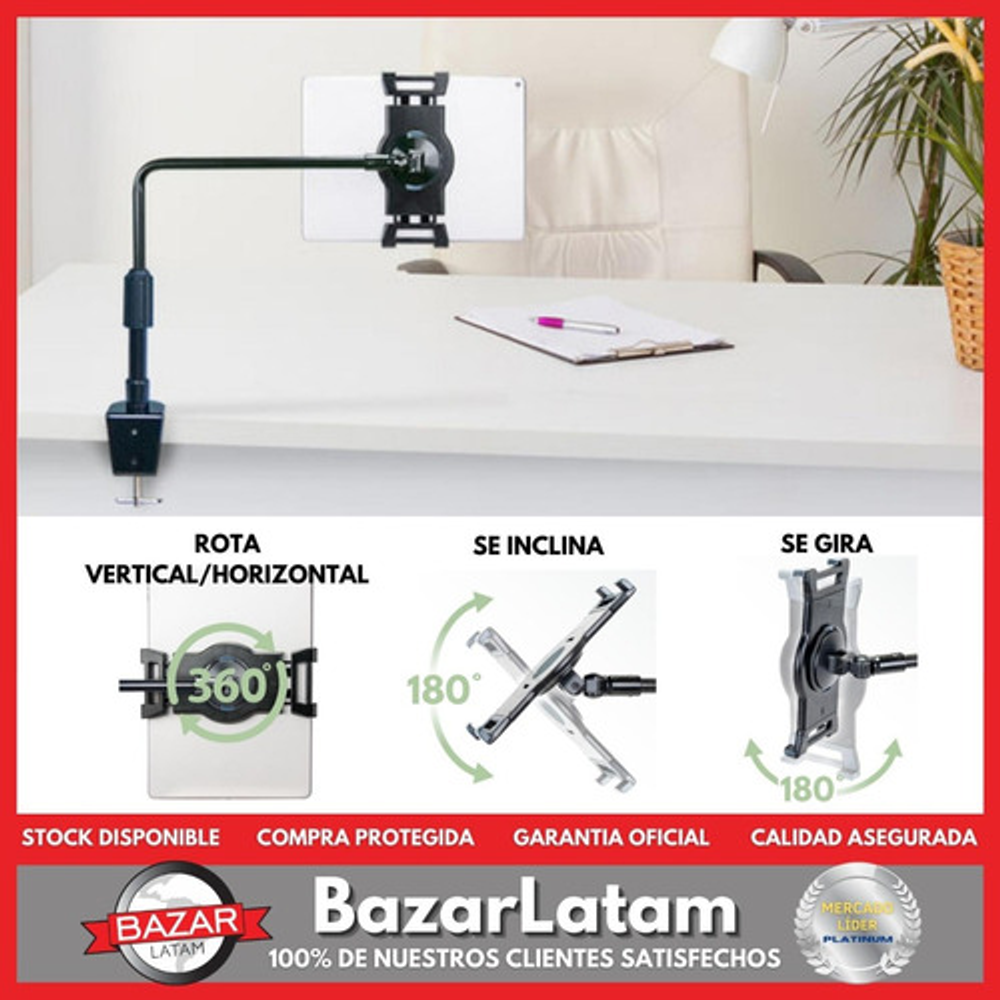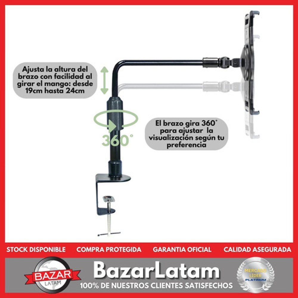 • Nuestro soporte se adapta a tablets que al menos uno de sus lados tenga entre 170 mm y 240 mm, abarcando una amplia variedad de dispositivos. • Altura ajustable: desde 19cm a 24cm, el poste ajustable te permite ajustar el ángulo de visión con facilidad. • Con un brazo de 37 cm de longitud, puedes colocar la tablet donde desees. • Ángulos personalizados: Disfruta de la libertad de ajustar la visión con rigidez perfecta. Gira 360º, inclínalo 180° hacia arriba y abajo, y también 180° hacia la izquierda y derecha. • Construcción robusta: Fabricado con una estructura metálica duradera y enganches de policarbonato resistente para una larga vida útil. • Fácil sujeción: La abrazadera de metal con revestimiento de goma protege tu escritorio y ofrece una sujeción firme hasta 5.5 cm de ancho.