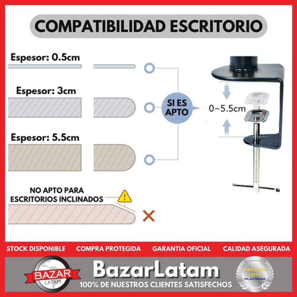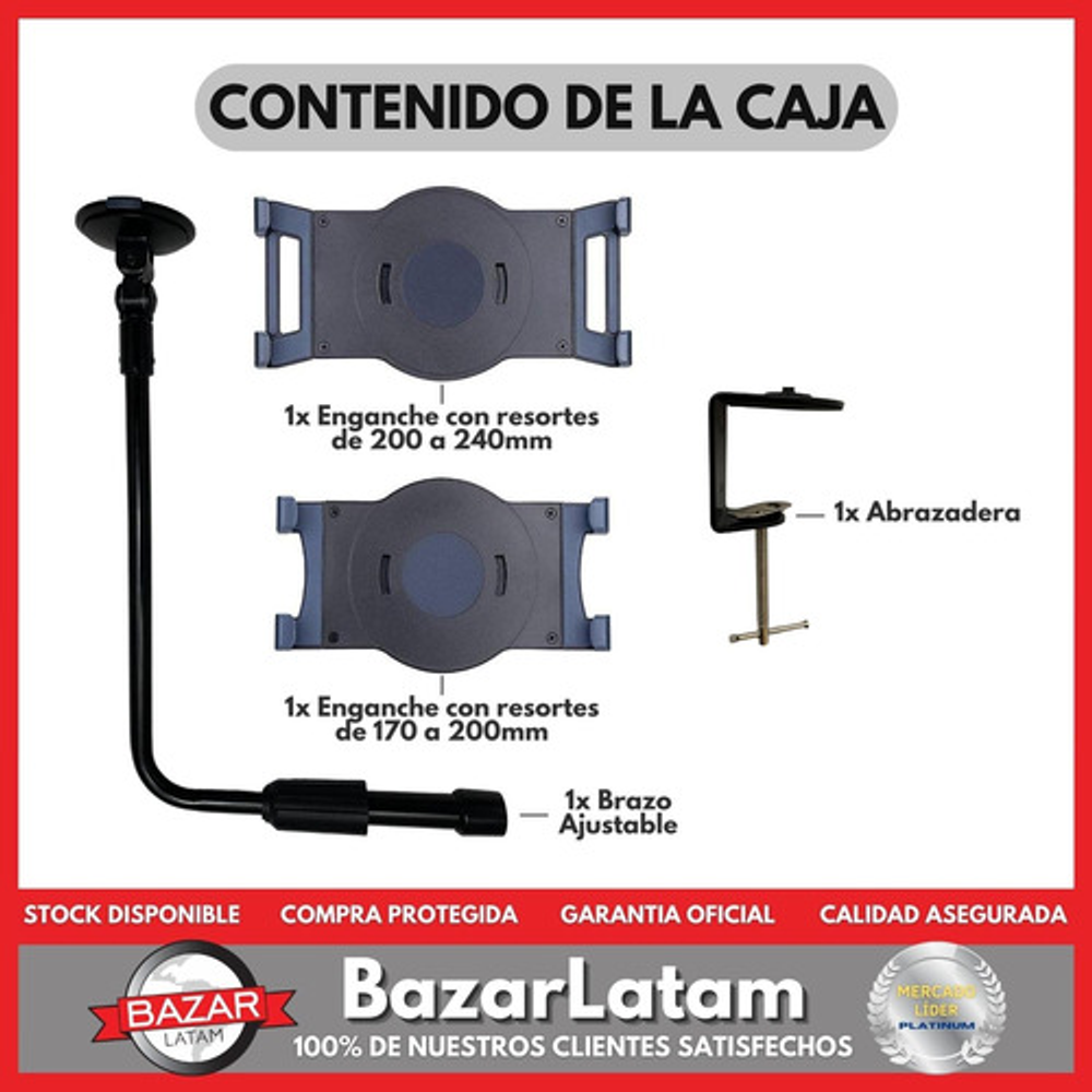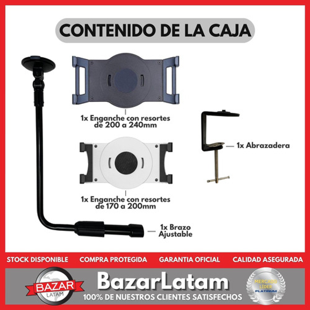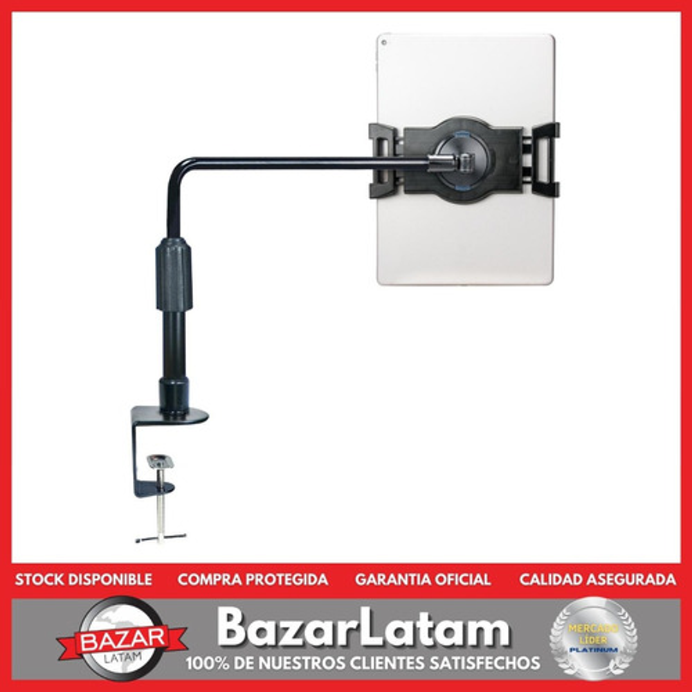 • Nuestro soporte se adapta a tablets que al menos uno de sus lados tenga entre 170 mm y 240 mm, abarcando una amplia variedad de dispositivos. • Altura ajustable: desde 19cm a 24cm, el poste ajustable te permite ajustar el ángulo de visión con facilidad. • Con un brazo de 37 cm de longitud, puedes colocar la tablet donde desees. • Ángulos personalizados: Disfruta de la libertad de ajustar la visión con rigidez perfecta. Gira 360º, inclínalo 180° hacia arriba y abajo, y también 180° hacia la izquierda y derecha. • Construcción robusta: Fabricado con una estructura metálica duradera y enganches de policarbonato resistente para una larga vida útil. • Fácil sujeción: La abrazadera de metal con revestimiento de goma protege tu escritorio y ofrece una sujeción firme hasta 5.5 cm de ancho.