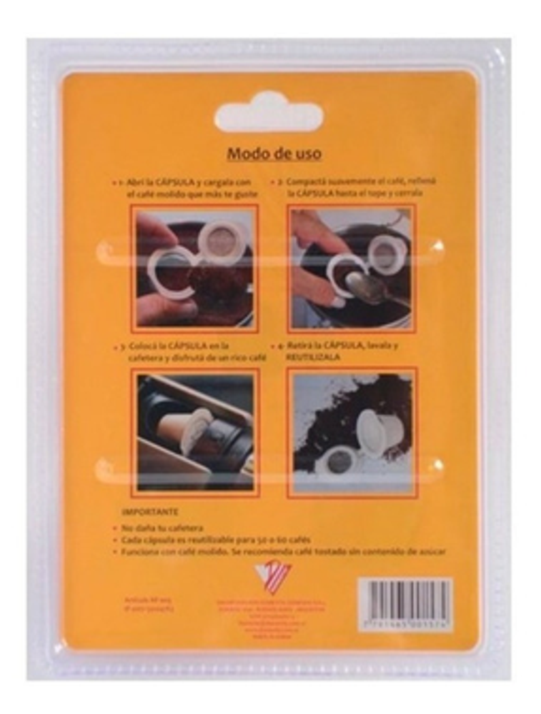 ESPECIFICACIONES Y CARACTERÍSTICAS -Cápsulas vacías de plástico con filtro de acero inoxidable -Utilizalas con el café molido que más te guste (preferentemente tostado, sin contenido de azúcar) -Para lograr un café espumoso utilizar café molido para máquina express -Reutilizables por más de 50 veces (retirar, lavar y reutilizar) -Economiza la preparación de café en estas máquinas -Instrucciones de uso al dorso del blister