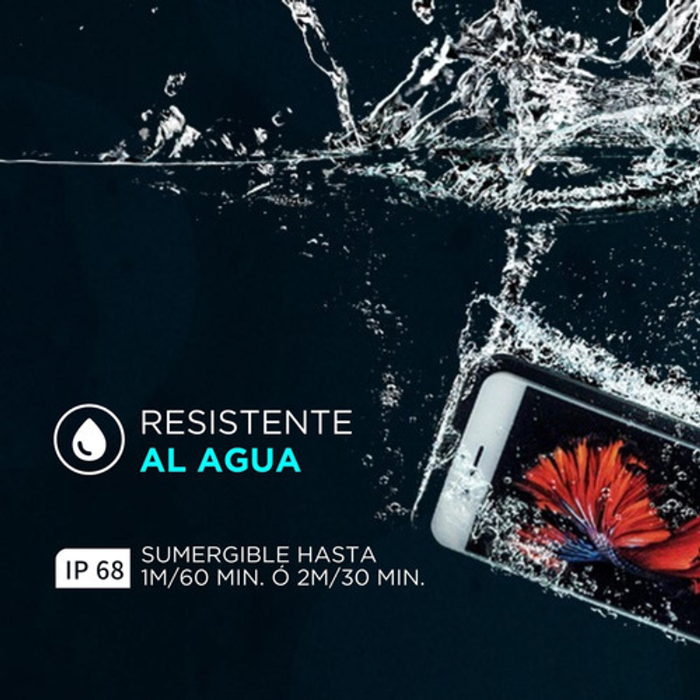 Exclusivo diseño delgado y ligero. Sumergible hasta un 1m por 60 minutos o 2m por 30 minutos. Ip68. Resistente a golpes, prueba de caida de hasta 1.2 metros. Ip68. Resistente a rayones. Resistente al polvo, arena, barro, nieve y hielo. Acceso a carga y sincronización a través del puerto USB. Acceso a auriculares. Permite la identificación a través de huella digital. Facil de colocar y quitar.