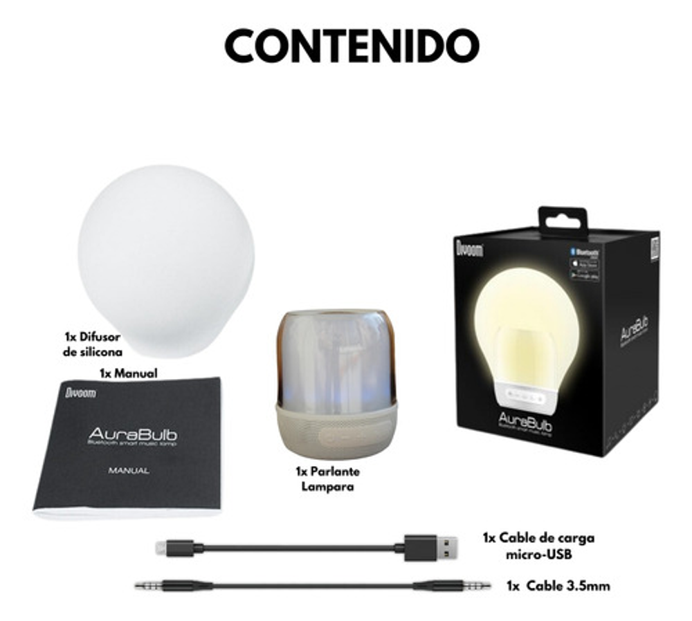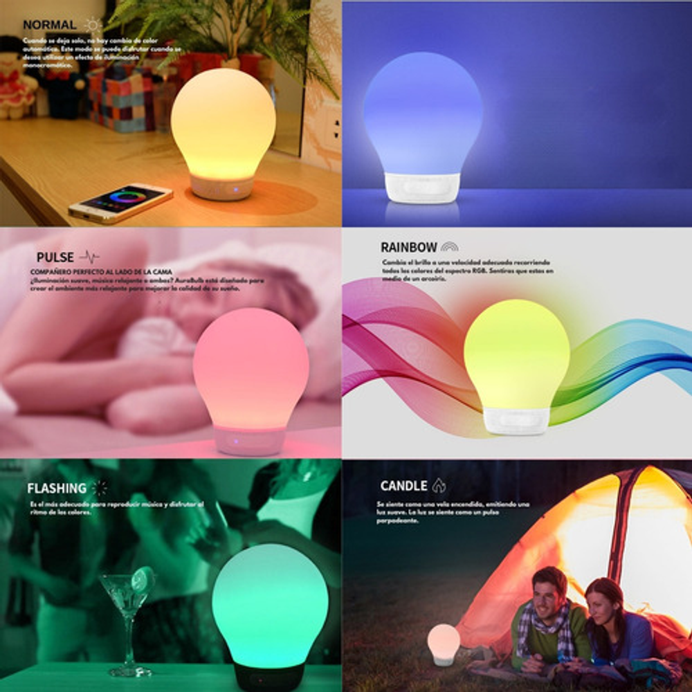 -Lámpara con tecnología inalámbrica Bluetooth 4.0. -Altavoz con 5 Watts de potencia -Aplicación móvil para configurar el color de la lampara 5 efectos de iluminación diferentes. -Micrófono para función manos-libres. -Se usa como alarma con sonidos, efectos y colores personalizados desde la App para iPhone y Android •Ideal para sesiones de cromoterapia. -Batería 1200mA, hasta 6 horas de autonomía