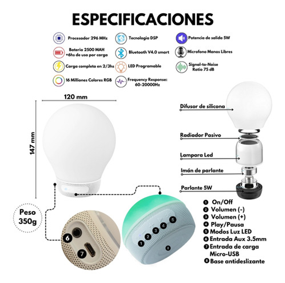 ESPECIFICACIONES TÉCNICAS -Dimensiones: 120 mm x 120 mm x 147 -Peso: 350g -Potencia de salida: 5W RMS -Nivel de ruido (SNR): =75 dB -Capacidad batería: 1200 mAh -Voltaje batería: 3.7 V -Tiempo de carga Batería: 2 – 3 horas •Rango de alcance: 10 metros -Compatibilidad Bluetooth :Bluetooth V4.0 -Material Lámpara: Silicona -Tiempo duración batería: Más de 6 horas -Tamaño Driver: 2" Full