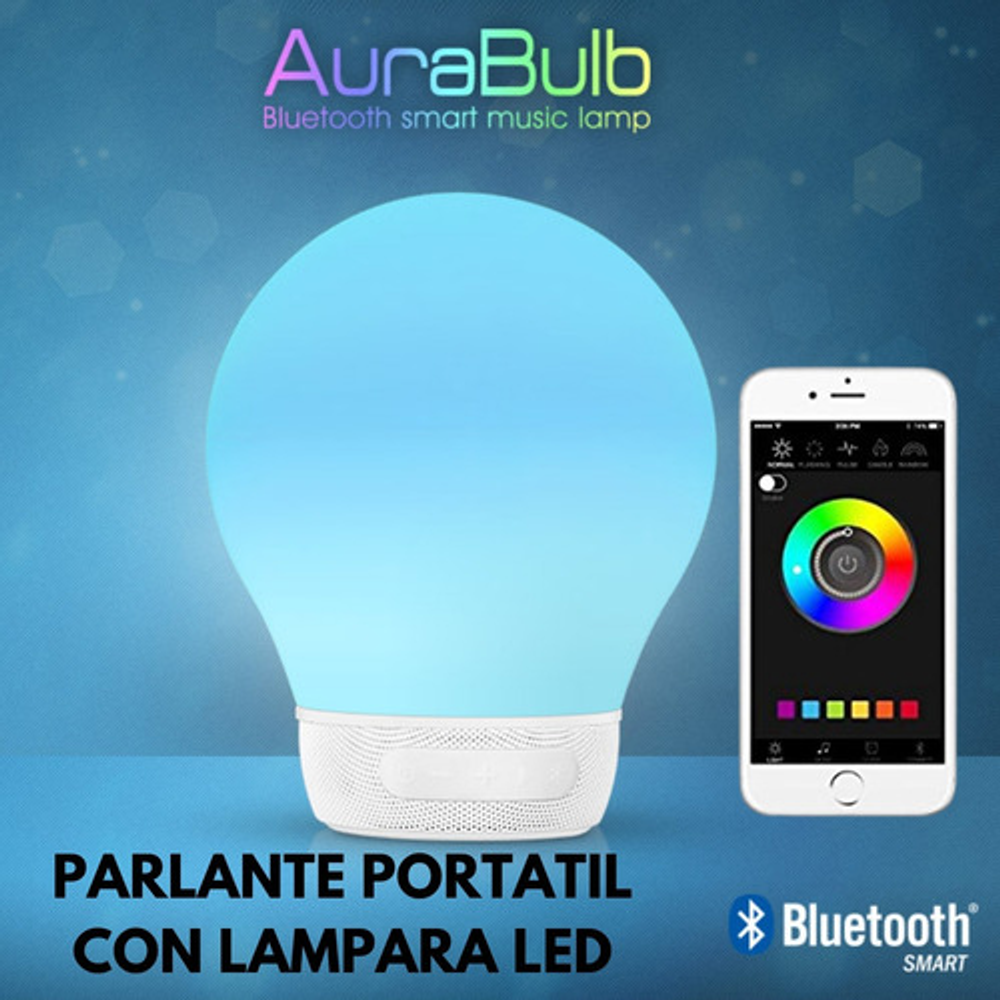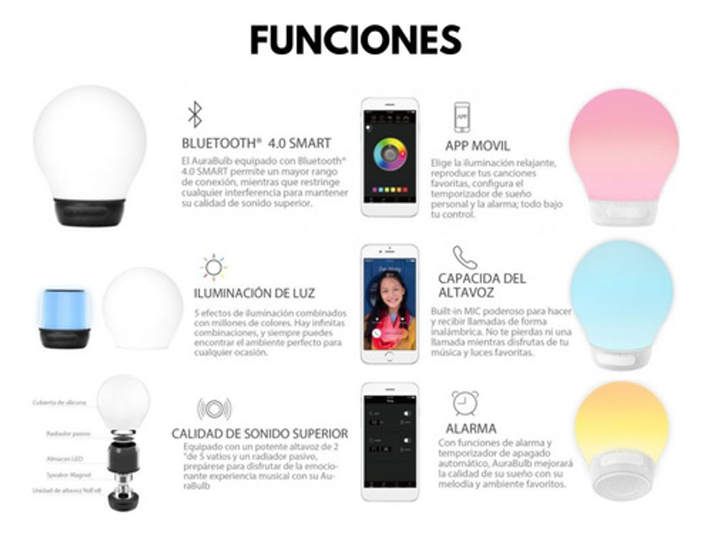 -Lámpara con tecnología inalámbrica Bluetooth 4.0. -Altavoz con 5 Watts de potencia Aplicación móvil para configurar el color de la lampara 5 efectos de iluminación diferentes. -Micrófono para función manos-libres. -Se usa como alarma con sonidos, efectos y colores personalizados desde la App para iPhone y Android •Ideal para sesiones de cromoterapia. -Batería 1200mA, hasta 6 horas de autonomía