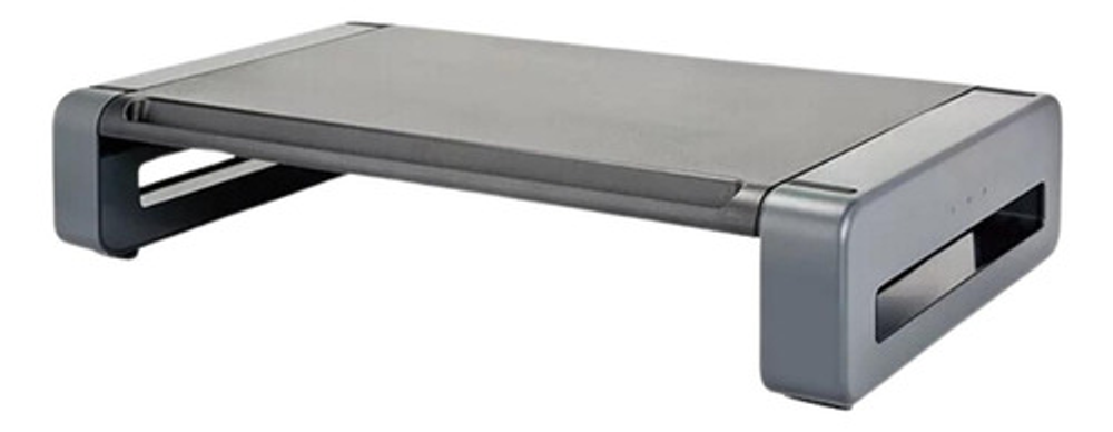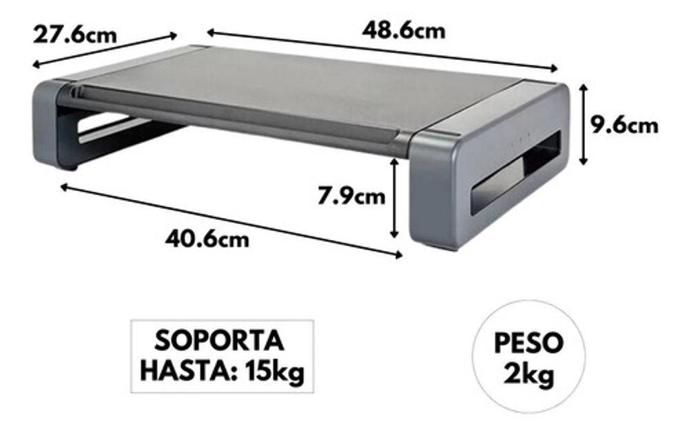 Eleva el monitor al nivel de los ojos para una visualización cómoda. Tiene capacidad para monitores de hasta 24 ", impresoras u otras máquinas de oficina. La ranura frontal contiene la mayoría de las tablet y smartphone. Diseño apilable Tamaño: 48 x 27 x 8 cms.
