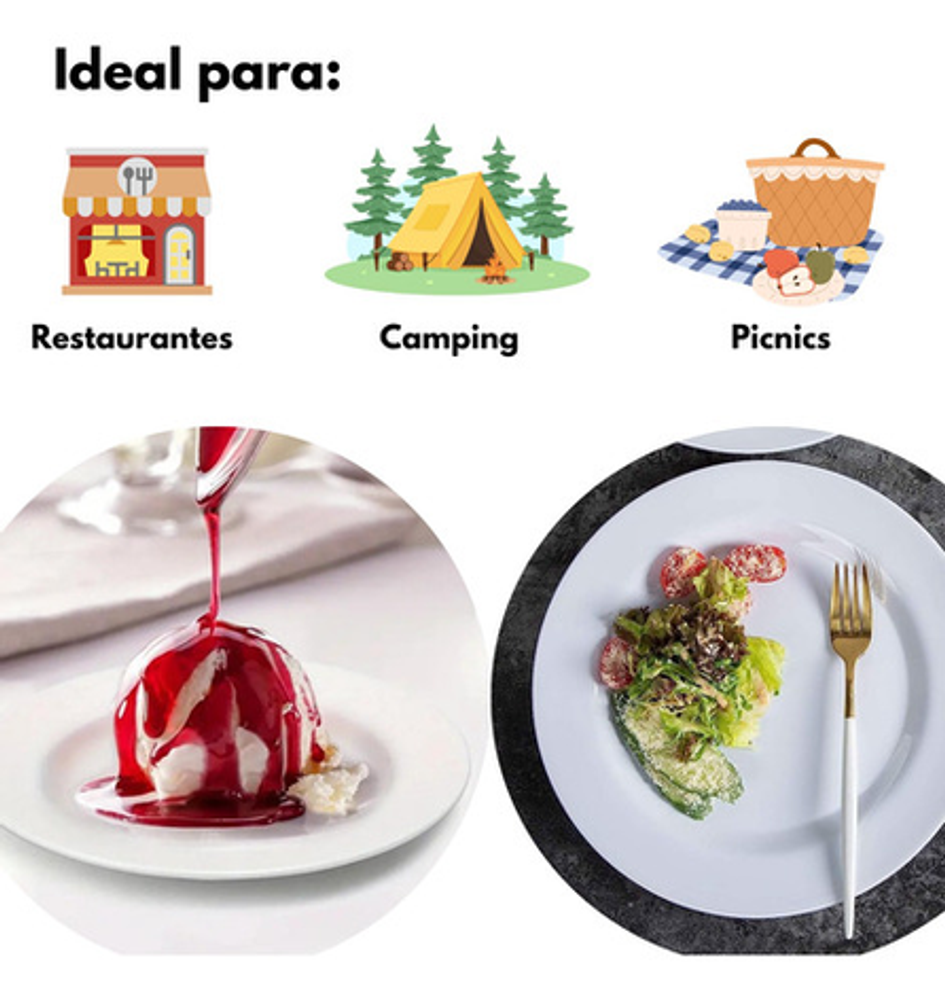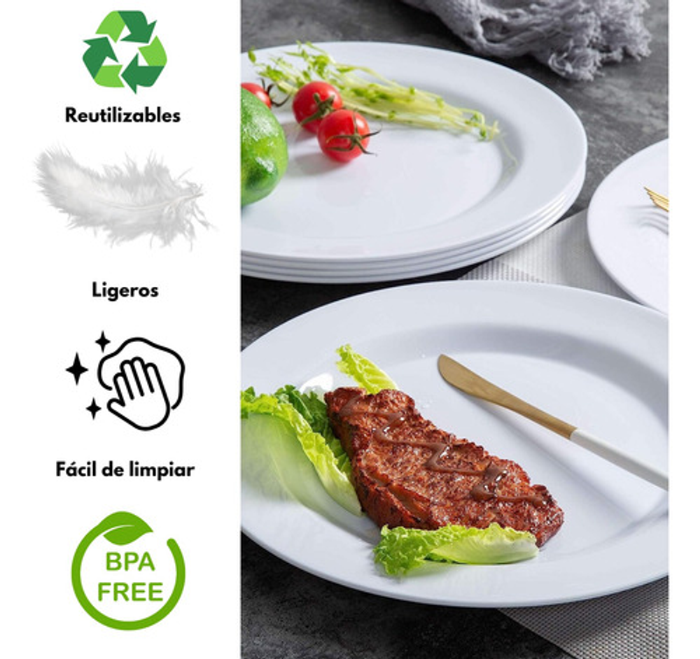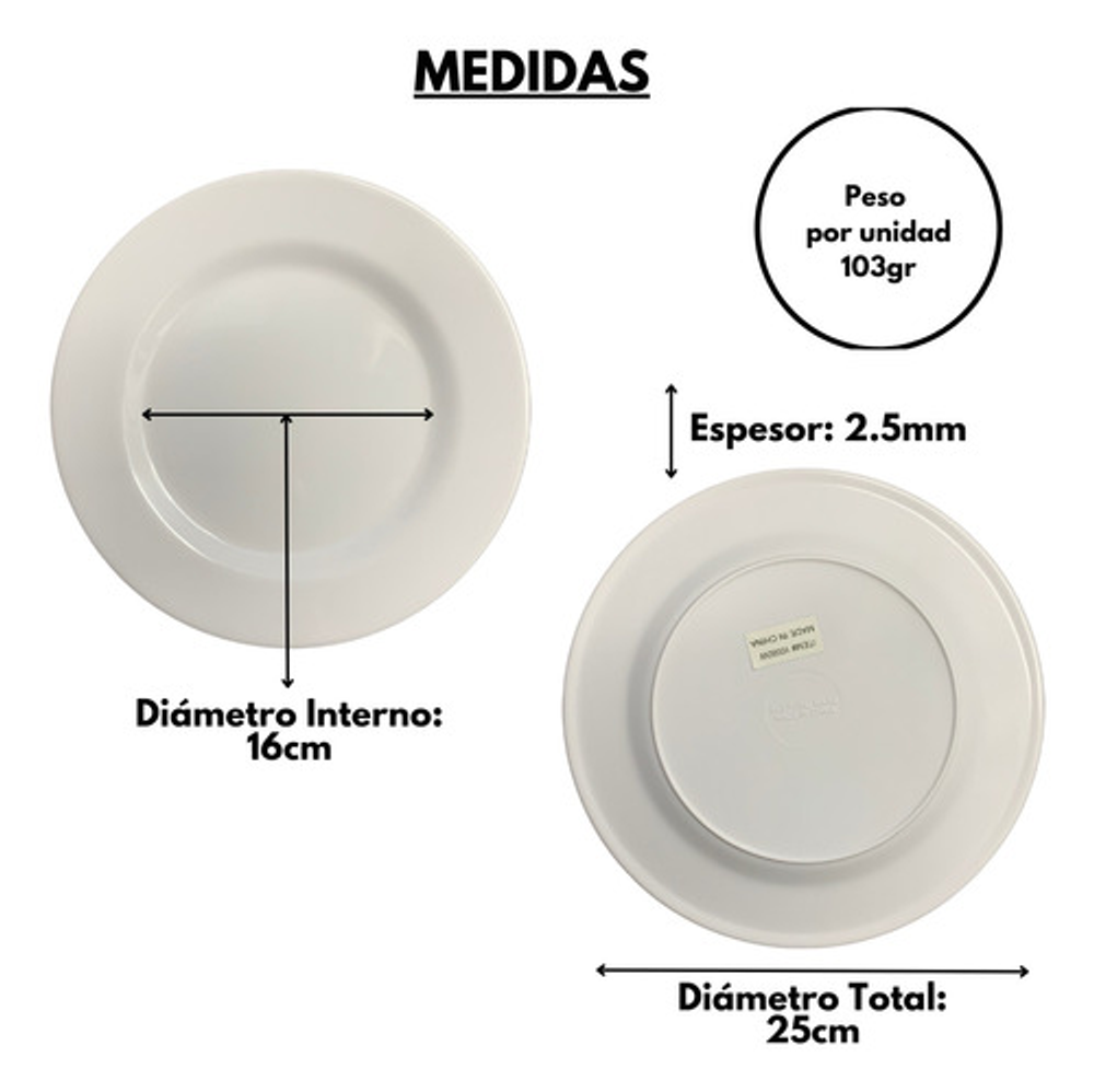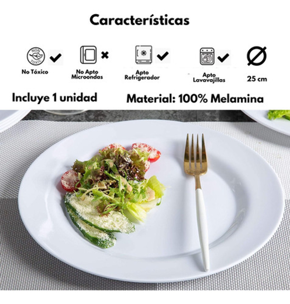 • Diámetro: 25cm. • Espesor: 2.5cm. • Peso: 104 gramos. • Marca: Domestic. • Material: 100% Melamina. • No Apto para microondas, sino aptos para lavavajillas. • No Tóxico. • Apto refrigerador. • Fácil de apilar para ahorrar espacio si tienes un armario límite. • Ligero y resistente a la rotura, adecuado para fiestas, camping, picnic, boda, etc.