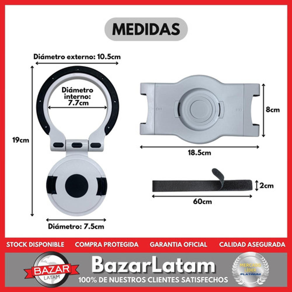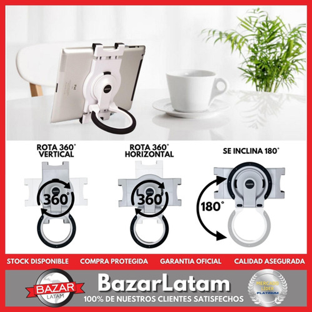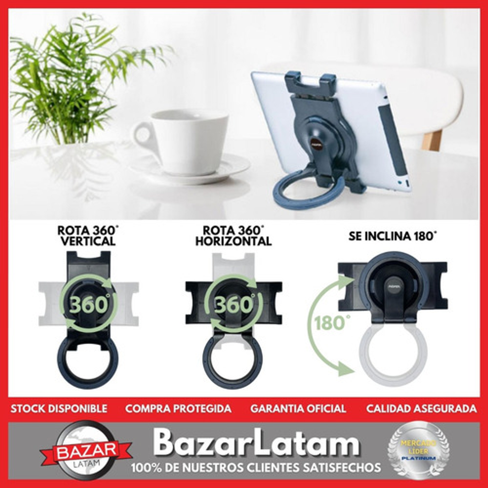 • Nuestro soporte se ajusta a tablets con un lado que mida entre 170 mm y 200 mm, lo que garantiza que se adapte a una amplia gama de dispositivos. • Flexibilidad total: Disfruta de una experiencia visual inigualable gracias a su capacidad de giro 360º, lo que te permite ajustar la pantalla a la posición perfecta para ti. • Angulación perfecta: Con una inclinación de 180° hacia arriba y abajo, puedes encontrar el ángulo ideal para ver contenido, trabajar o jugar con total comodidad. • Este versátil soporte se adapta a tu estilo de vida: úsalo en el escritorio, en la mesa o llévalo en la mano. También puedes colgarlo en la pared gracias a su estructura de aro. • Además, con la cinta de Velcro, puedes asegurarlo en el apoyacabezas del auto y disfrutar de tus películas y videos favoritos en movimiento. • Fácil de instalar: Olvídate de complicaciones. Nuestro soporte cuenta con un sistema único de abrazadera, lo que facilita su colocación y extracción de forma rápida y sencilla.