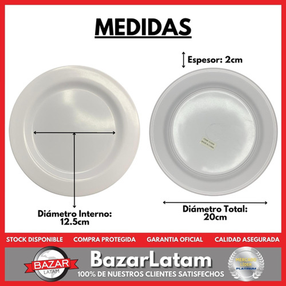 • Color: Blanco. • Diámetro: 20cm. • Espesor: 2cm. • Peso: 88 gramos. • Marca: Domestic. • Material: 100% Melamina. • No Apto para microondas, sino aptos para lavavajillas. • No Tóxico. • Apto refrigerador. • Fácil de apilar para ahorrar espacio si tienes un armario límite. • Ligero y resistente a la rotura, adecuado para fiestas, camping, picnic, boda, etc.