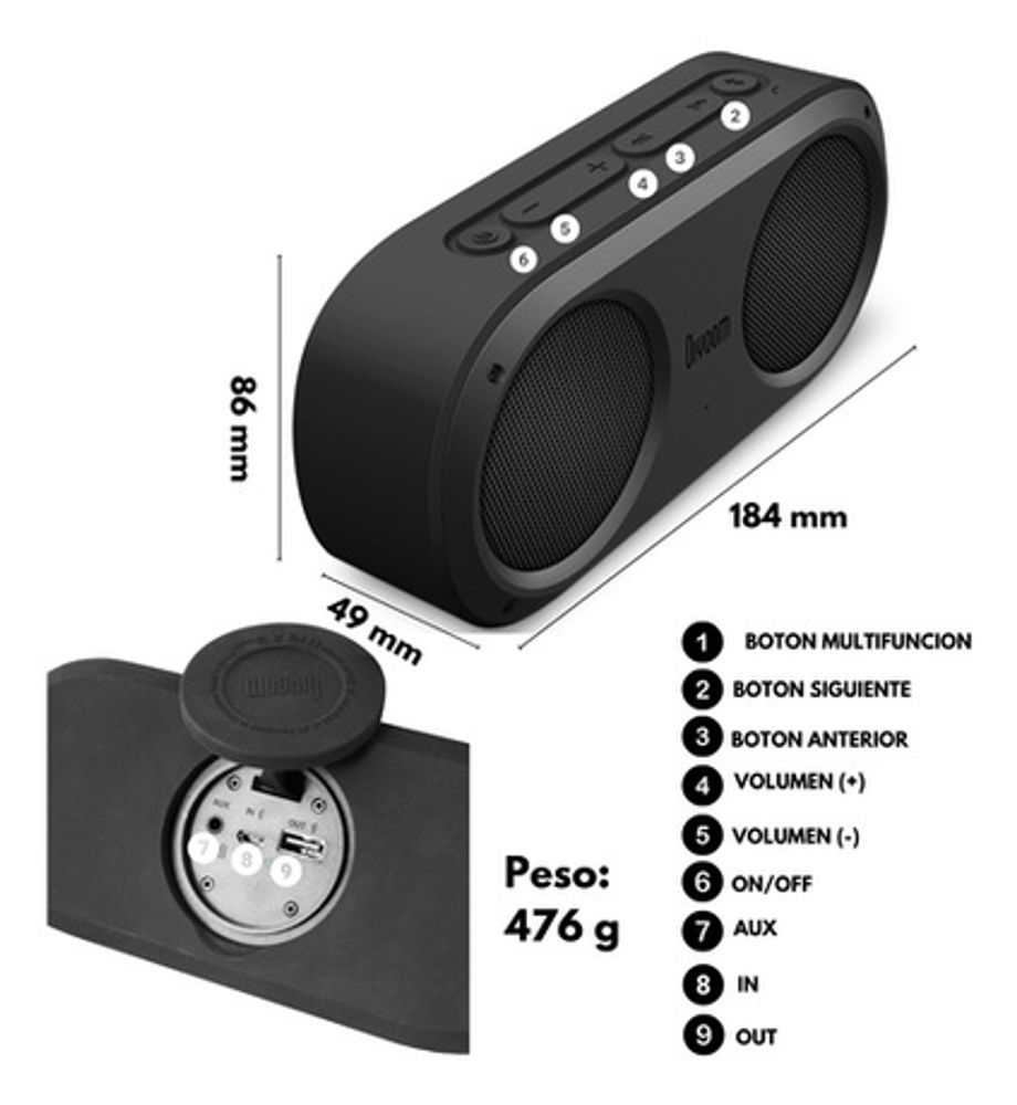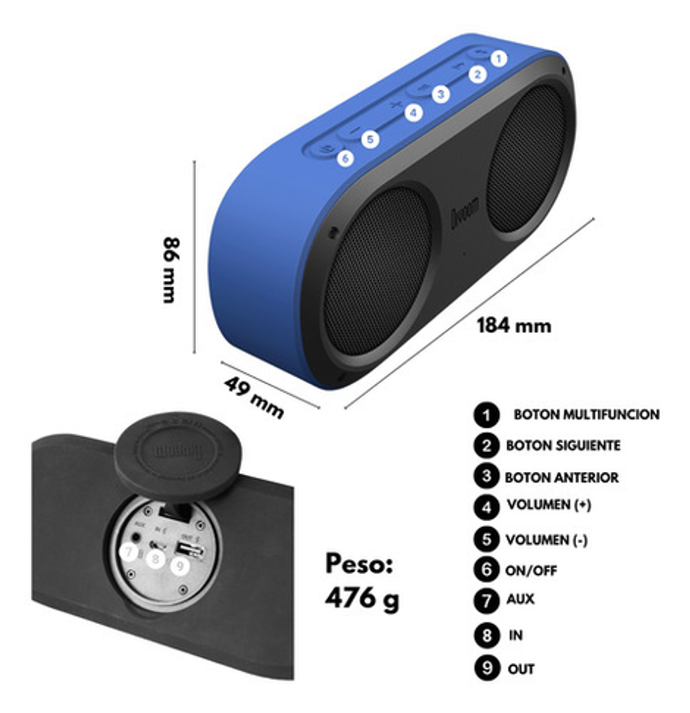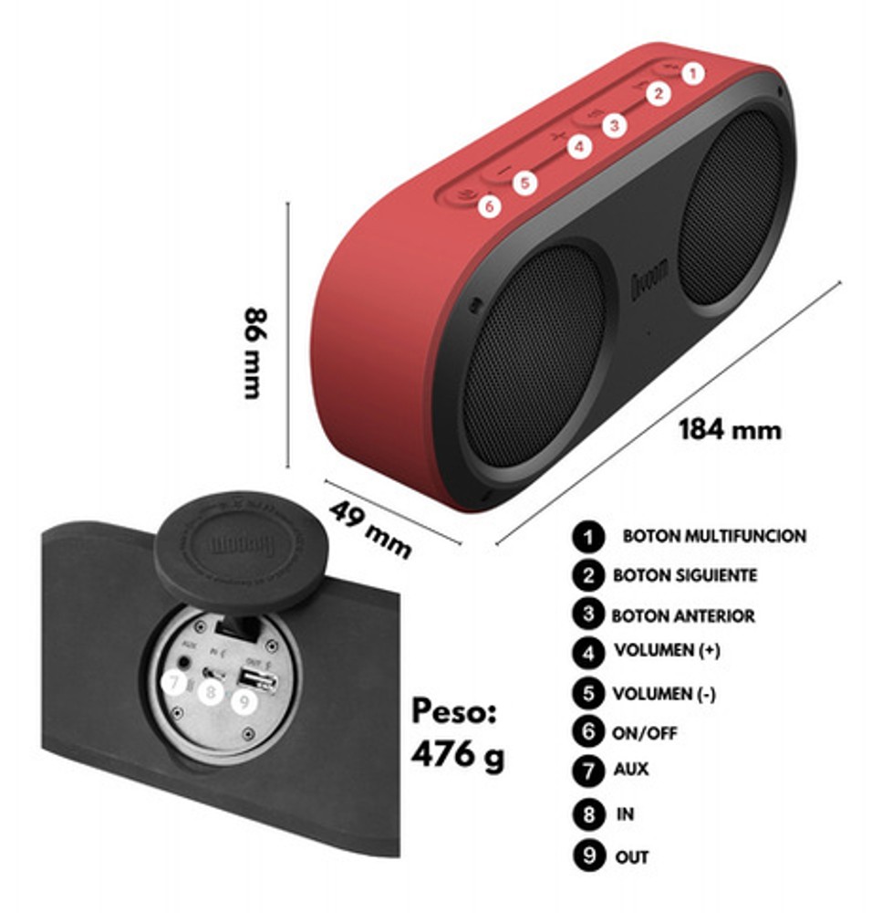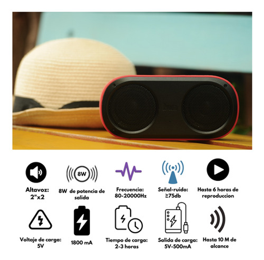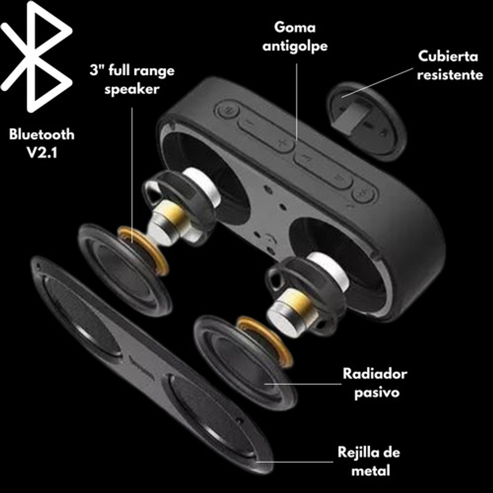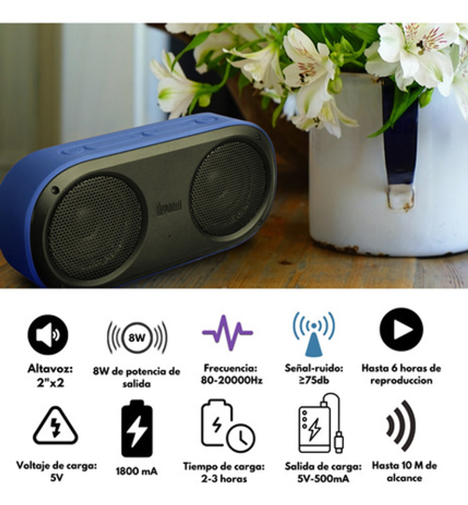 Dimensiones : 184 L x 49 W x 86 H Peso : 473 g Tamaño : 2'' x 2 Output power : 4 W x 2 Frecuencia : 80-20000Hz Signal-to-Noise Ratio : =75 dB Playback Time : Up to 6 hours Capacidad de la bateria: 1800 mAh Voltage de la bateria : 3.7 V Tiempo de carga : 2.5-3 h horas Rango Wireless :10 meters/33 feet Bluetooth: V2.1 Bluetooth Profile support : A2DP Stereo Talk Time : 6 horas Microphone sensitivity : -36 db