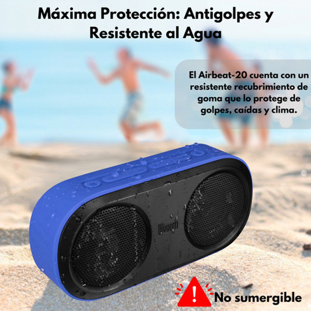 -A PRUEBA DE AGUA / IP44 -STEREO Y SONIDO POTENTE -COMPACTO PARA EL VIAJE / ULTRA COMPACTO Y DISEÑO DURABLE -MANOS LIBRES / DISFRITA DE UNA CONVERSACIÓN CON EL MICROFONO EN TU AIRBEAT 20 -CARGA MEDIANTE USB / BATERIA DE LI-ON DE 1800 MAH / HASTA 6 HORAS DE AUDIO