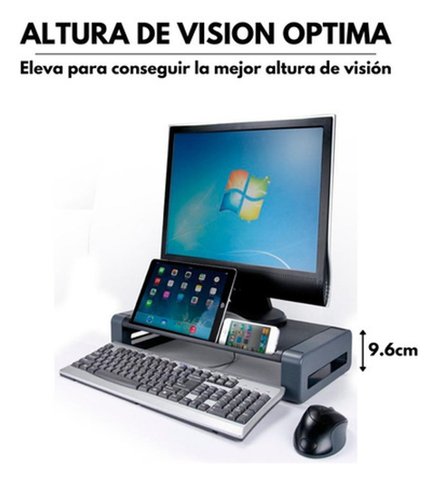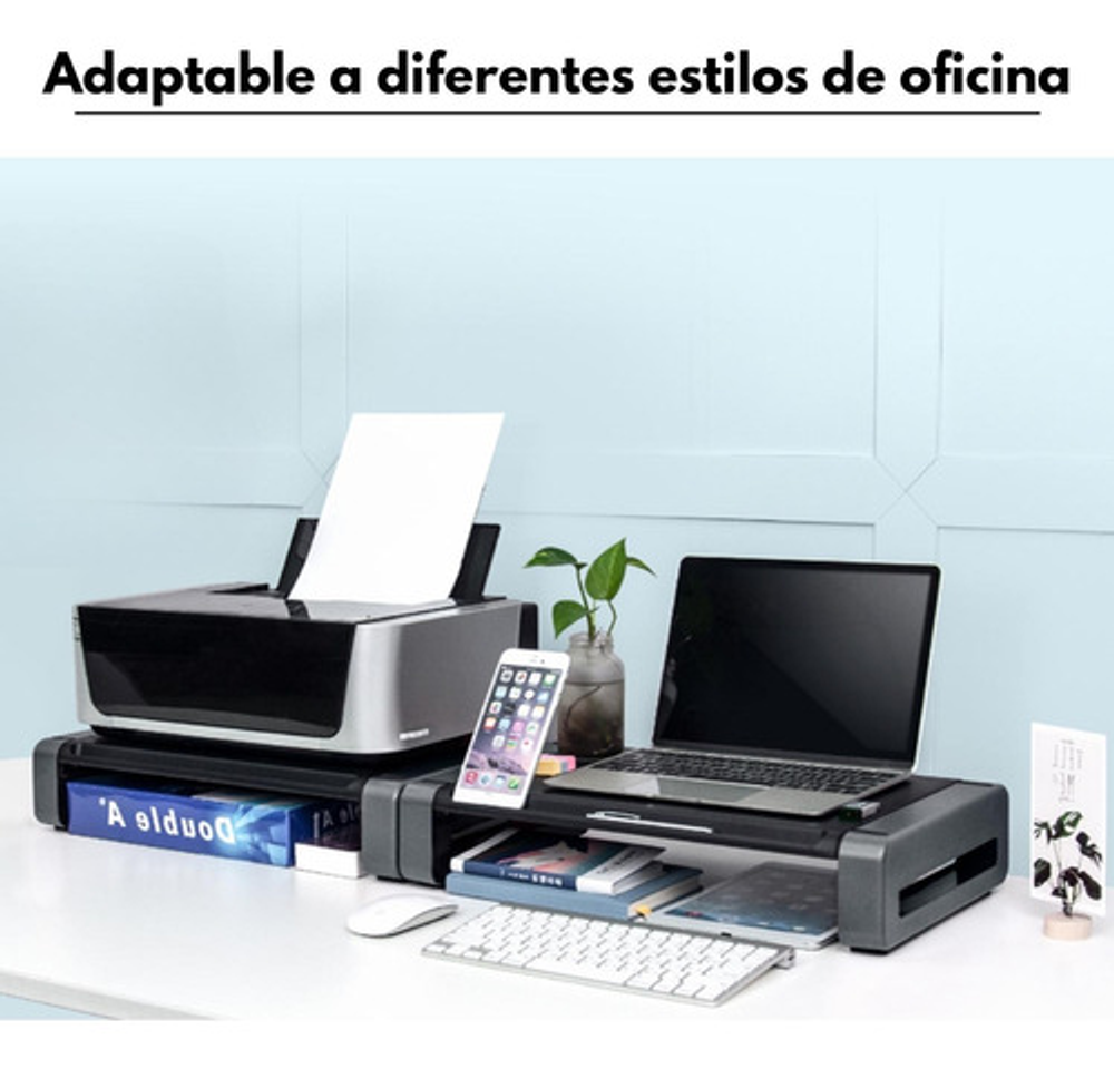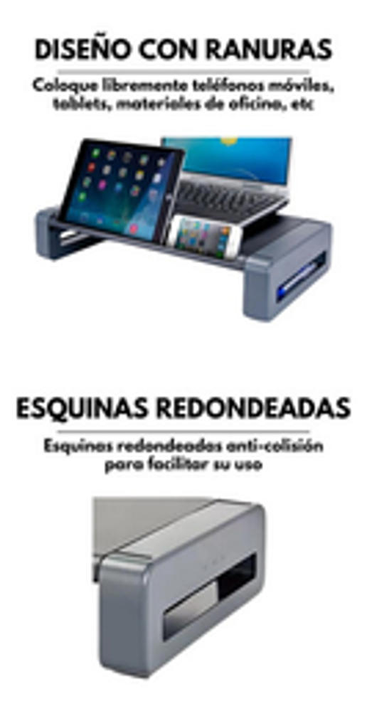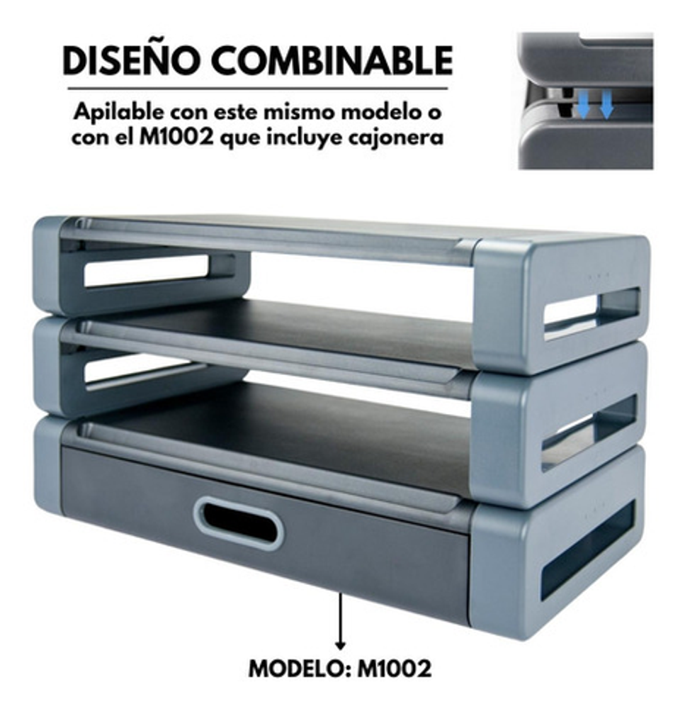 Eleva el monitor al nivel de los ojos para una visualización cómoda. Tiene capacidad para monitores de hasta 24 ", impresoras u otras máquinas de oficina. La ranura frontal contiene la mayoría de las tablet y smartphone. Diseño apilable Tamaño: 48 x 27 x 8 cms.