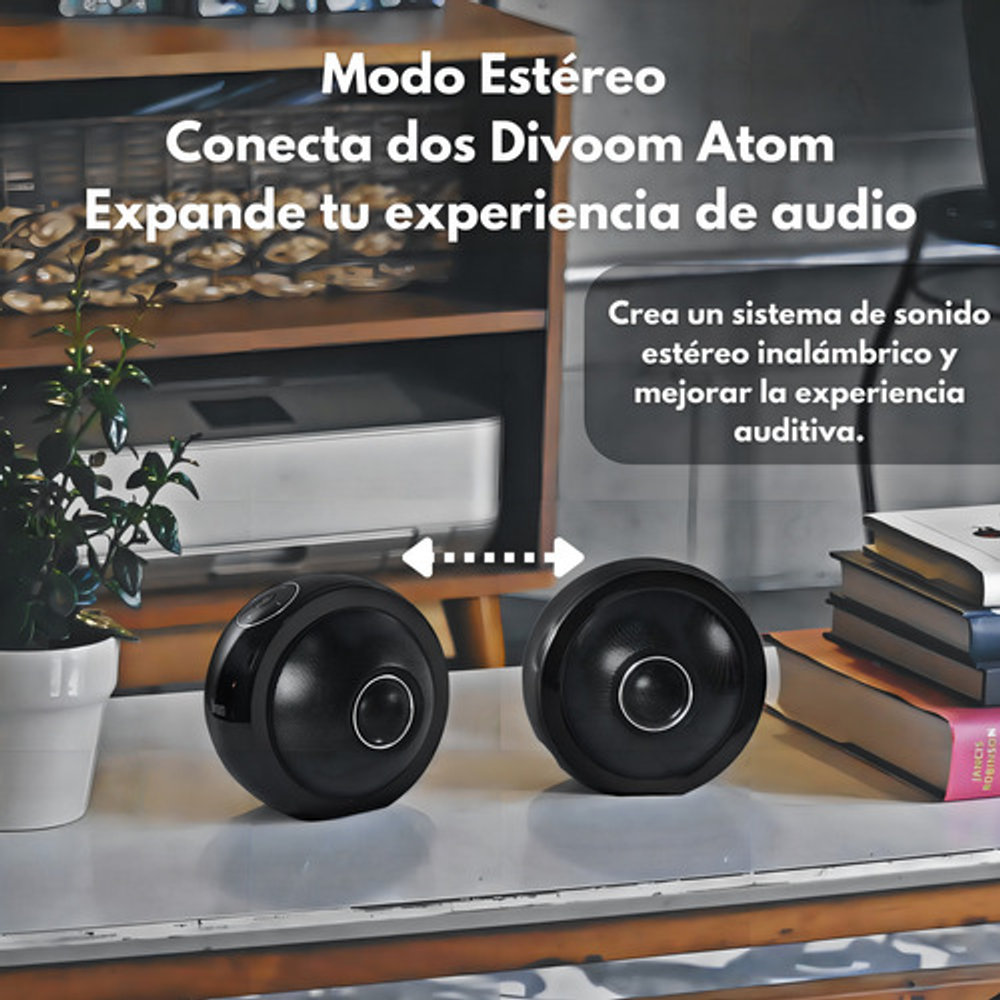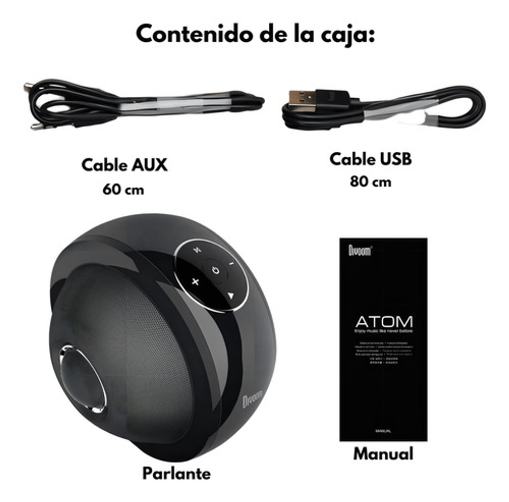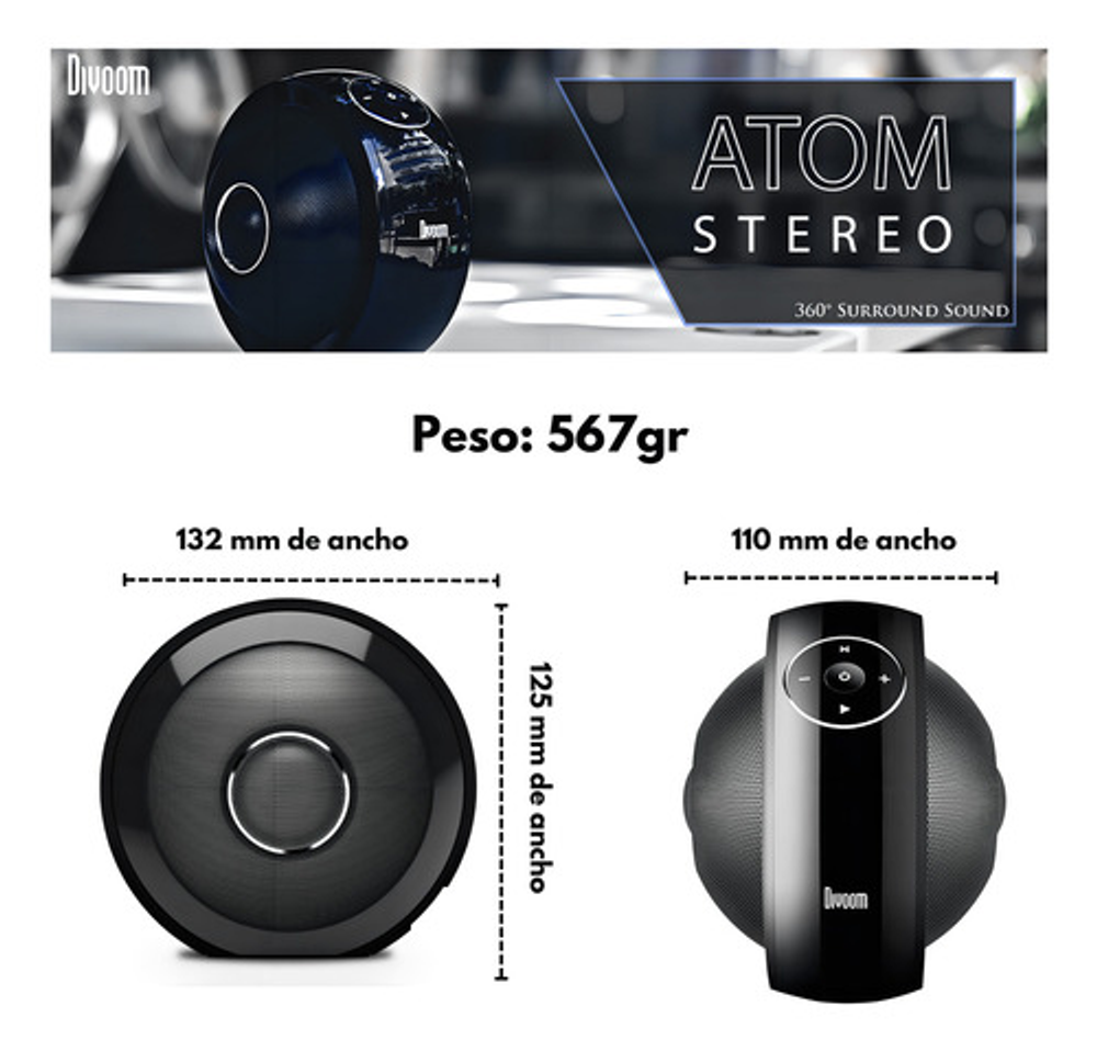 ATOM es un parlante portátil Bluetooth que se incorpora a la línea de gama alta de Divoom, de estilo y diseño exclusivo para uso en ambientes interiores (indooor) con 30 W de potencia y sonido en 360° que brinda una experiencia de audio omni-direccional. Con característica de conexión dual, permite conectarse a otro parlante Atom para duplicar la potencia de salida hasta 60 W entre ambos y brindar el mejor sonido estéreo al usuario. Panel botones touch (táctil).
