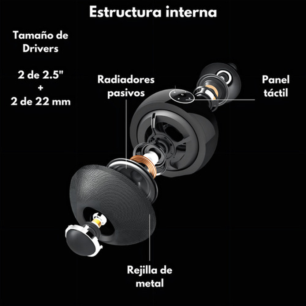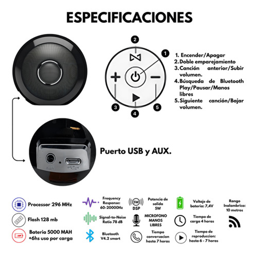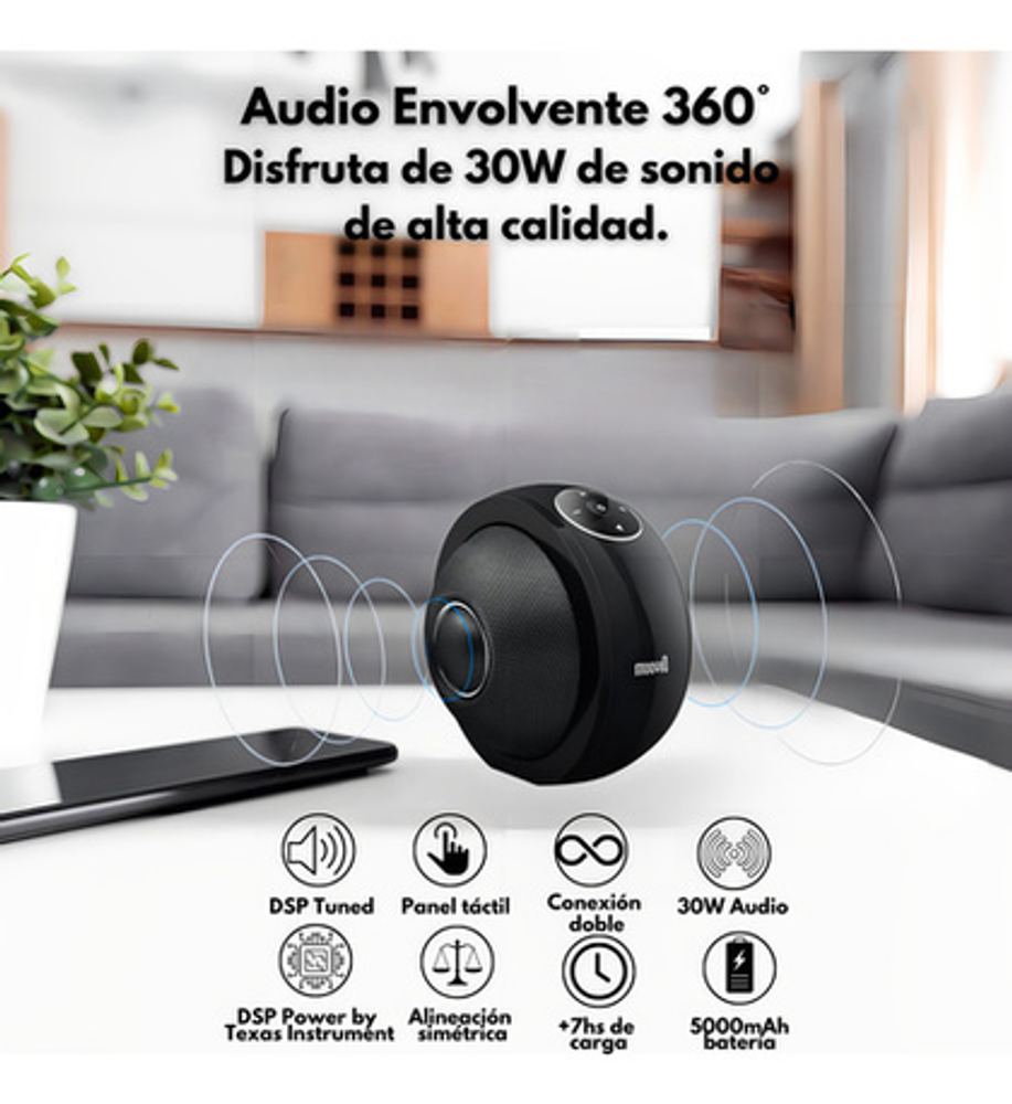 ESPECIFICACIONES TECNICAS: Dimensiones: 124 mm diametro Tamaño driver: 2,5" x 2 (full range) + 22 mm x 2 Potencia de salida: 30 W RMS Nivel de ruido (SNR): =78dB Capacidad batería: 5000 mAh Voltaje batería: 7.4 V Tiempo de carga Batería: 3-4 horas Tiempo de duración Batería: 6-7 horas Rango de alcance: Más de 10 metros Compatibilidad Bluetooth: Bluetooth V4.2