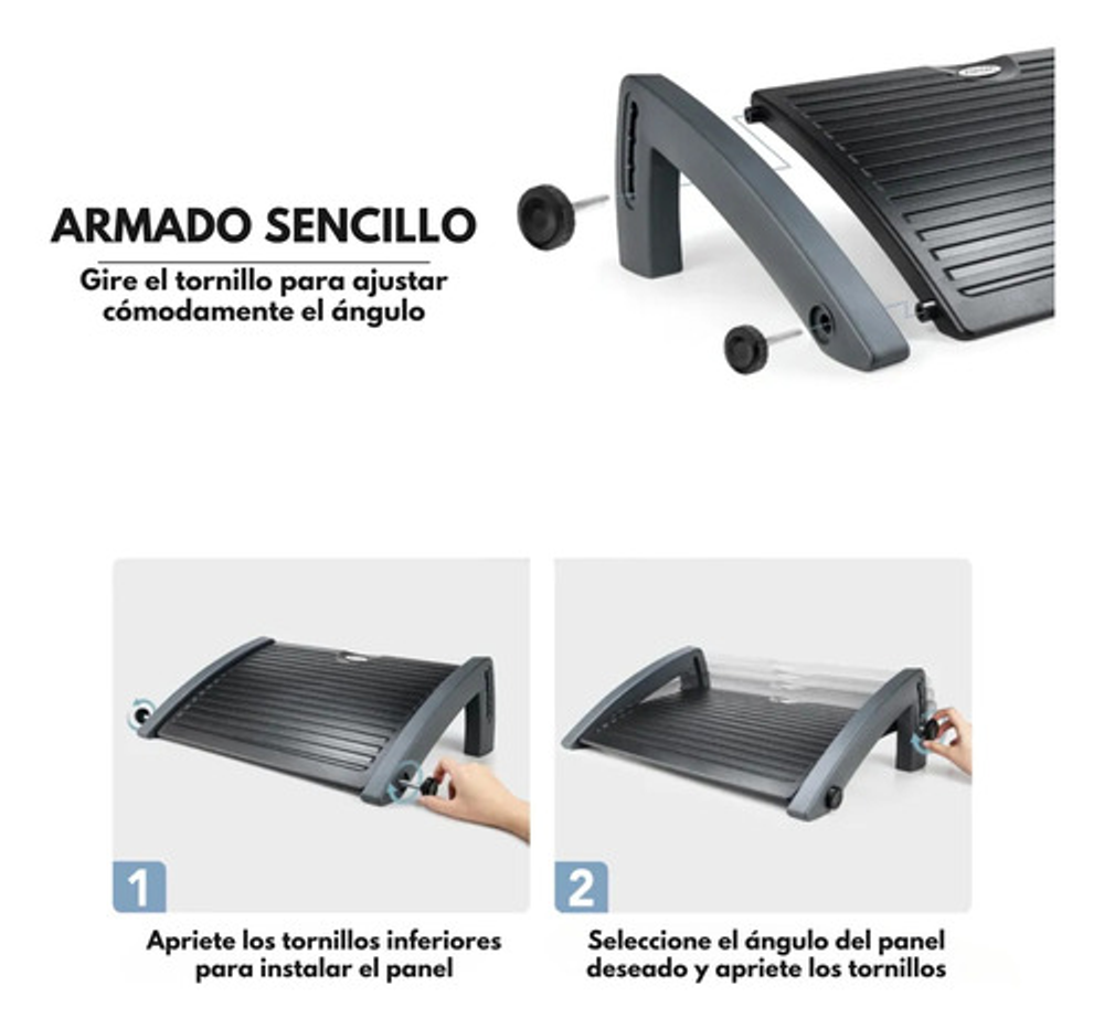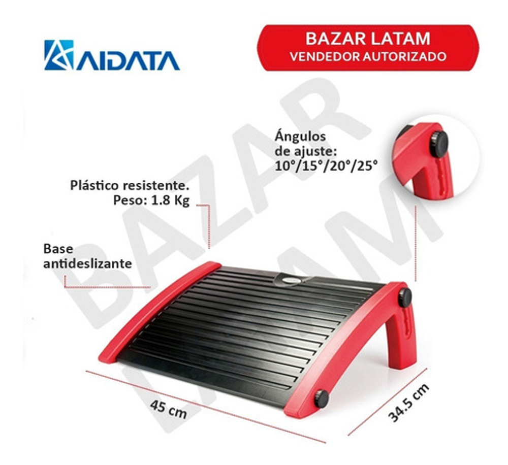 Medidas: 45cm x 34,5cm Ángulo ajustable: 10 ° / 15 ° / 20 ° / 25 ° a través de las perillas. Goma impide que el reposapiés se deslice.