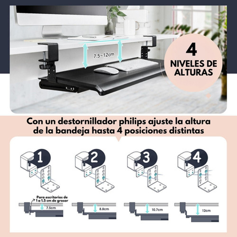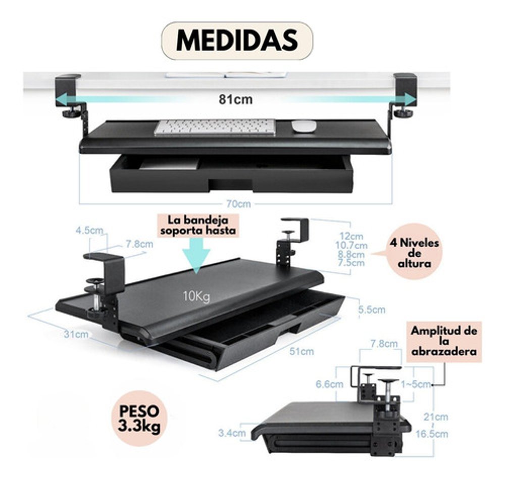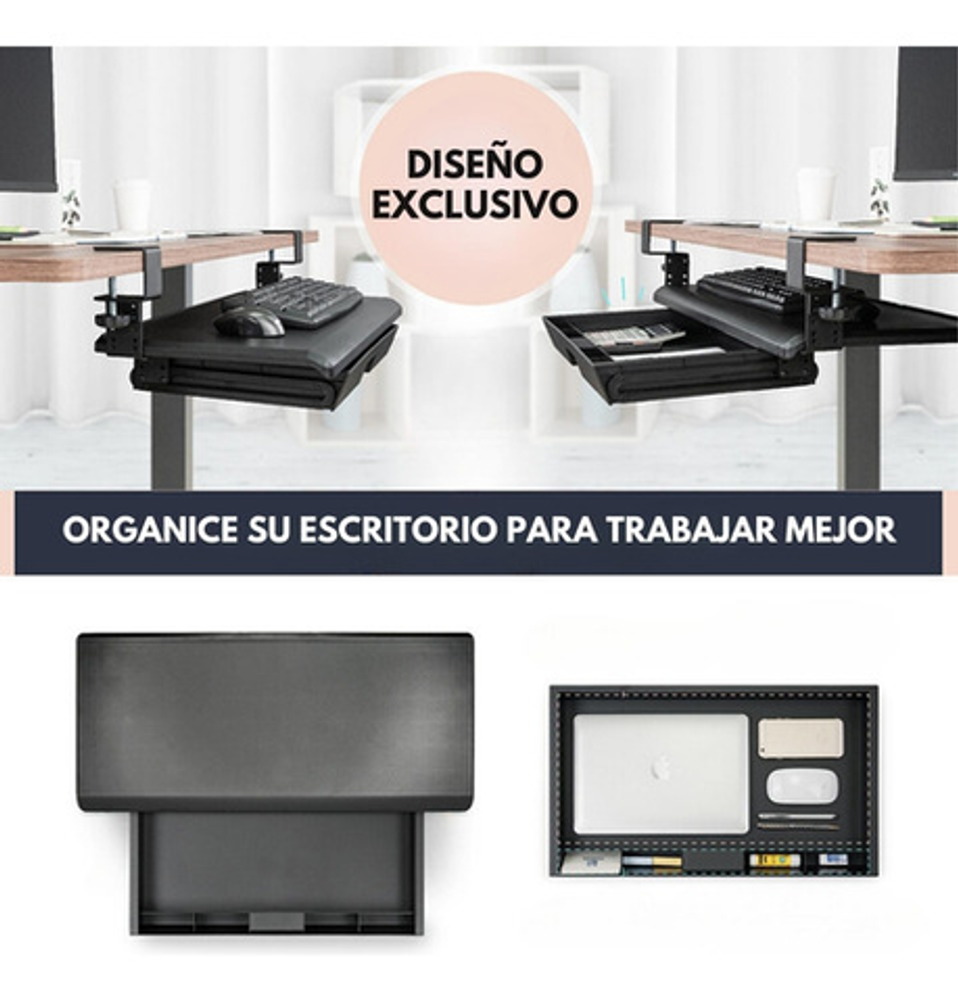 • Fácil Instalación: Se adapta fácilmente a diversos tipos de escritorios, ofreciendo versatilidad en su instalación. • Diseño Ergonómico: Reduce la carga en hombros y cuello, brindando un entorno de trabajo más cómodo. • Riel Deslizante: El teclado se guarda de forma inteligente bajo la mesa, liberando espacio en tu escritorio. • Abrazadera Resistente: La abrazadera de metal en forma de C se monta con facilidad en el borde de tu mesa, garantizando una sujeción segura. • Almacenamiento Inteligente: La cajonera de almacenamiento incorporada ayuda a mantener su escritorio más ordenado y organizado. • Compatibilidad Versátil: Adecuada para escritorios con un grosor de hasta 50 mm. • Nota Importante: No recomendado para bordes de mesa biselados que tengan mas de 3 cm (APTO PARA ESCRITORIOS QUE EL BORDE BISELADO TENGA MENOS DE 3 CM). Asegúrate de medir el grosor del tablero de tu mesa antes de comprar. • Espaciosa: La bandeja tiene 70x31 cm y la cajonera tiene 51x30 cm. • Ajuste de Altura: El teclado se puede ajustar en 4 niveles diferentes según sus preferencias (7.5 cm, 8.8 cm, 10.7 y 12 cm), brindándole una experiencia de trabajo personalizada. • Soporte de Peso: Soporta hasta 10 kg de carga, lo que le permite colocar dispositivos adicionales con confianza. • Hecho en Taiwán: Garantiza calidad y durabilidad.