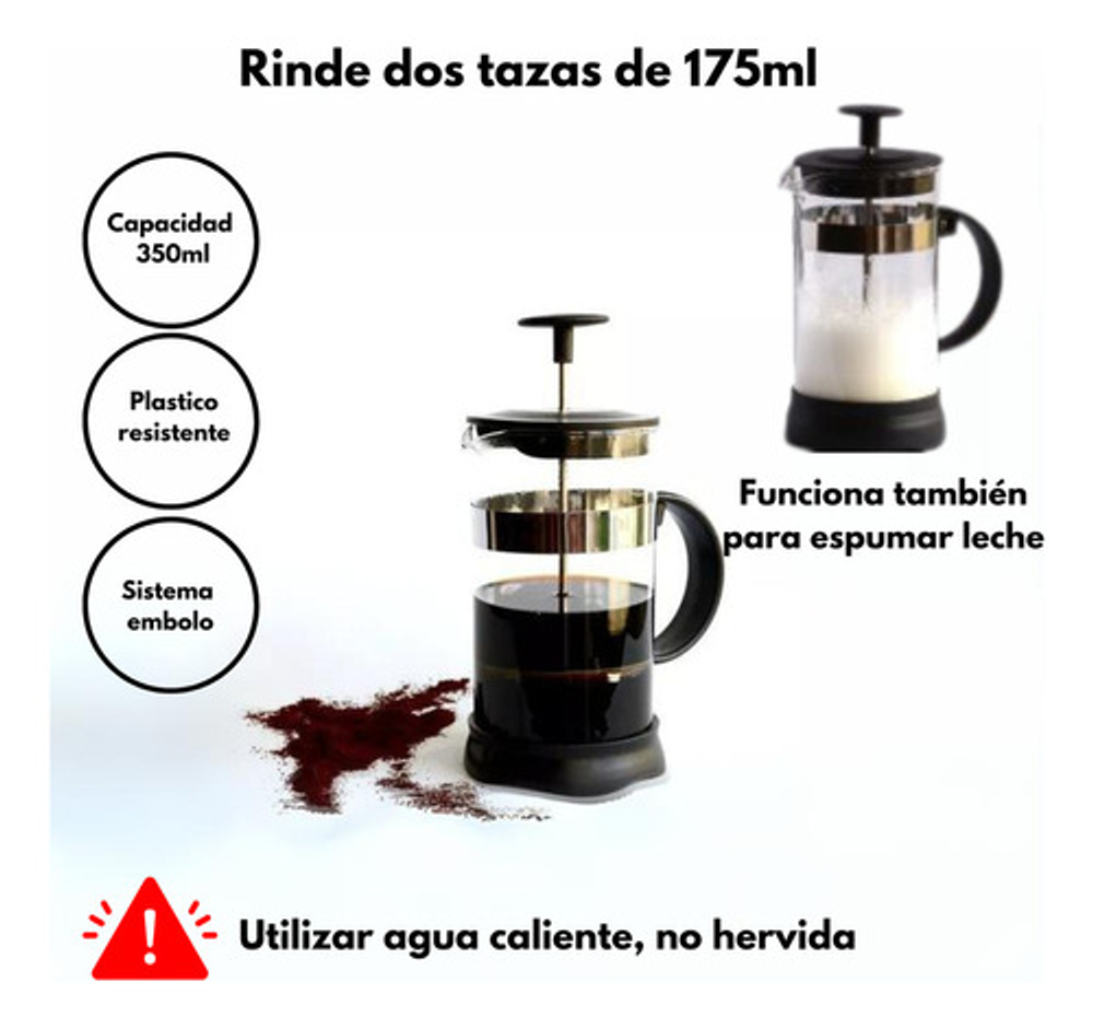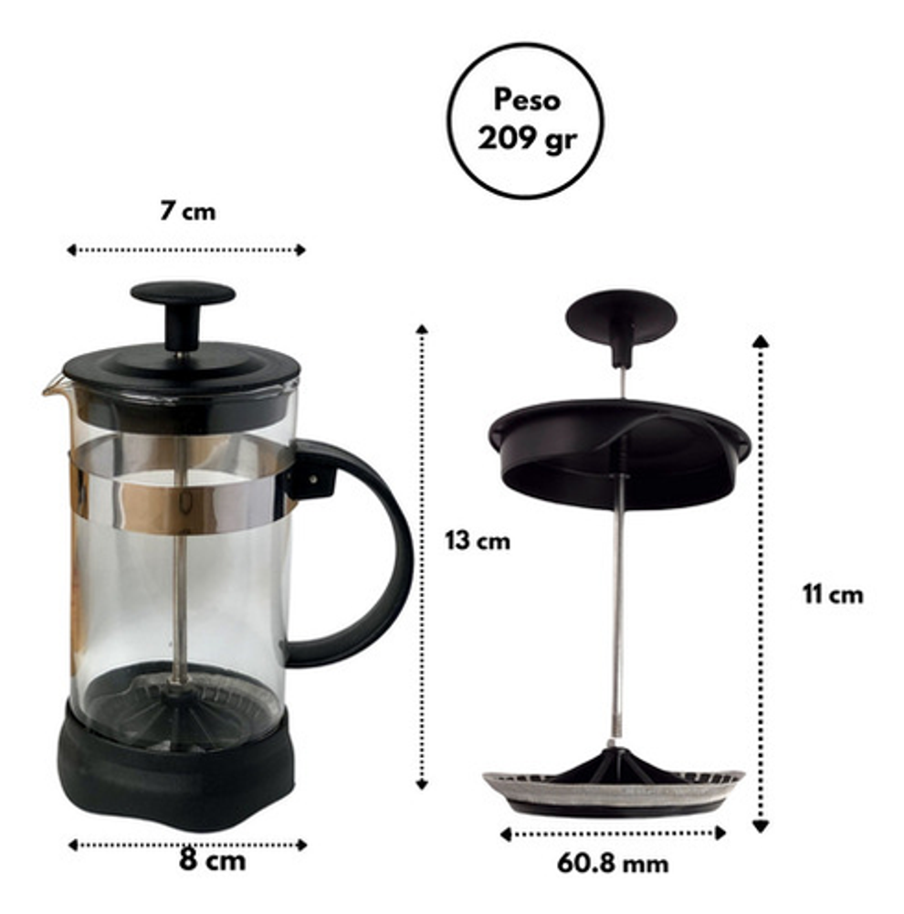 Con una capacidad de 350 ML, es el tamaño perfecto para preparar tu café matutino o para compartir una taza con un amigo. Sus dimensiones son de 7 × 6 × 11 cm y pesa solo 0.2 kg, lo que la hace fácil de manejar y almacenar. El paquete incluye 1 Cafetera Press, lista para ser utilizada y disfrutada.
