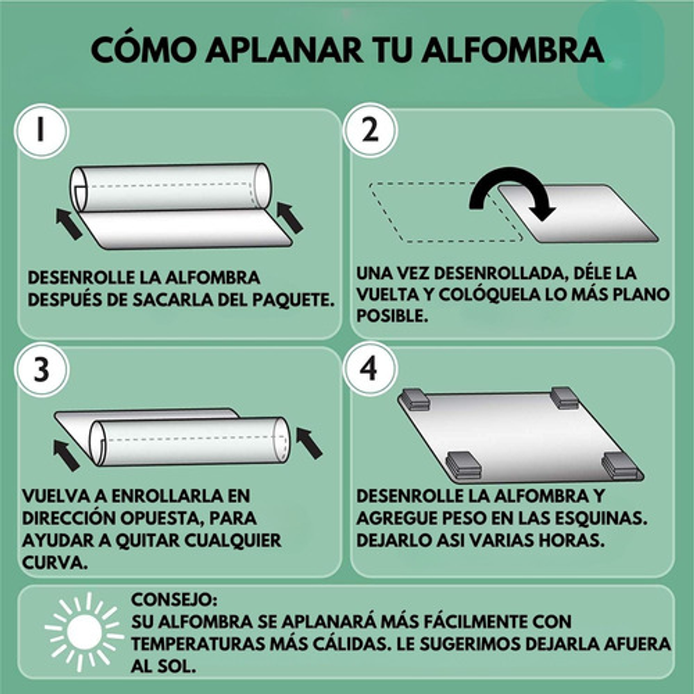 Dado que el producto se enrolló antes de la entrega, es posible que esté desigual cuando lo reciba por primera vez. Coloque un objeto pesado (como una pila de libros) en cada esquina del tapete o en cualquier área curvada para que recupere gradualmente su estado plano. También puede dejarla al sol o utilizar el calor de un secador de pelo para acelerar el aplanamiento.